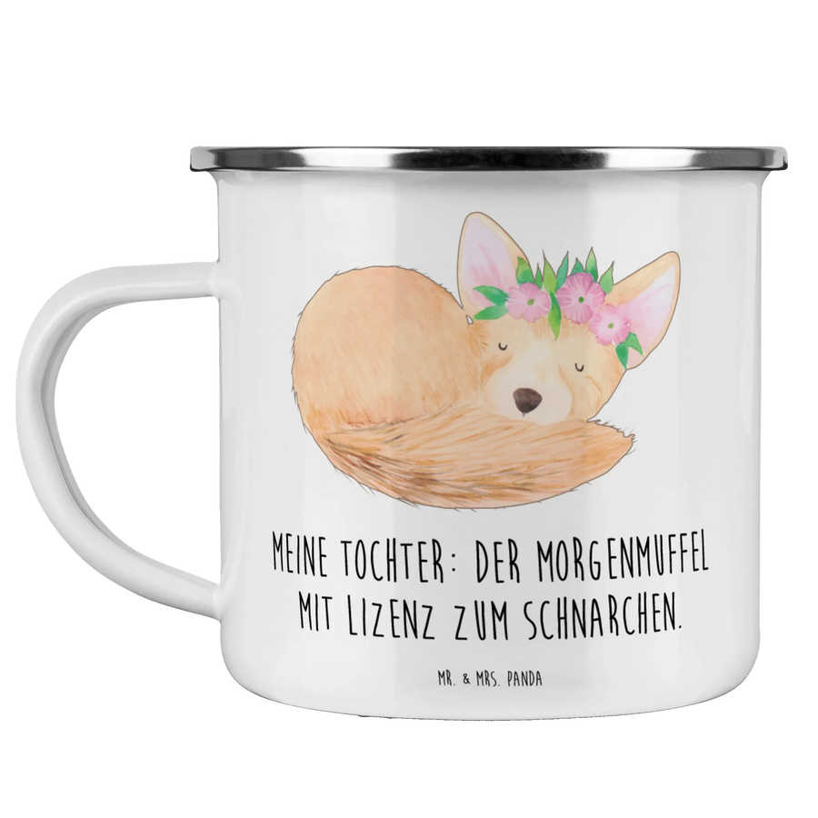 Enamel camping mug Meine Tochter: Der Morgenmuffel mit Lizenz zum Schnarchen. - White