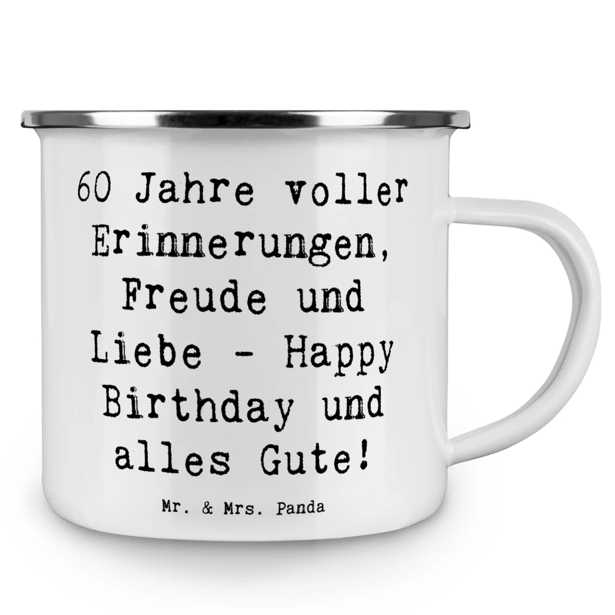Enamel camping mug Saying 60 Jahre voller Erinnerungen, Freude und Liebe - Happy Birthday und alles Gute!