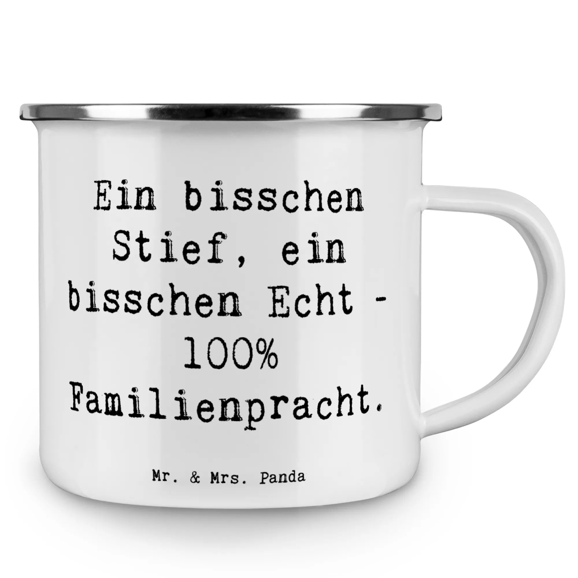 Enamel camping mug Saying Ein bisschen Stief, ein bisschen Echt - 100% Familienpracht.