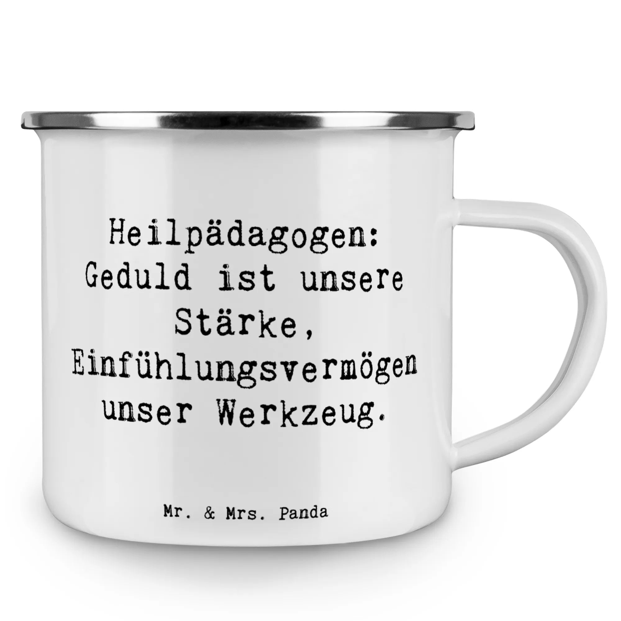 Enamel camping mug Saying Heilpädagogen: Geduld ist unsere Stärke, Einfühlungsvermögen unser Werkzeug.