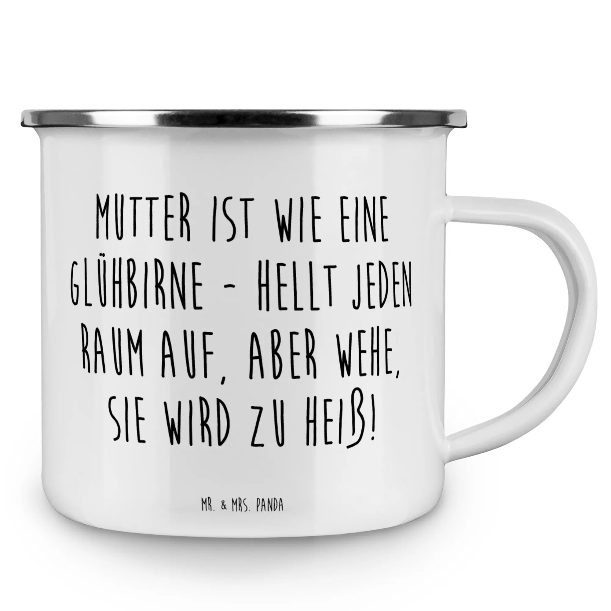 Enamel camping mug Saying Mutter ist wie eine Glühbirne. Sie hellt jeden Raum auf, aber wehe, sie wird zu heiß!