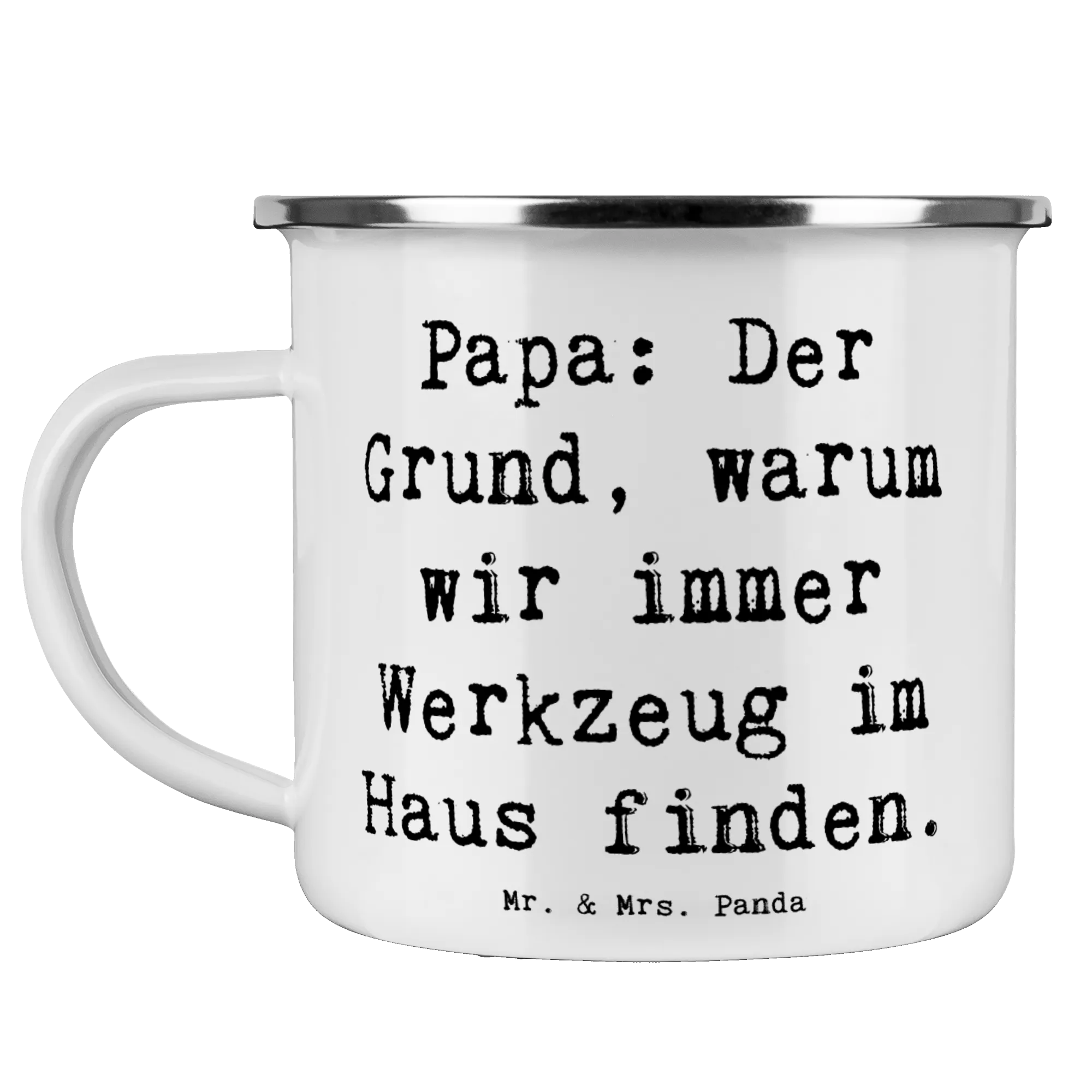 Enamel camping mug Saying Papa: Der Grund, warum wir immer Werkzeug im Haus finden.