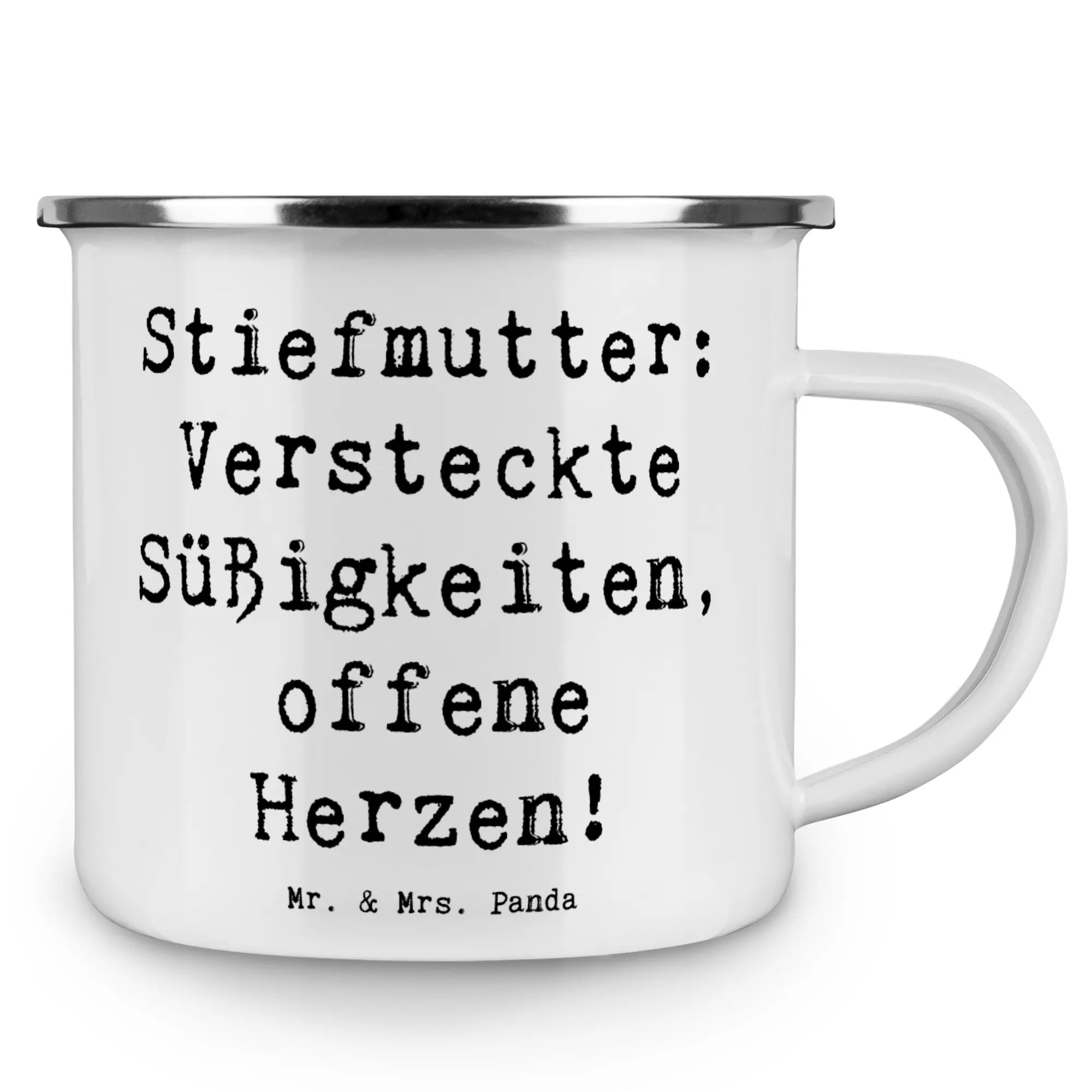 Enamel camping mug Saying Stiefmutter: Versteckte Süßigkeiten, offene Herzen!