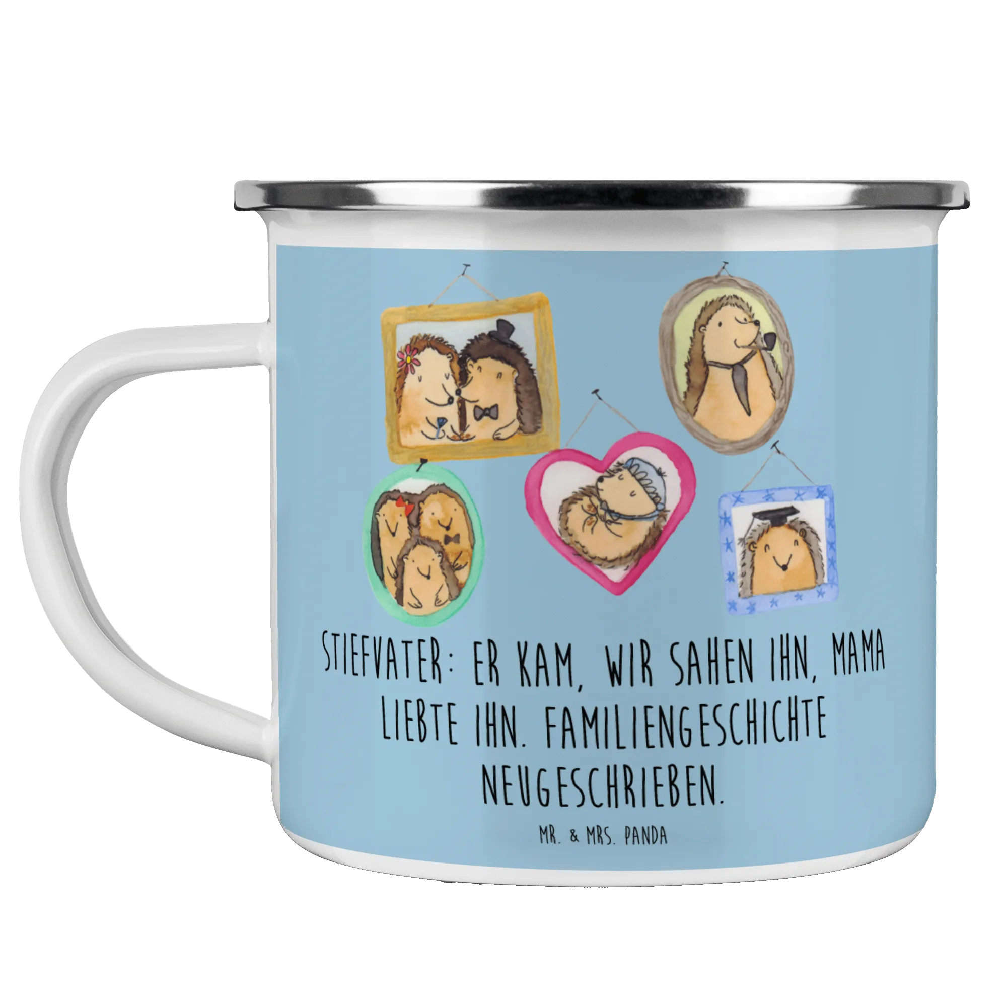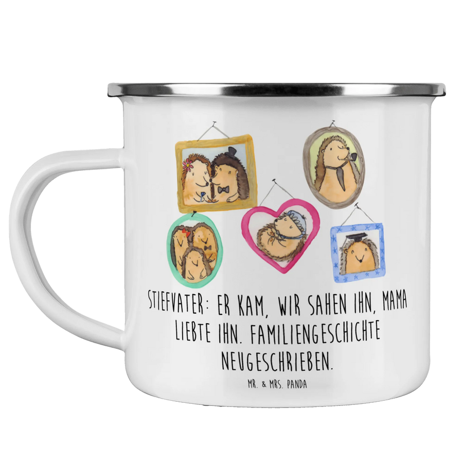 Enamel camping mug Stiefvater: Er kam, wir sahen ihn, Mama liebte ihn. Familiengeschichte neugeschrieben. - White