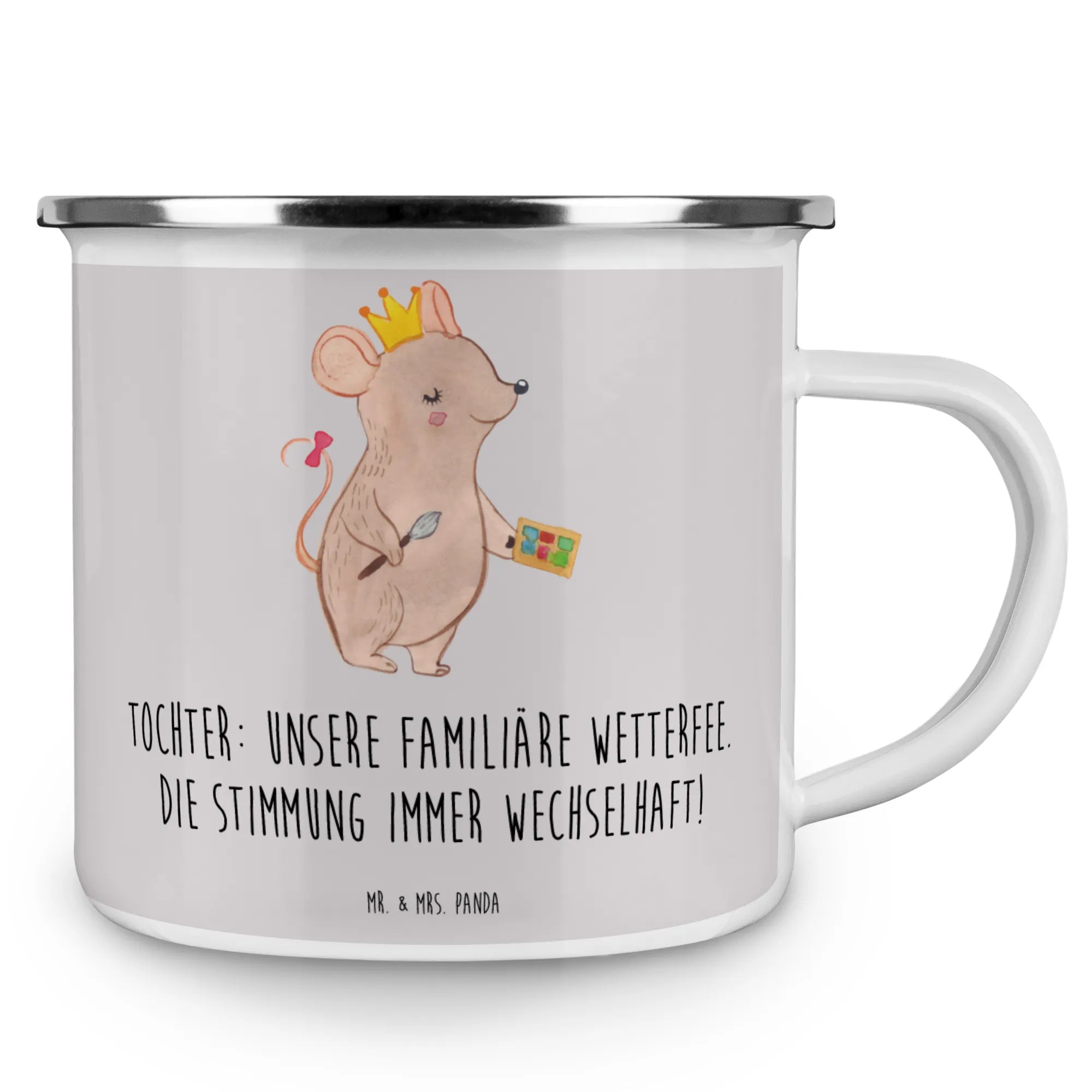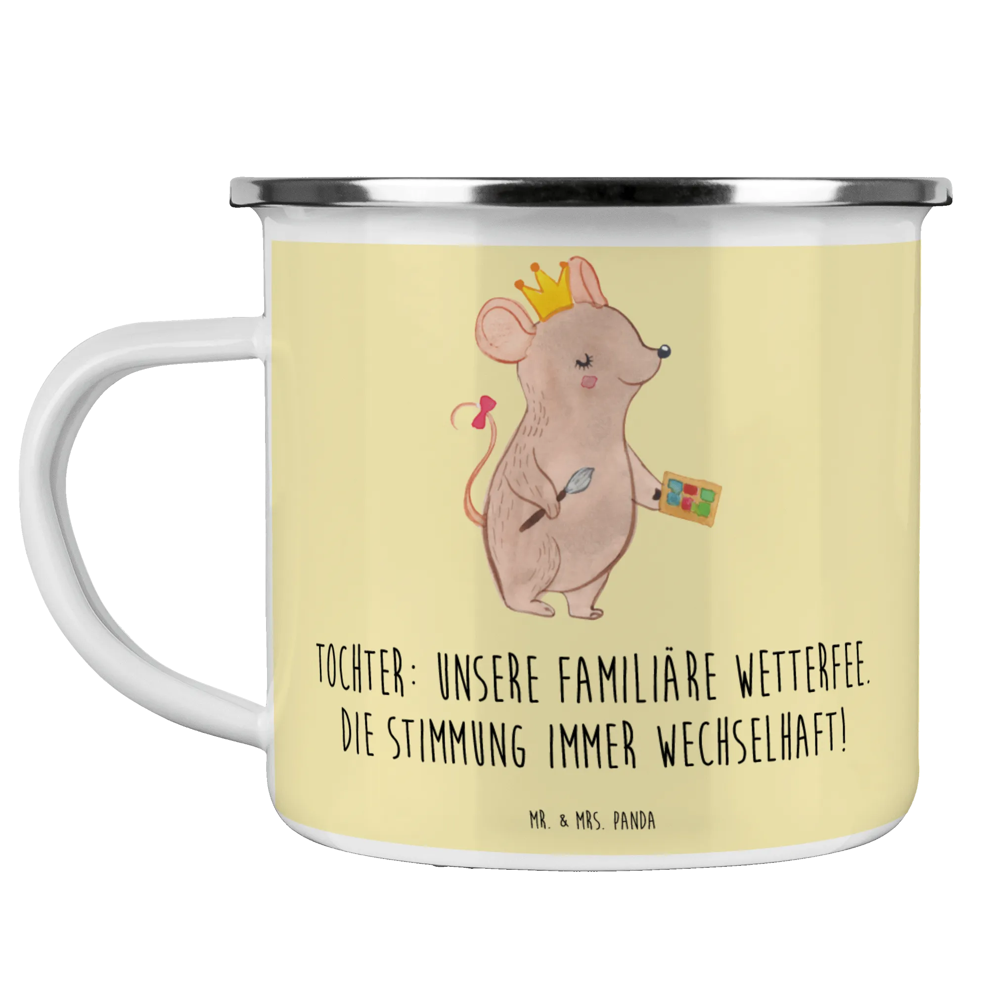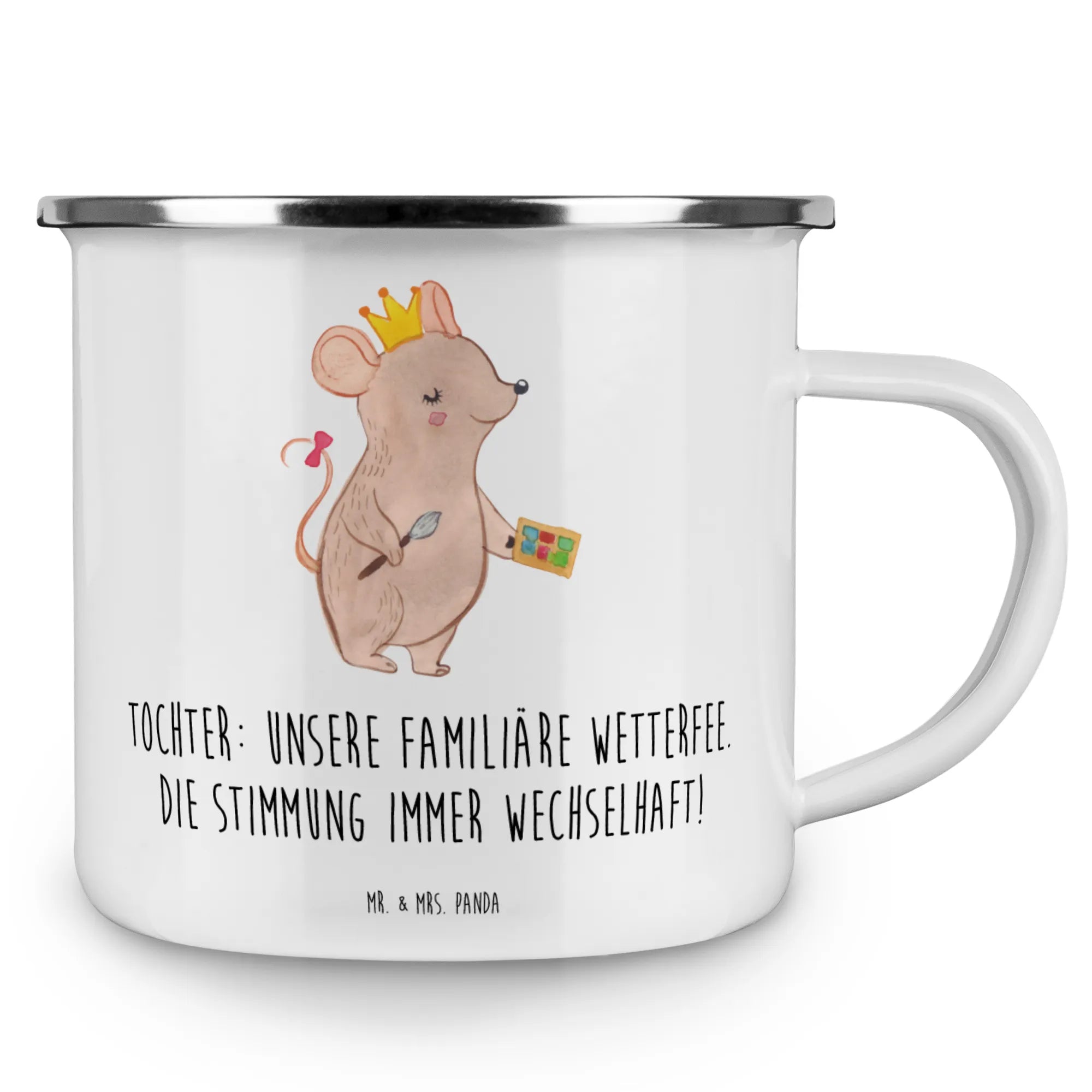 Enamel camping mug Tochter: Unsere familiäre Wetterfee. Die Stimmung immer wechselhaft! - White