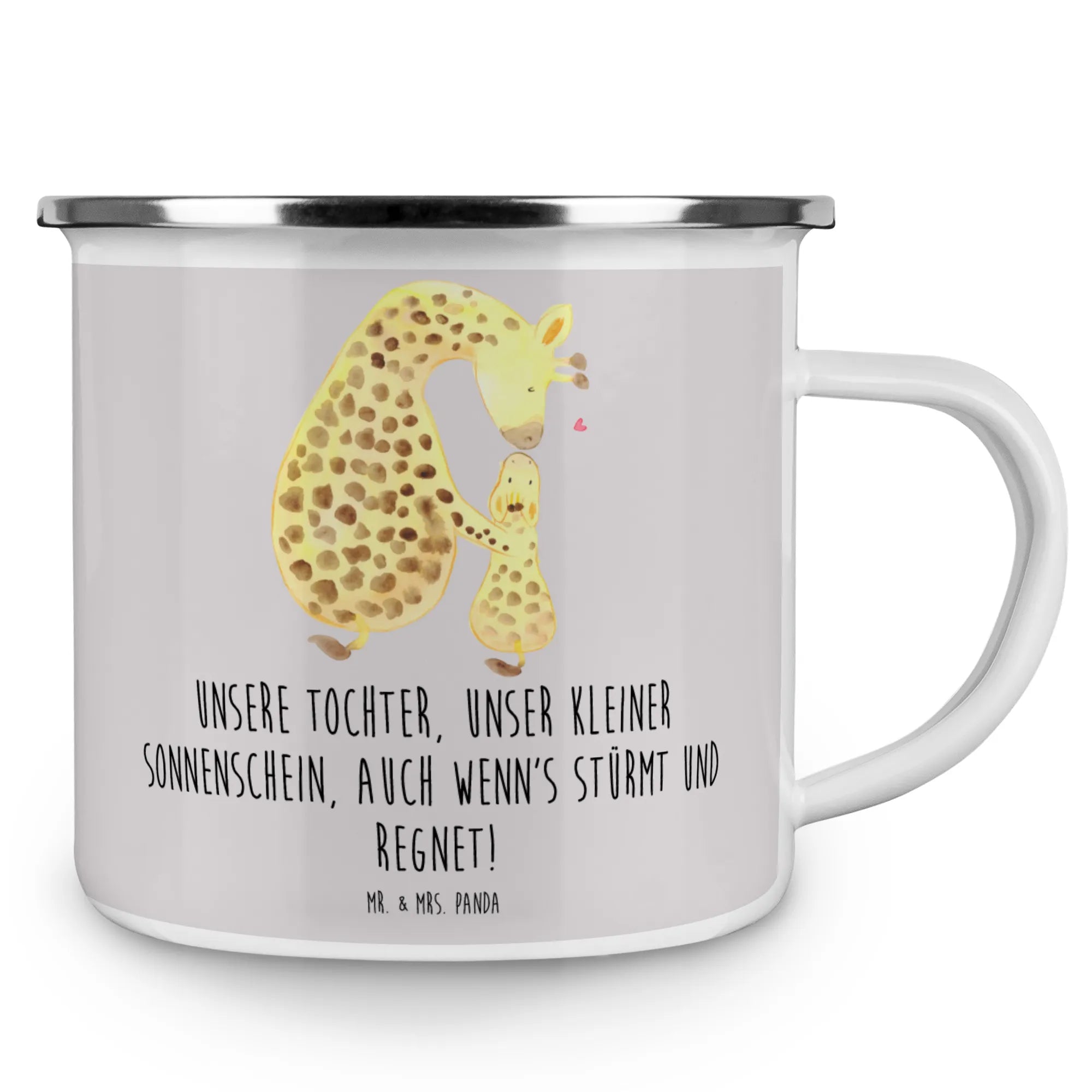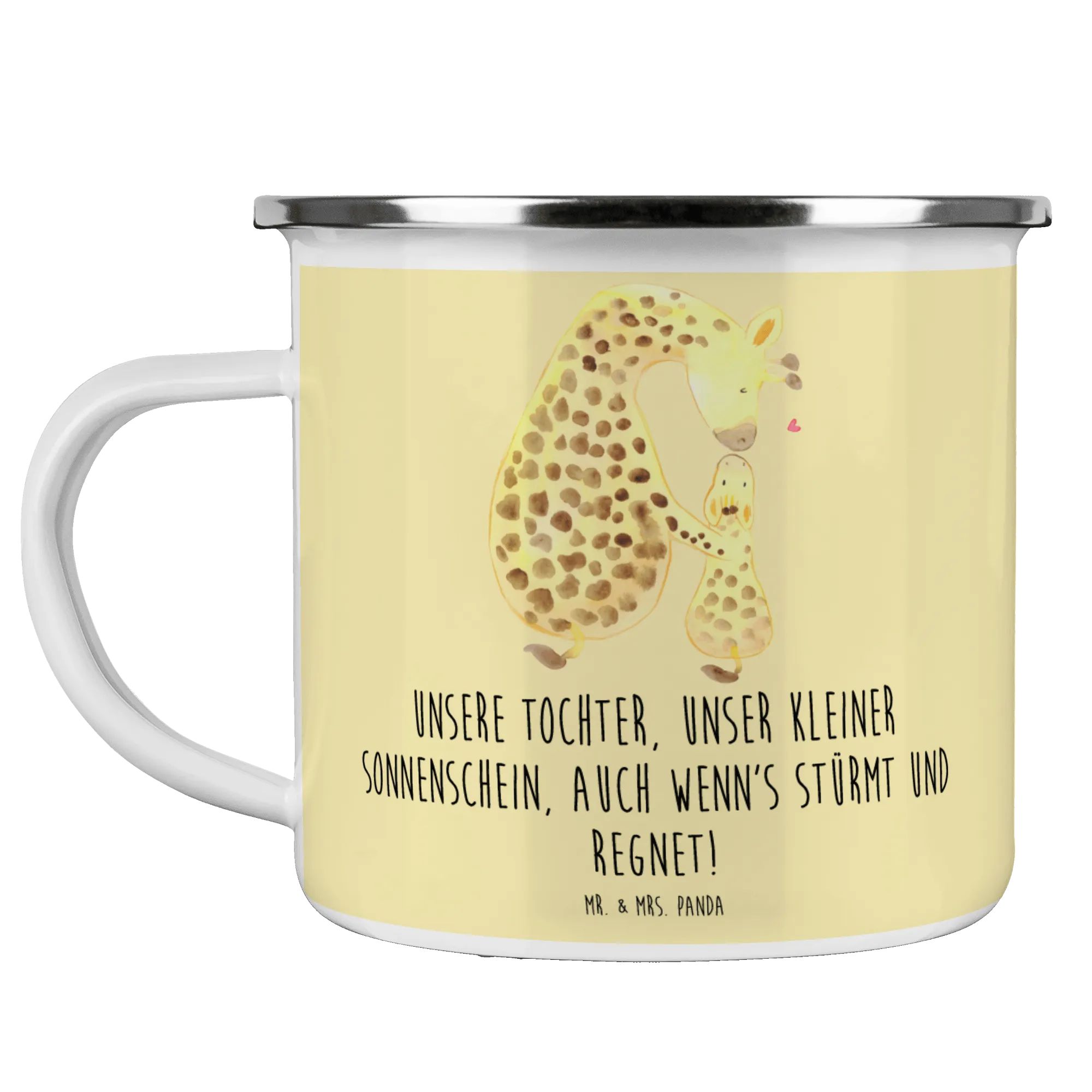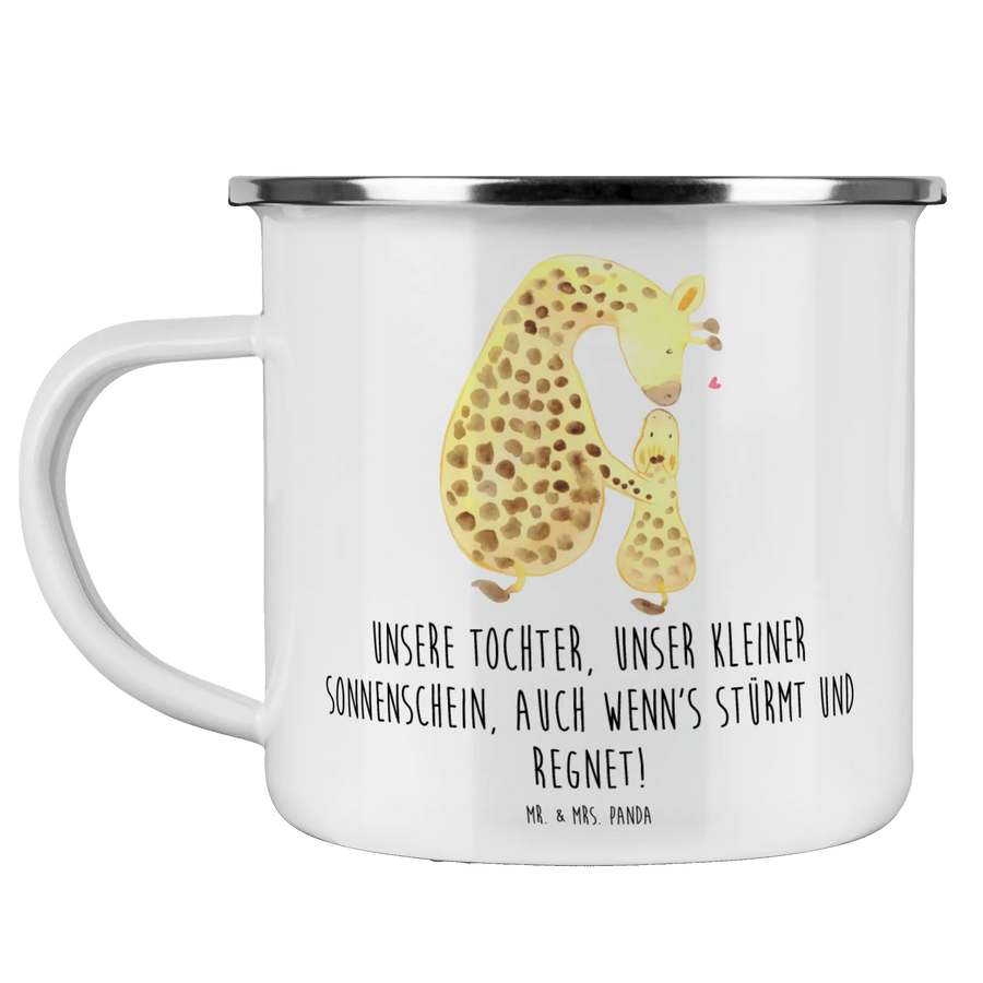 Enamel camping mug Unsere Tochter, unser kleiner Sonnenschein, auch wenn's stürmt und regnet! - White