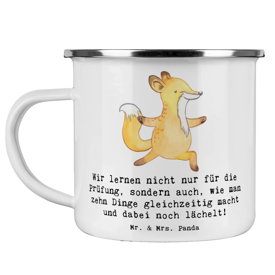 Enamel camping mug Wir lernen nicht nur für die Prüfung, sondern auch, wie man zehn Dinge gleichzeitig macht und dabei noch lächelt! - White