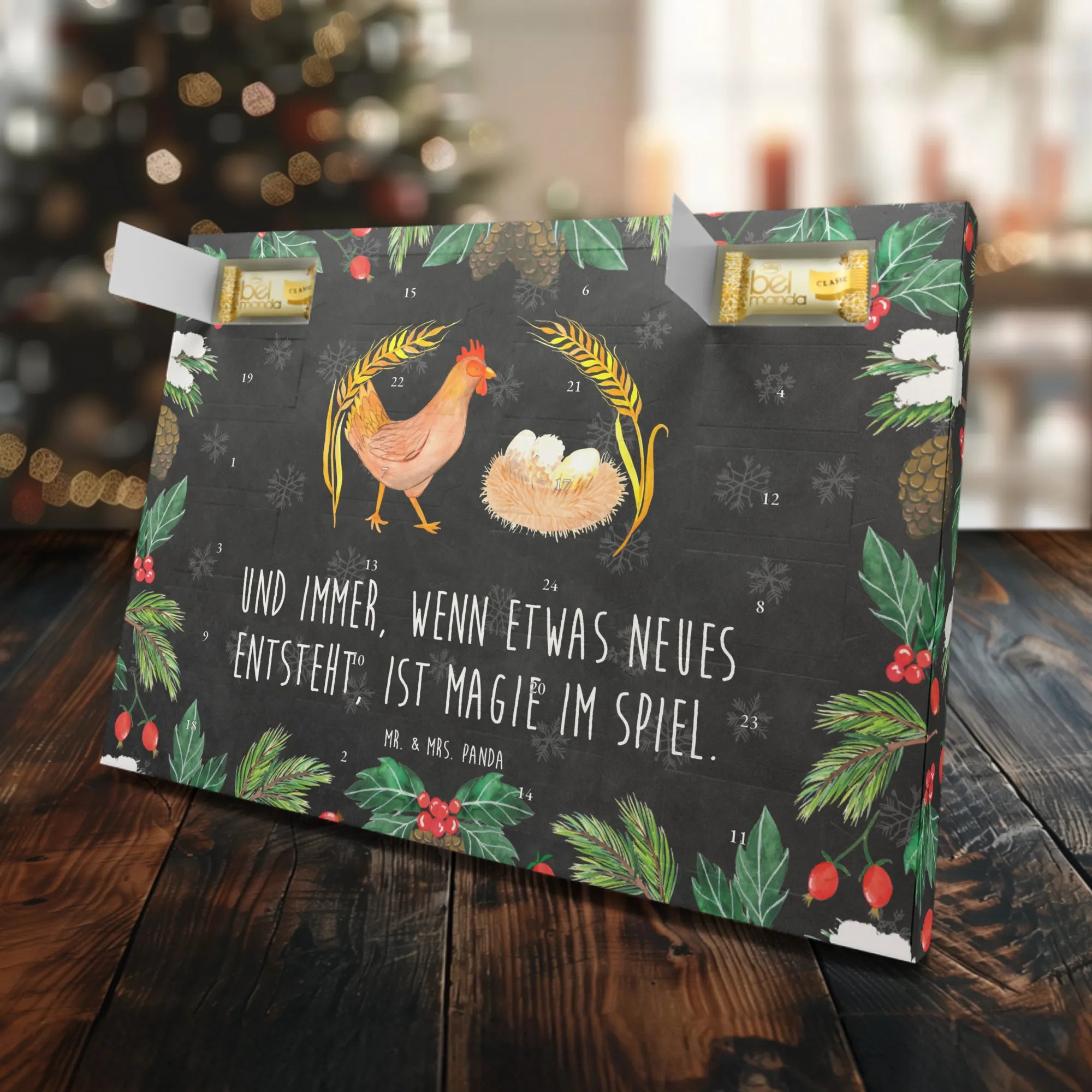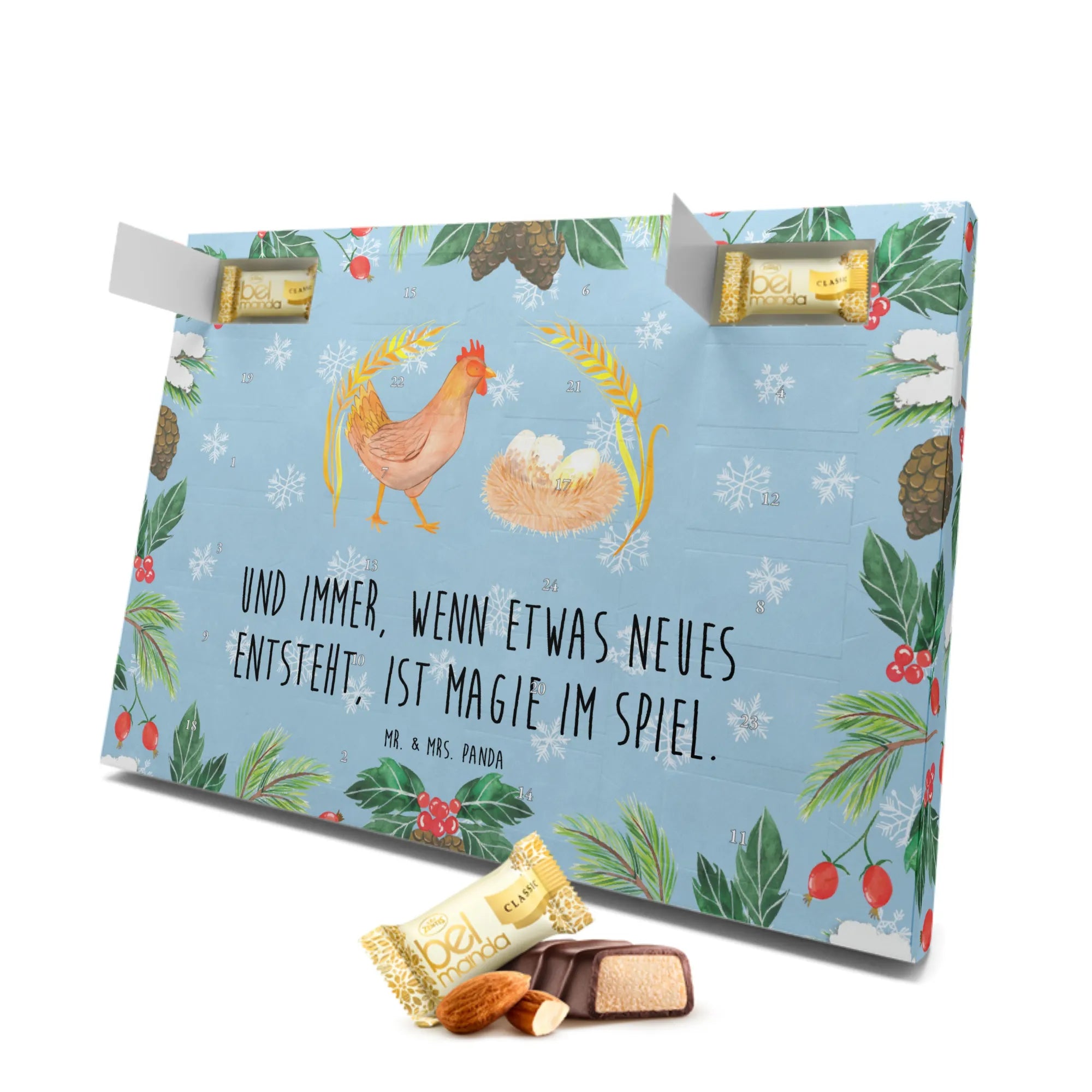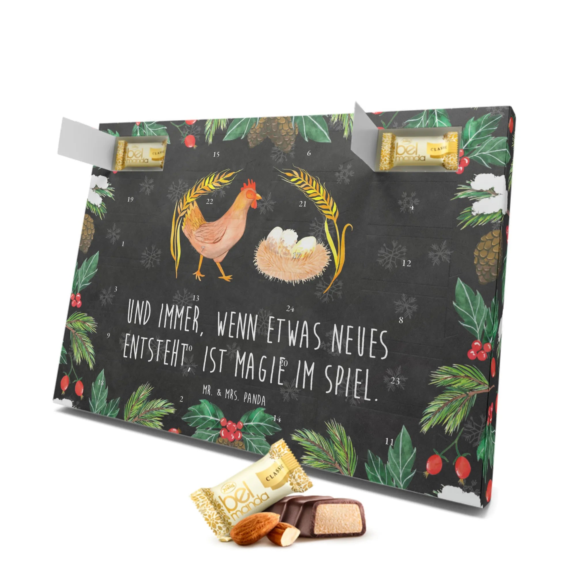 Was könnte schöner sein als ein wunderbarer Adventskalender, der nicht nur die Vorfreude auf Weihnachten steigert, sondern auch den Zauber des Landlebens in dein Zuhause bringt? Der Marzipan Adventskalender mit dem bezaubernden Motiv "Huhn stolz" von Mr. & Mrs. Panda ist genau das richtige Geschenk für alle, die das Landleben und die süßen Hoftiere lieben!