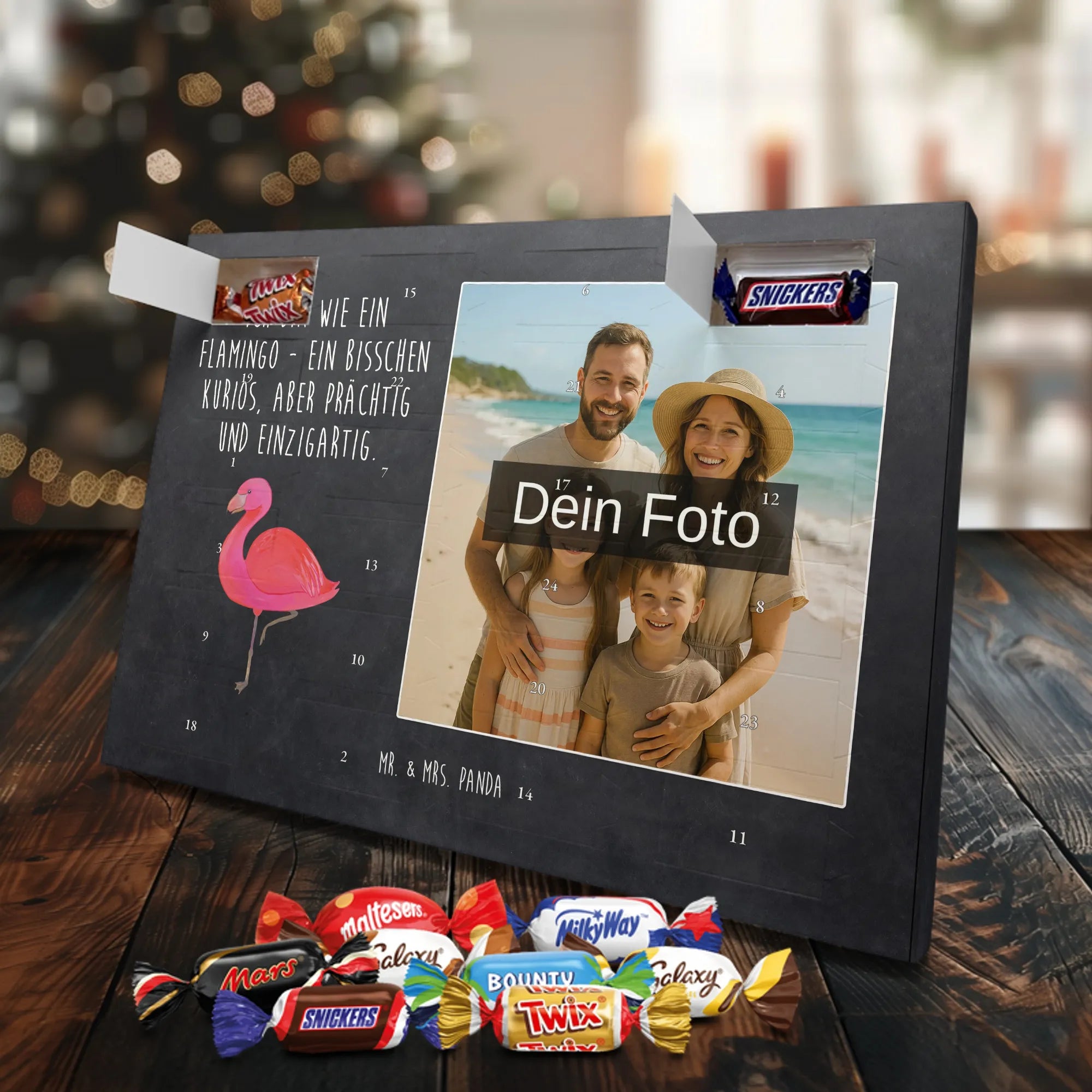 Lustiger Personalisierter Schoko Foto-Adventskalender – das Must-have für eine persönliche Adventszeit von Mr. & Mrs. Panda. Jeder Kalender wird mit unseren charmanten Illustrationen und liebevollen Sprüchen bedruckt, während dein Foto die Vorderseite einzigartig macht. Achte bitte darauf, ein Foto mit guter Qualität und ausreichend hoher Auflösung hochzuladen, damit der Druck gestochen scharf wirkt. Überprüfe den Bildausschnitt, damit wichtige Bereiche nicht verloren gehen. Denk daran, nur Bilder zu verwenden, bei denen du die nötigen Rechte besitzt. Die Verarbeitung ist hochwertig: brillante Druckqualität mit seidenmatter Oberflächenveredelung und bedruckten Seitenflächen. Maße: 325 mm x 225 mm x 27 mm. Du kannst den Kalender aufhängen oder aufstellen – sehr praktisch. Hinweis: Die hochgeladenen Fotos werden nicht nachbearbeitet oder zugeschnitten; Rücknahme bei personalisierten Foto-Artikeln ist ausgeschlossen. Gefüllt ist der Kalender mit Celebrations Schokolade – 24 Stück in 8 verschiedenen Sorten (Maltesers, Mars, Snickers, Twix, Milky Way, Bounty, Galaxy, Galaxy Caramel). Verschenke ein Stück persönlich gestaltete Vorfreude und mache jeden Dezembertag zu etwas Besonderem.