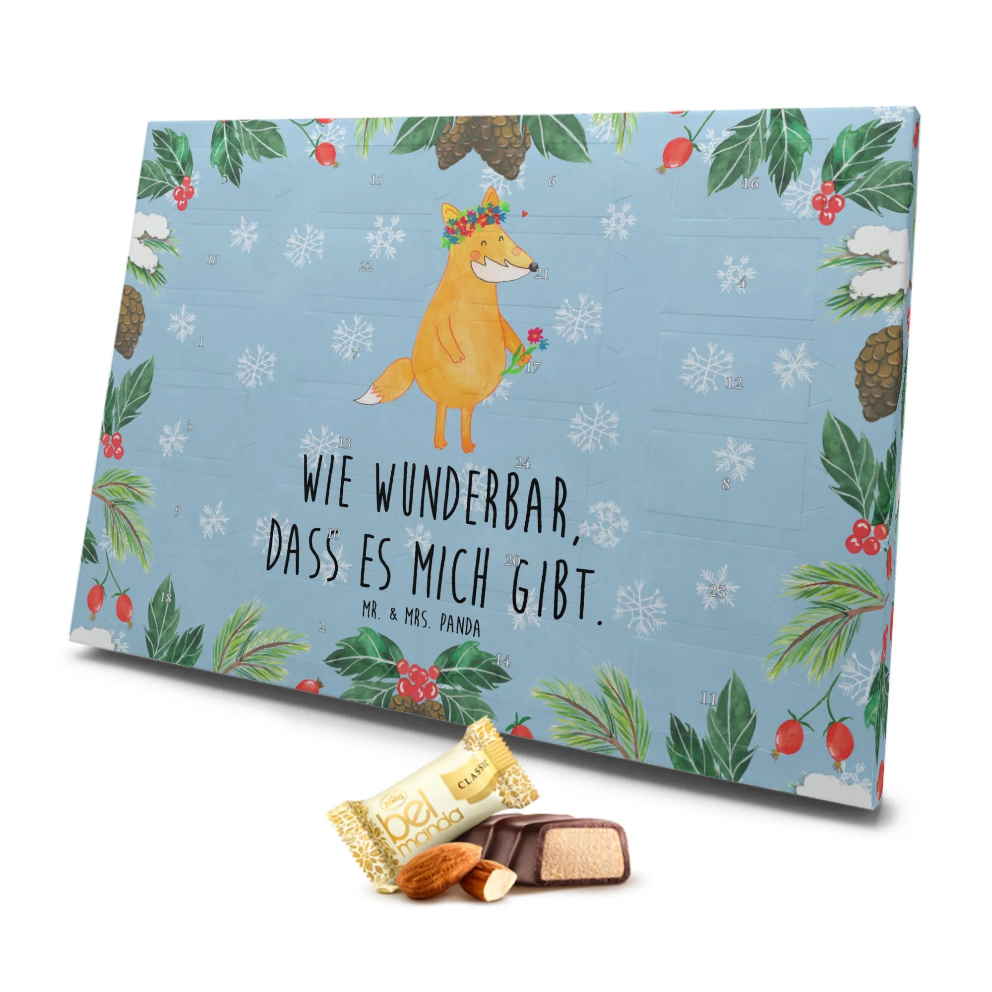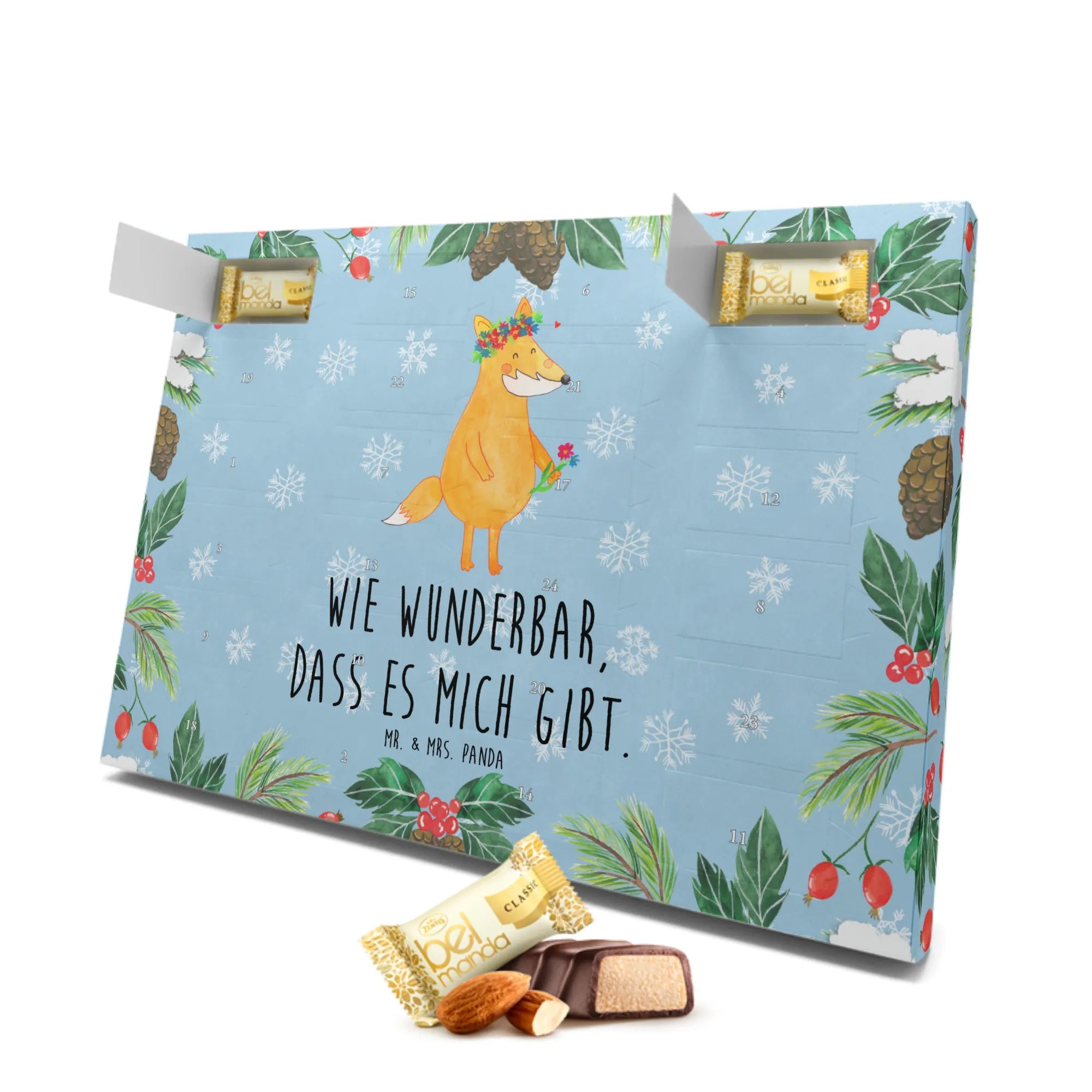 Der Marzipan Adventskalender "Fuchs Blumenliebe" von Mr. & Mrs. Panda ist das perfekte Geschenk für alle, die die Schönheit der Natur und die Farbenpracht der Blumen lieben! 🌸 Mit seinem zauberhaften Motiv eines niedlichen Fuchses, der sich mit bunten Blumen schmückt, bringt dieser Adventskalender Freude und Zauber in die vorweihnachtliche Zeit.