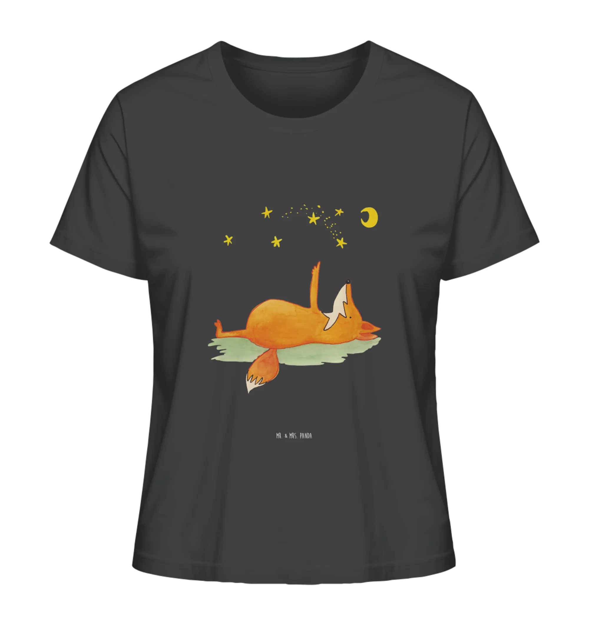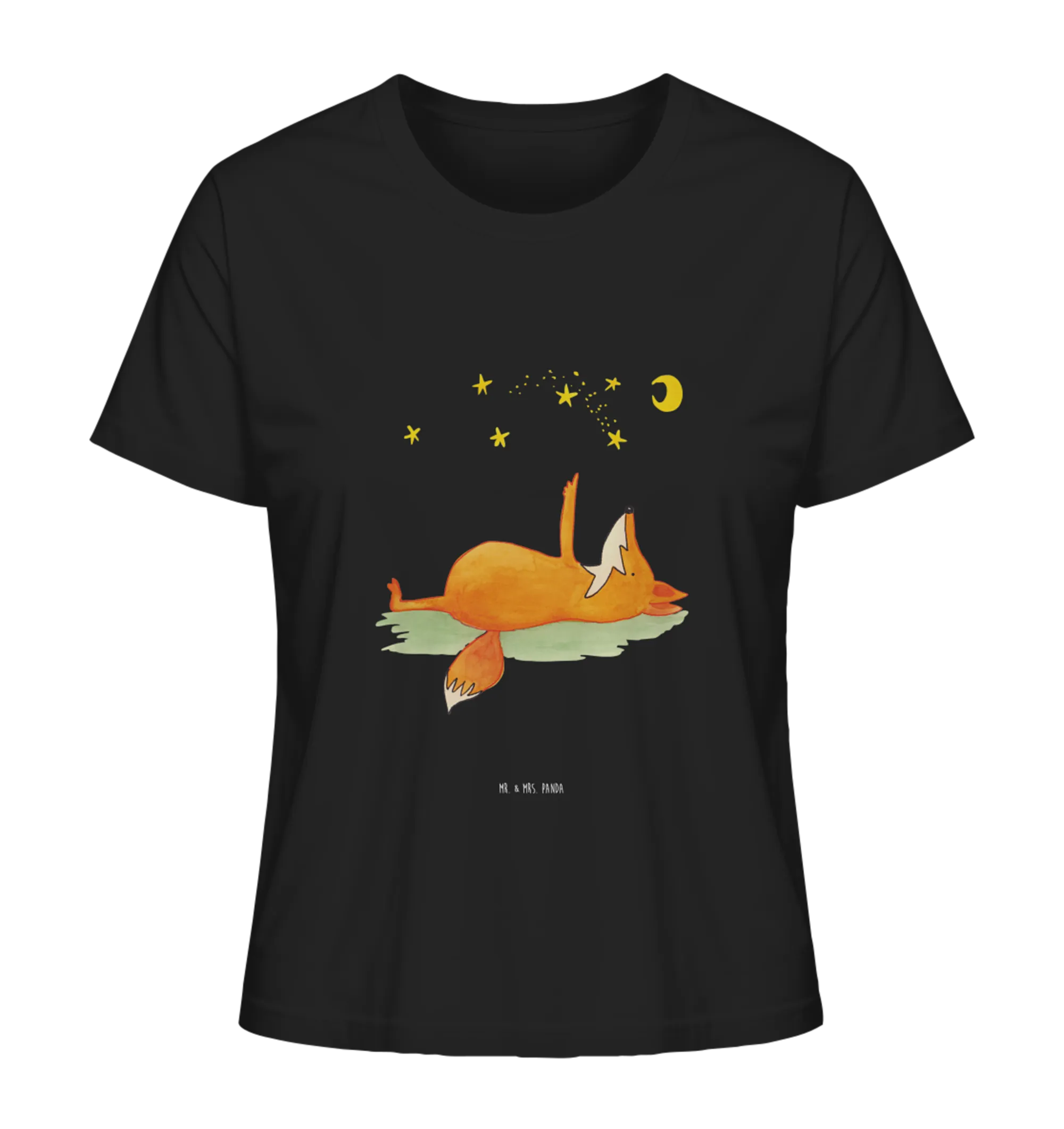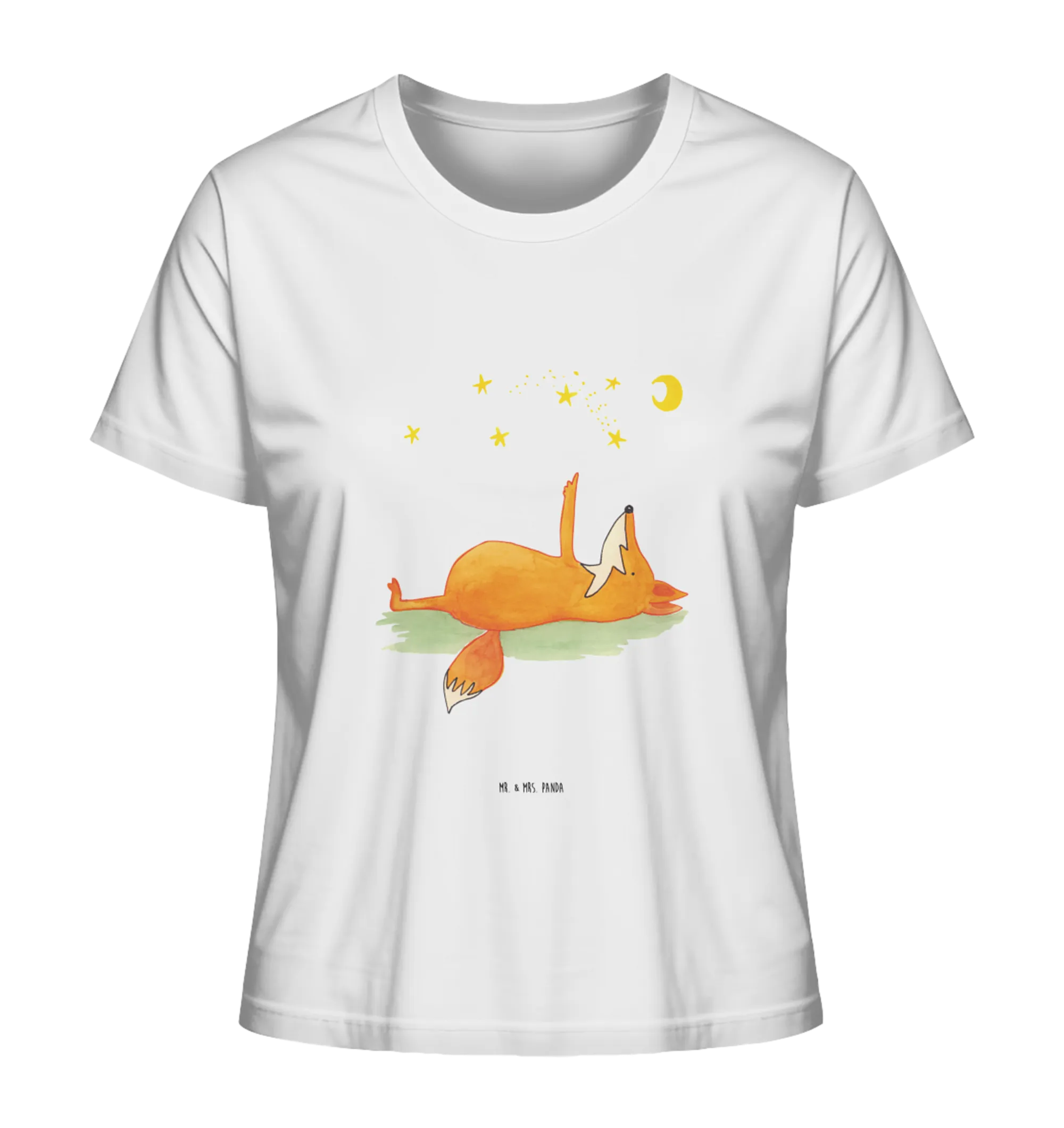 Mit unserem liebevoll gestalteten Damenshirt bringst du ein Stück Sternenhimmel in deinen Alltag. Das süße Fuchs Motiv zeigt einen verträumten Fuchs, der auf dem Rücken liegt und begeistert zu den Sternen schaut. Ein Design, das zum Träumen einlädt und gleichzeitig ein hübsches Basic T-Shirt Damen für viele Looks ist. 🌟