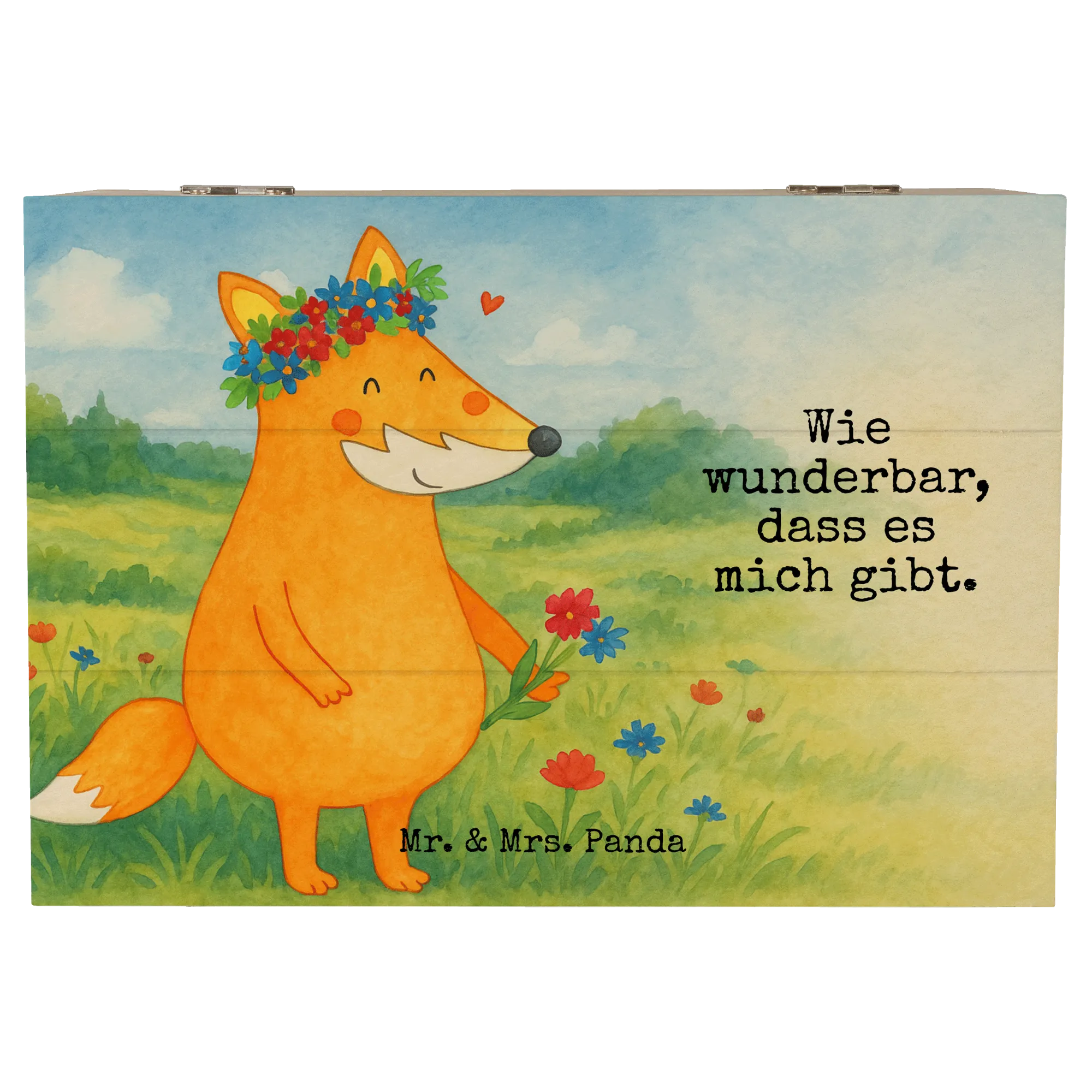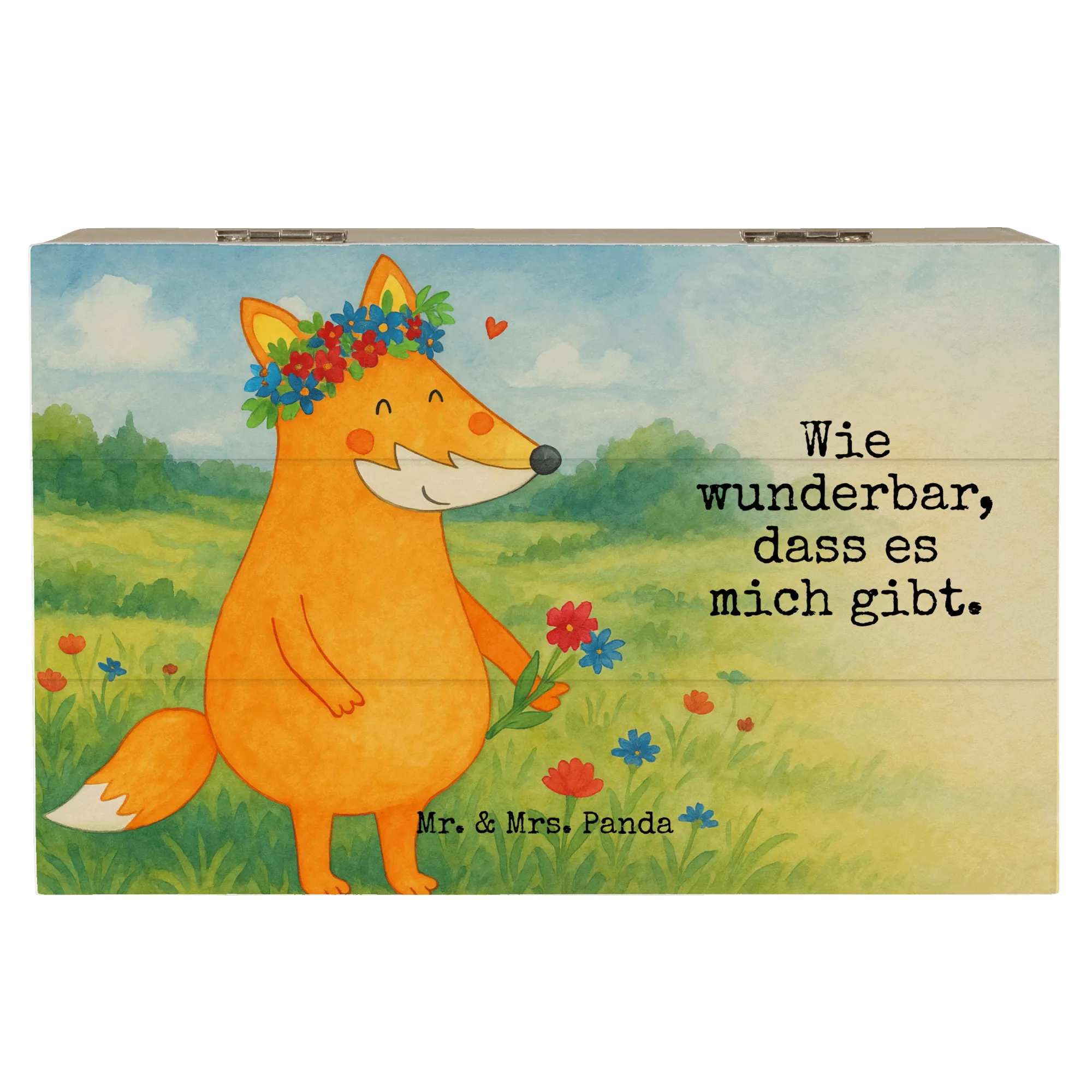 Hol Dir ein Stück Mr. & Mrs. Panda Magie nach Hause oder verschenke eine Stimmung, die von Herzen kommt. Die Holzkiste Fuchs Blumenliebe ist ein kleines Kunstwerk, das Deine wertvollsten Erinnerungen stilvoll bewahrt.