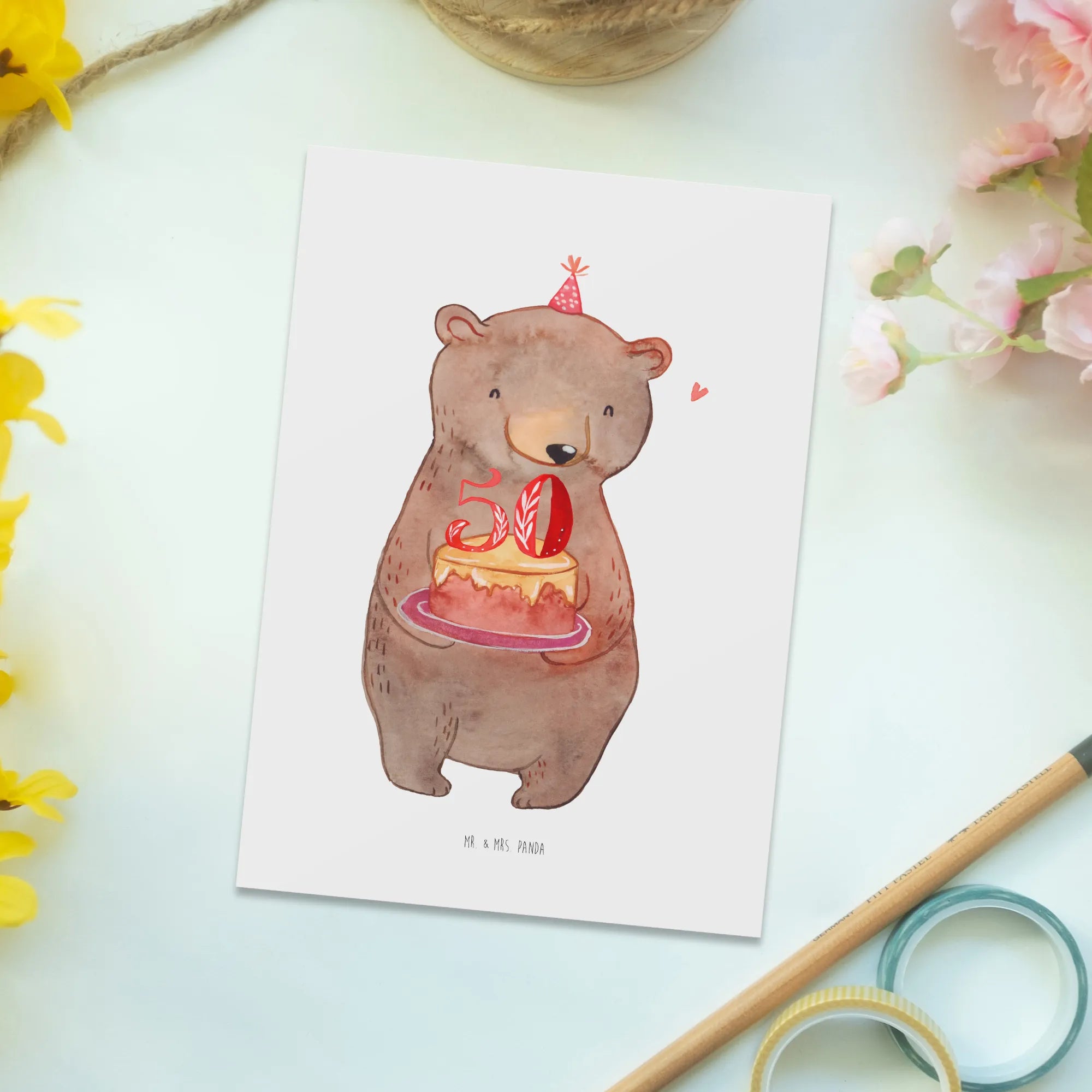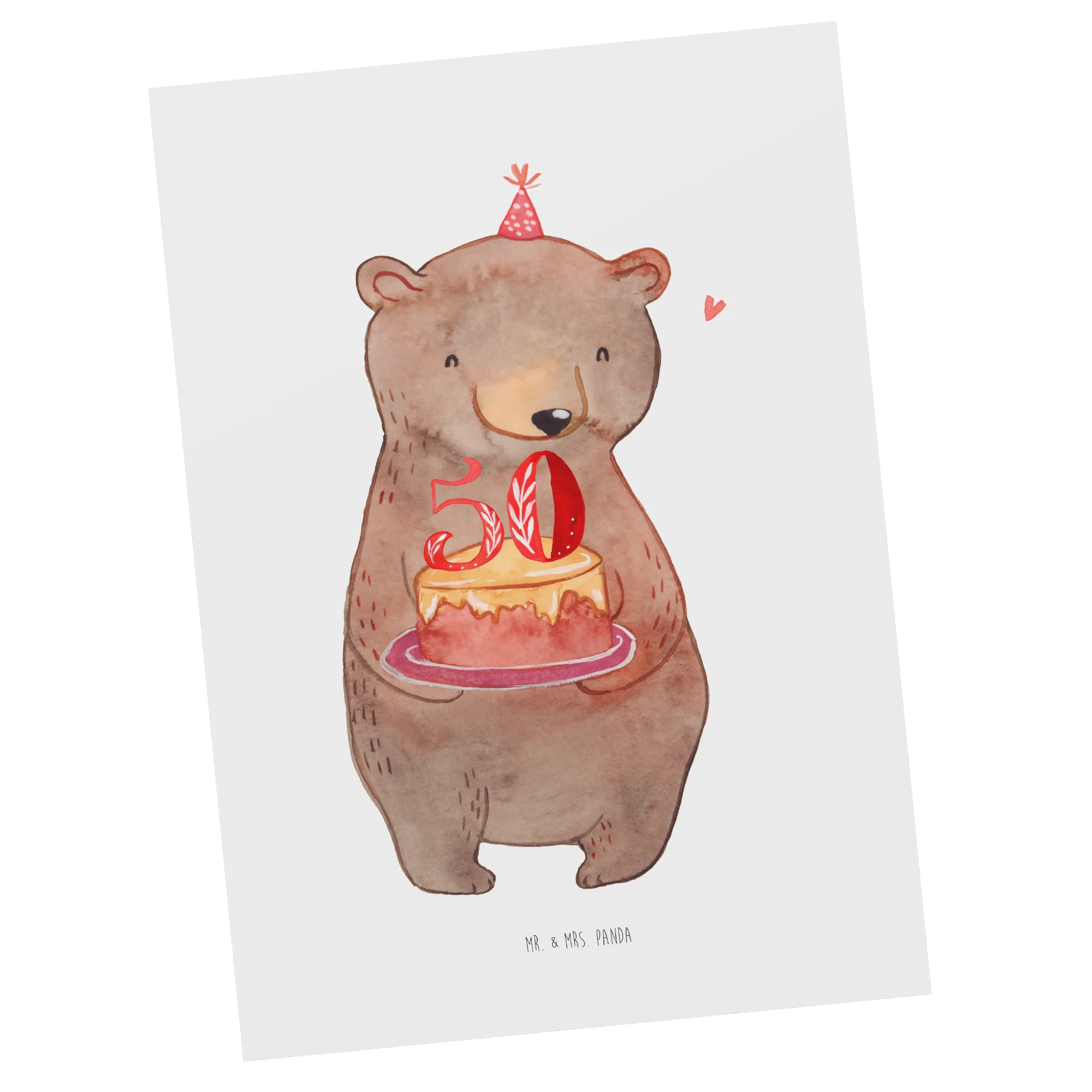 Celebrating a 50th birthday is a big deal! It’s a moment to reflect on all the amazing years gone by and to look forward to the wonderful adventures that still lie ahead. To make this occasion even more special, why not surprise your loved ones with a postcard that not only conveys your heartfelt birthday wishes but also stands out from the typical store-bought cards? Our bear, donned in a festive party hat and holding a delicious cake, is the perfect representative of the celebration spirit!