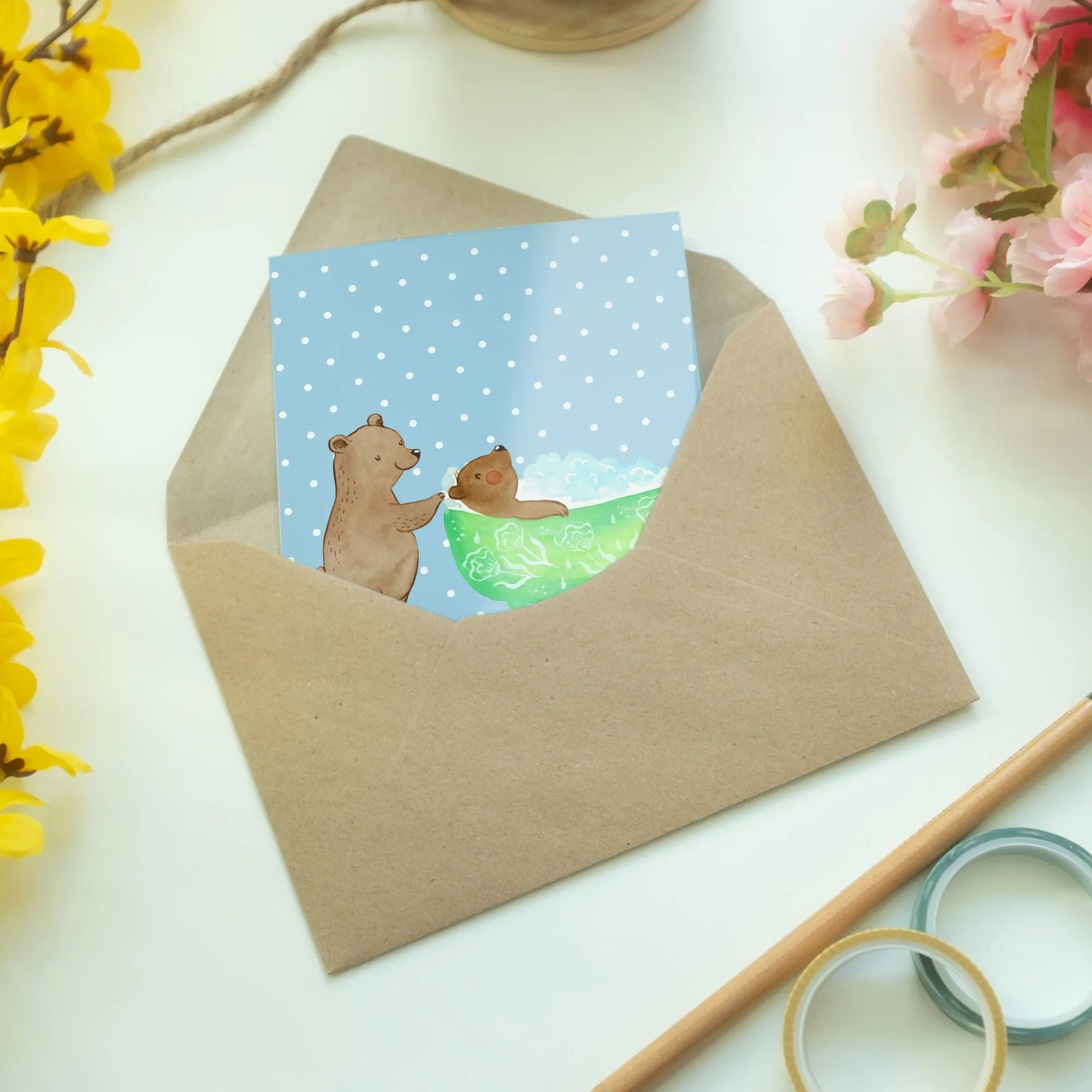 With its adorable illustration of two bears in a loving scene—one helping the other take a bubbly bath—this card captures the essence of family care and affection. You can almost feel the warmth and coziness exuded from this delightful image!