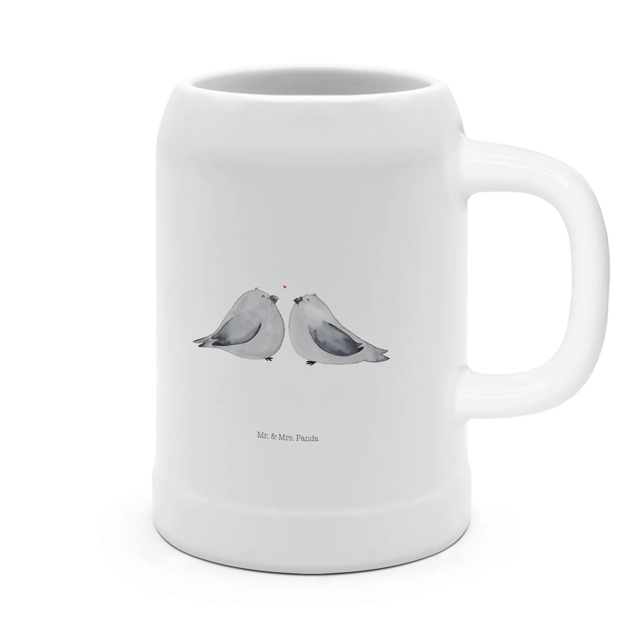 Crafted from robust stoneware, this 500ml beer mug is both durable and stylish, ensuring that it can withstand any celebratory toast or cozy evening at home. The enchanting motif depicts two stylized turtledoves in soft gray and white hues. They lovingly lean toward each other, with a small red heart floating between their beaks, symbolizing the deep affection they share. It's a charming illustration that perfectly encapsulates the essence of love.