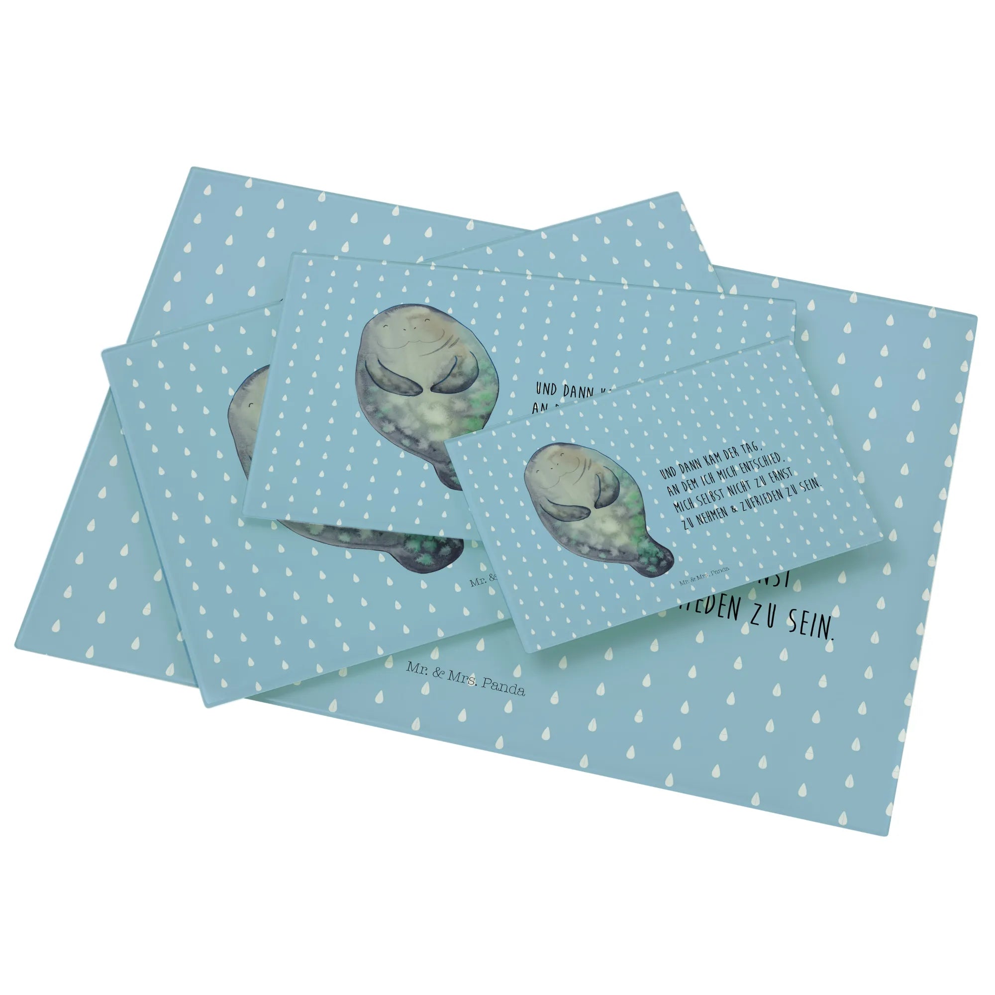 Crafted from premium, scratch-resistant glass, this chopping board is designed for durability and long-lasting use. The charming illustration of the manatee captures the essence of living life in harmony with nature and oneself. With soft, serene colors predominantly in shades of blue and gray, highlighted with hints of green, this board is not only practical but also a beautiful piece of art for your kitchen.