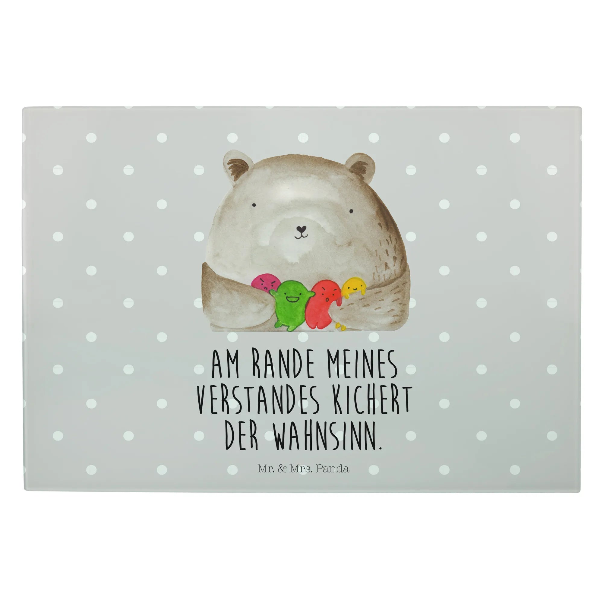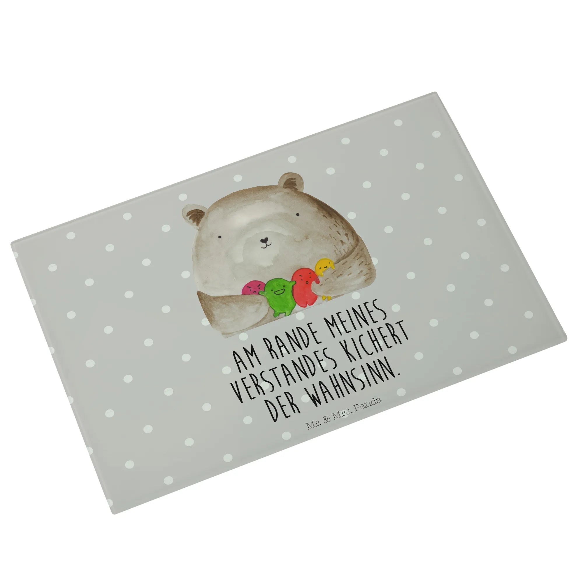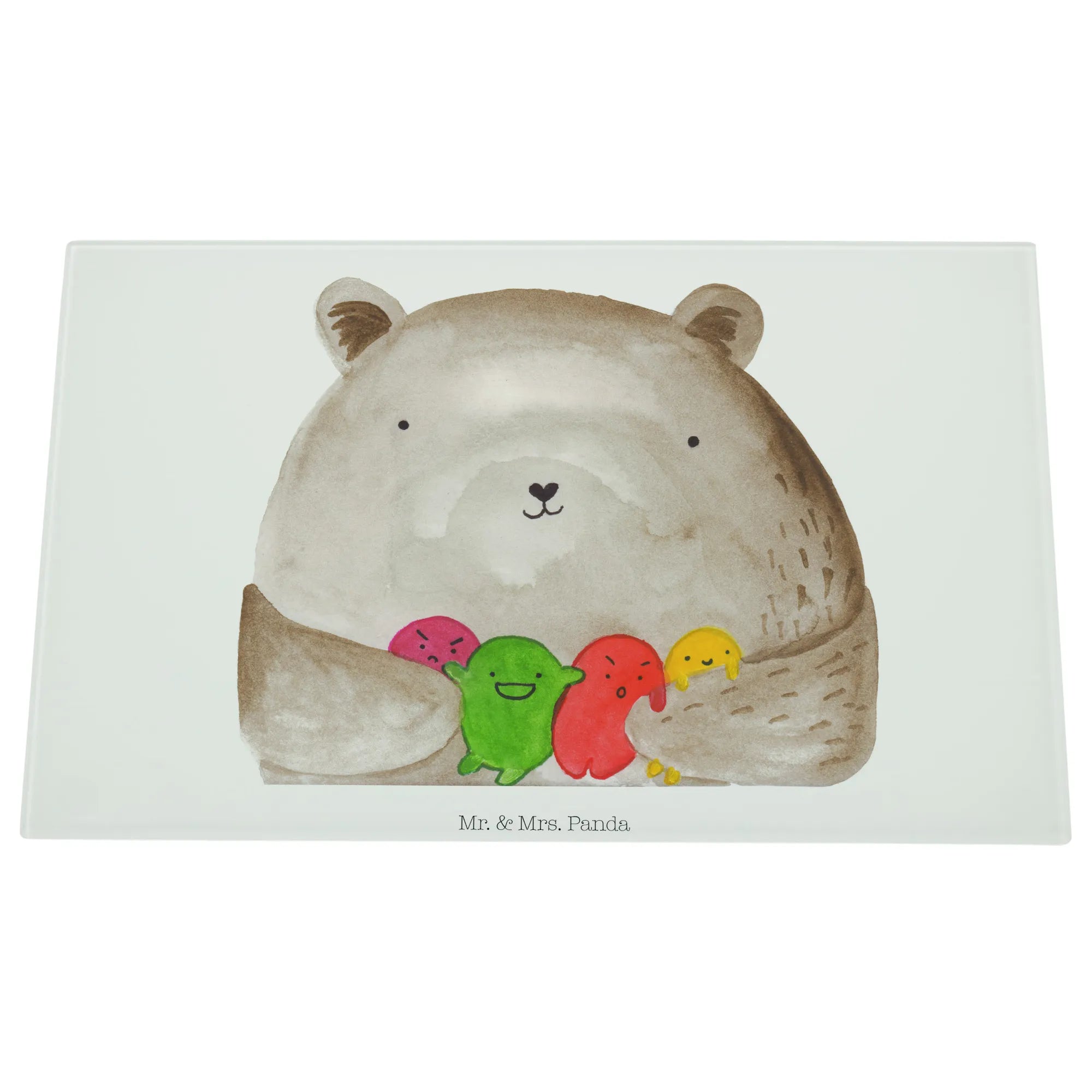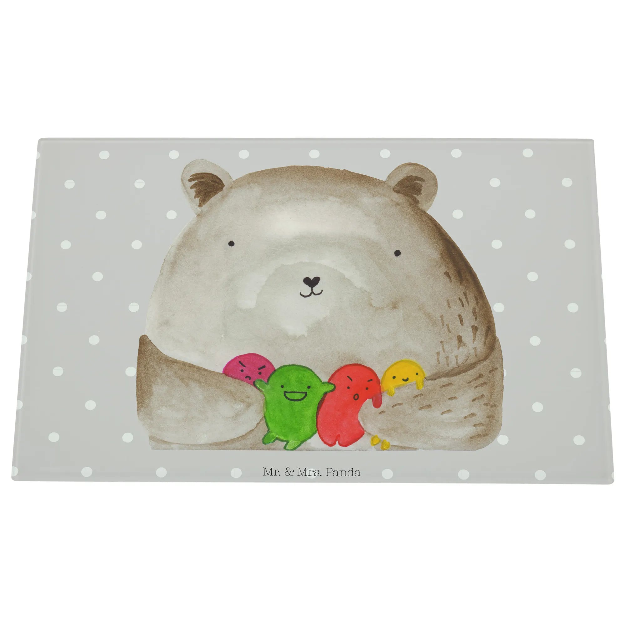 Introducing the spectacular XL glass chopping board from Mr. & Mrs. Panda, designed specifically for those who adore all things bear-related! This unique and sturdy glass cutting board features an endearing "Bear feeling" motif, showcasing a lovely bear surrounded by a colorful assortment of round, playful balls that represent its feelings. It's not just a functional kitchen tool; it’s also a delightful piece of art that will brighten your cooking space and bring joy into your culinary adventures.