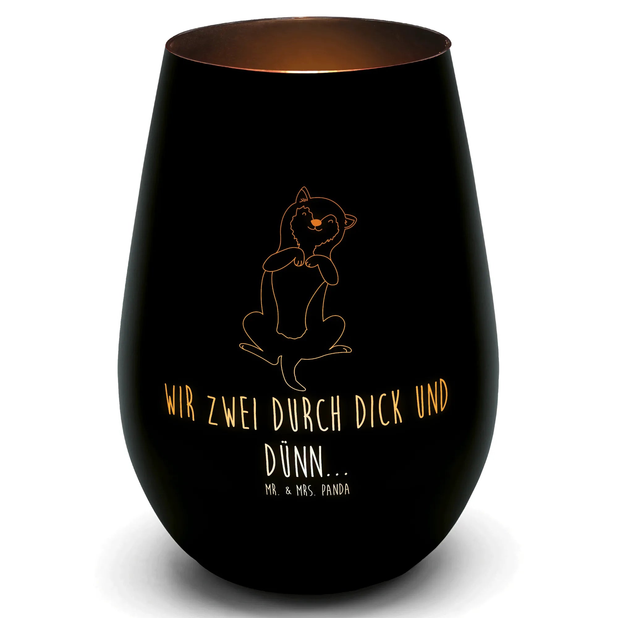 Dieses edle Windlicht Goldfarben vereint Stil und Herz. Das liebevoll gestaltete Hundemotiv zeigt einen entspannten Hund, der auf dem Rücken liegt und auf Bauchstreicheleinheiten wartet. Der süße Spruch „Wir zwei durch dick und dünn...“ macht das Teelicht zu einem besonders persönlichen Geschenk für Hundebesitzer und Tierliebhaber.