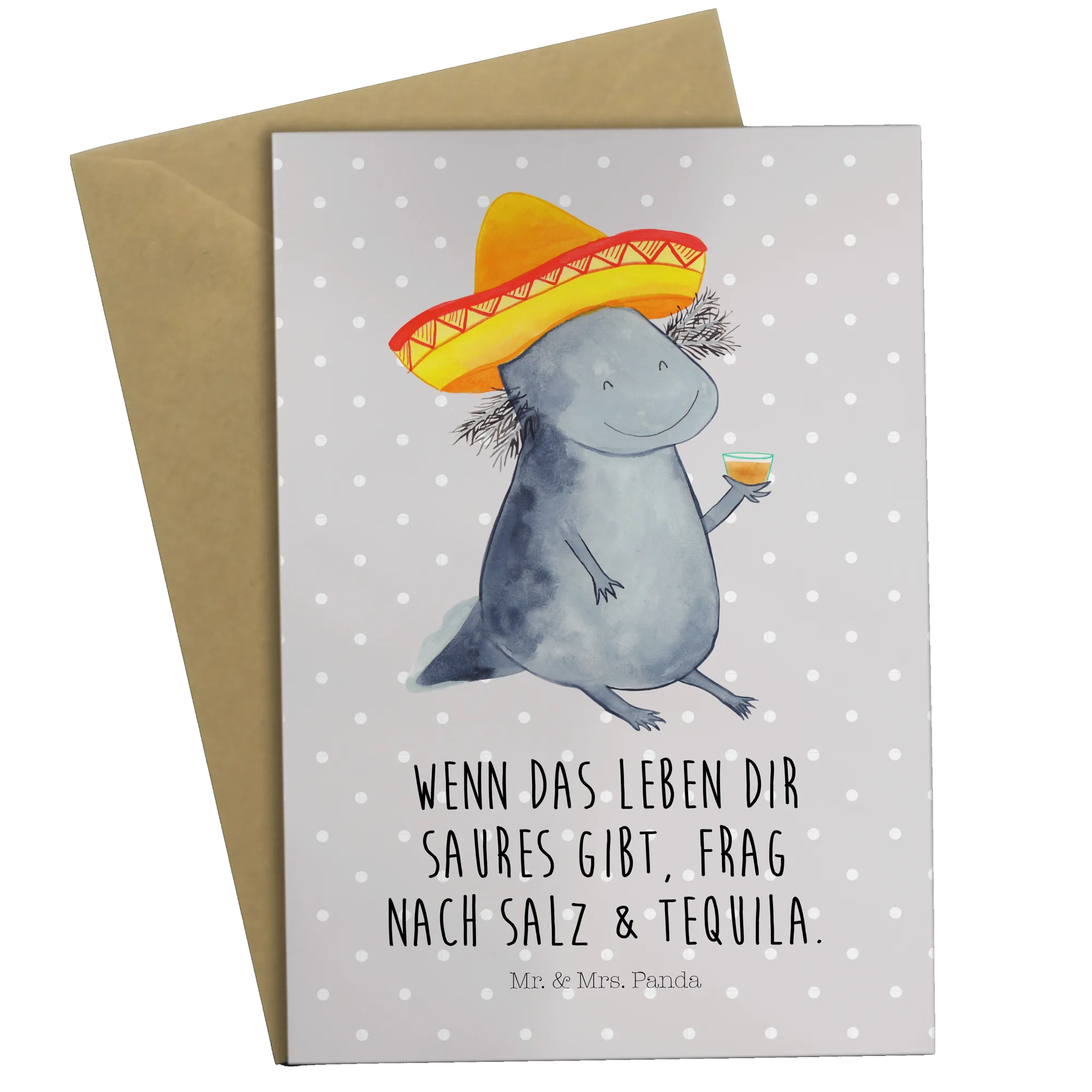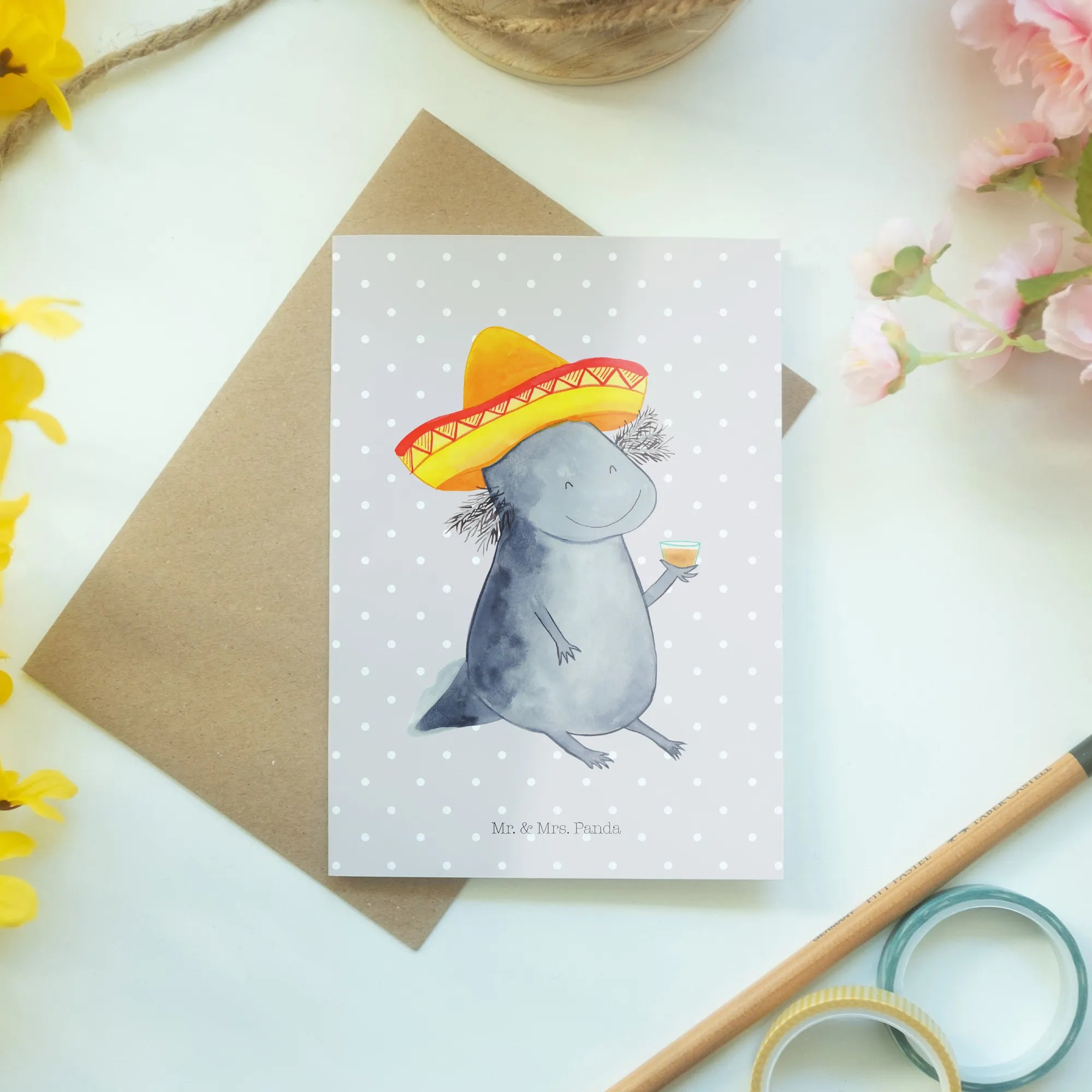 Introducing the adorable Axolotl Tequila Greeting Card from Mr. & Mrs. Panda, the ideal choice for anyone in search of a fun and unique way to celebrate life's greatest moments! This gorgeously designed folding card features a delightful illustration of a cute axolotl wearing a sombrero and holding a tequila glass, radiating pure joy and positivity. Perfect for birthdays, weddings, graduations, or any cheerful occasion, this card is not just a simple greeting—it's a heartfelt gesture meant to bring smiles and spread good vibes.