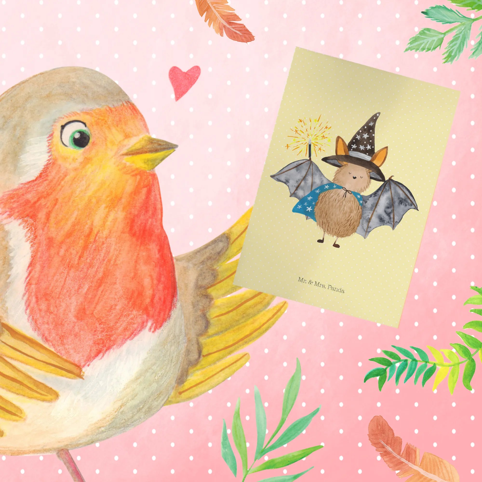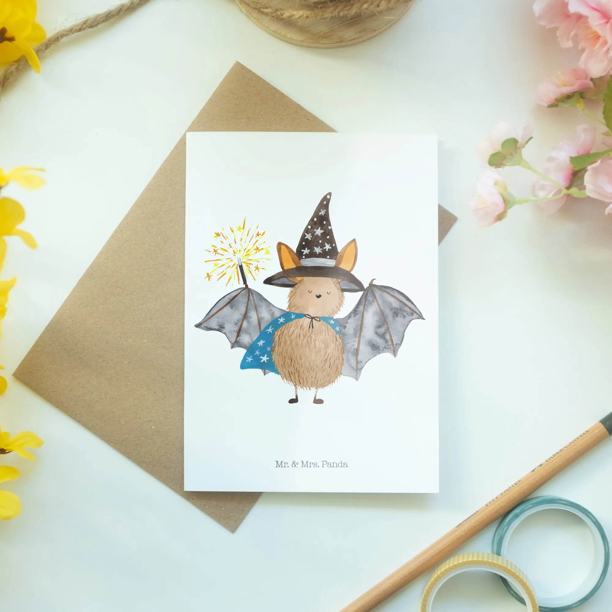 What makes this card unique is its enchanting illustration of a small bat donning a wizard’s hat and holding a magic wand. With a charming design that stars our little bat casting spells atop a branch, it's more than just a card—it's an invitation into a whimsical world filled with fantasy and joy. Each detail is lovingly hand-drawn by Mrs. Panda, ensuring that every card is a unique piece of art. The card also features a glossy finish on the front, giving it a touch of elegance, while the inside remains matte for easy and personal messages.
