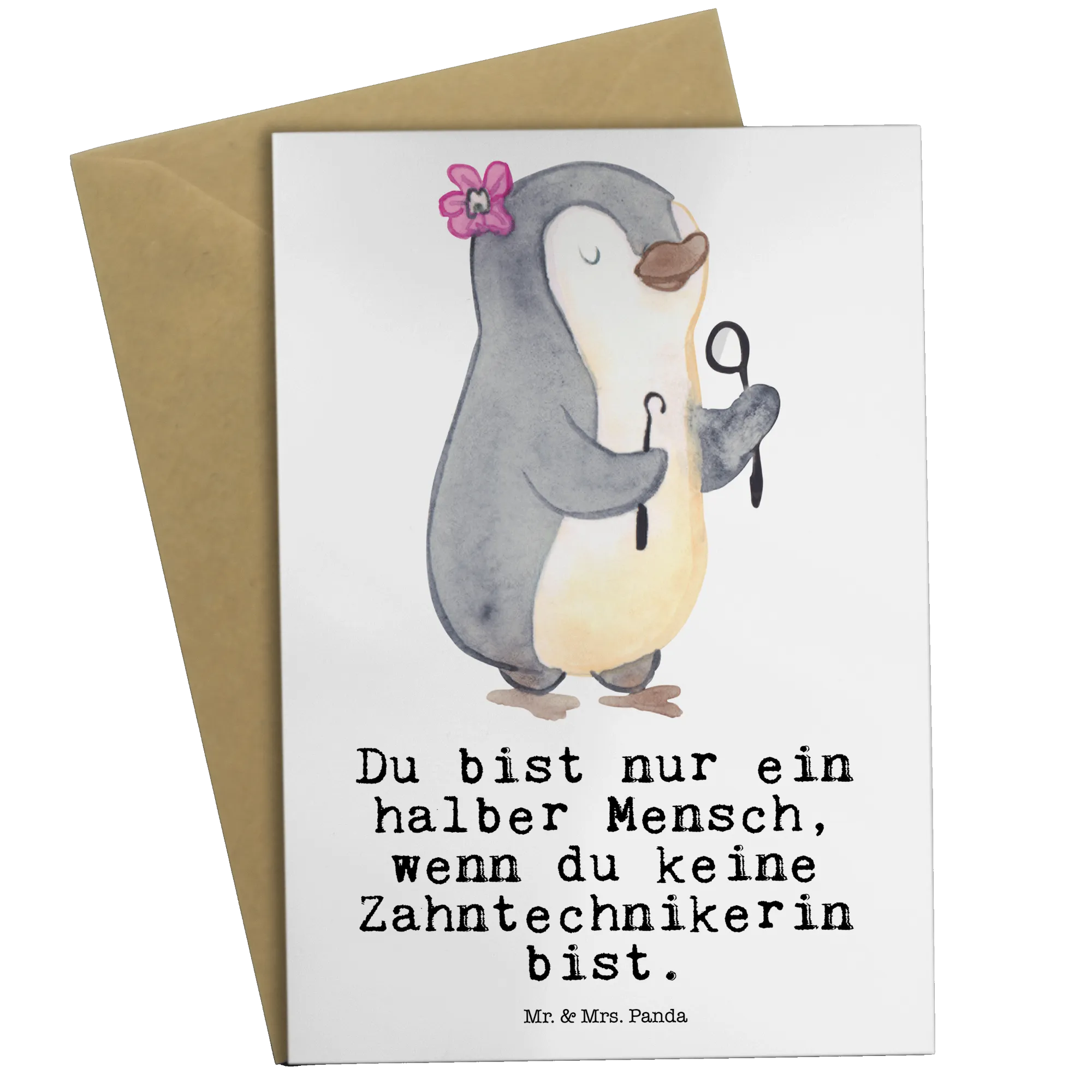 Introducing the delightful Greetings Card for Dental Technologists from the Professions Collection by Mr. & Mrs. Panda! This charming card is a perfect blend of whimsy and practicality, designed especially for those in the dental field. It features a wonderfully illustrated female penguin, proudly showcasing her profession with a bright smile, adorned with a dental-related pendant and ready to help. With the trendy slogan, "Is life even worth living if you're not a dental technologist?", this card is ideal for various occasions: congratulations on passing an exam, celebrating a new job start, or recognizing a colleague's retirement.