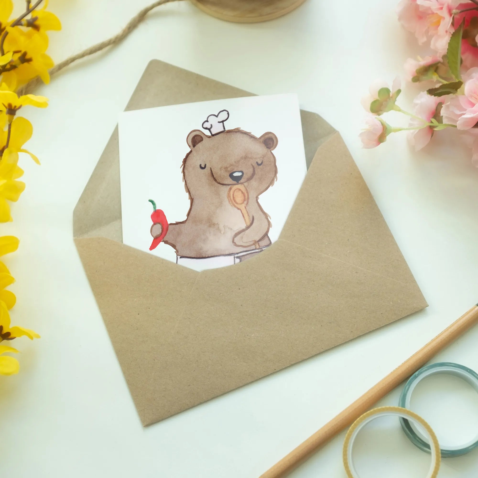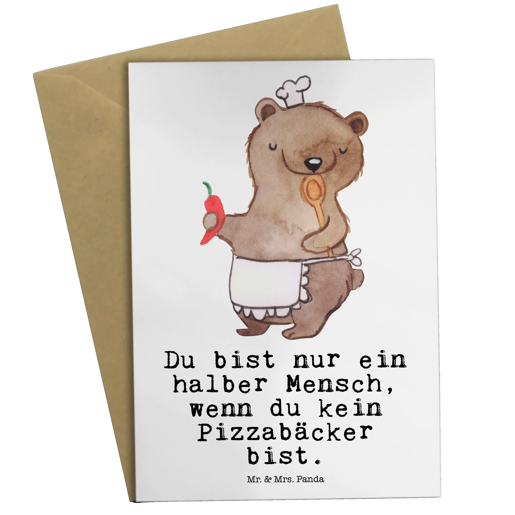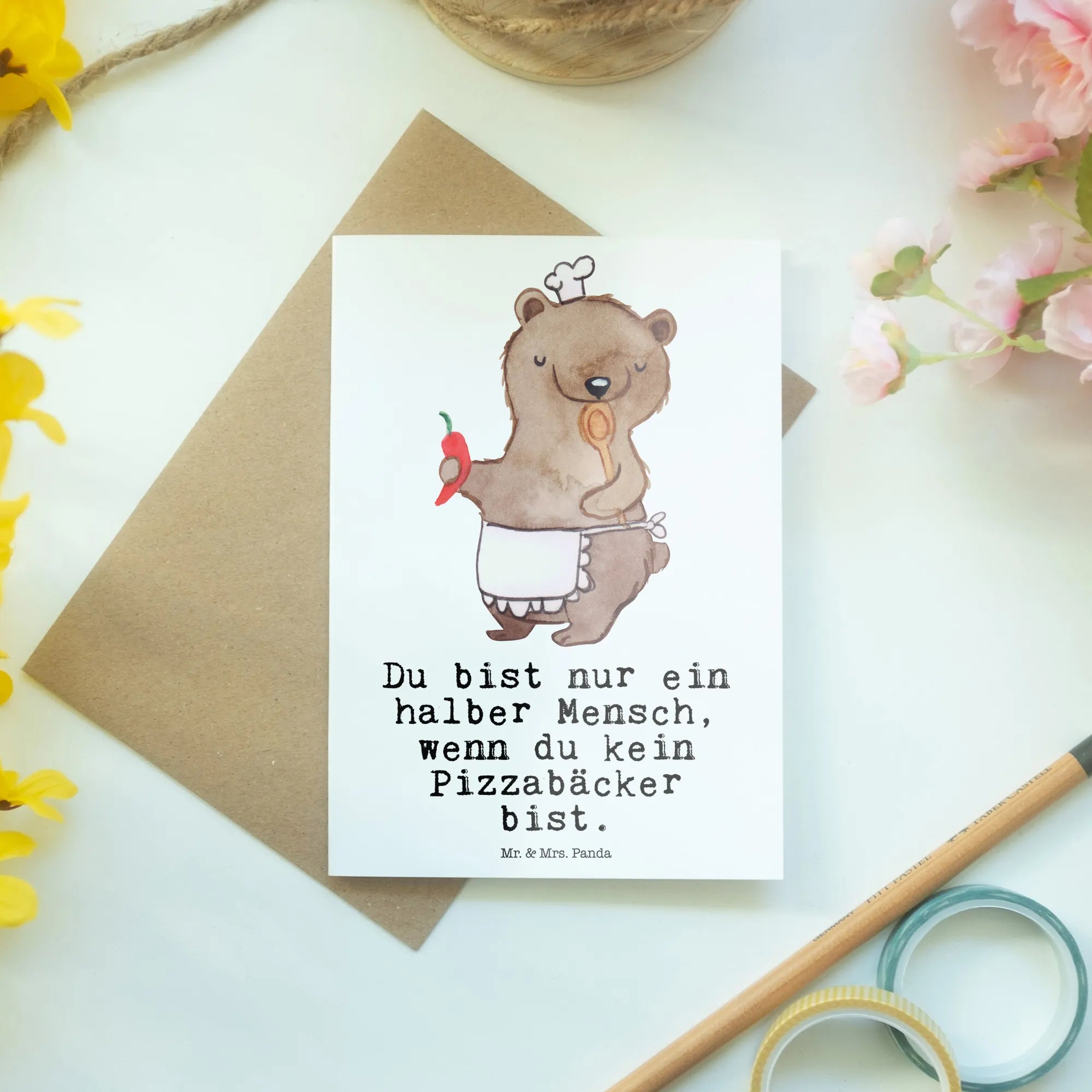 Introducing the perfect greeting card for pizza makers! This charming card from Mr. & Mrs. Panda is an adorable tribute to the vibrant world of pizza creation. Featuring a delightful motif of a cute little bear dressed as a pizza maker, wielding a wooden spoon in one hand and a fiery chili in the other, this card perfectly captures the joyful essence of those who are passionate about making delicious pizzas!
