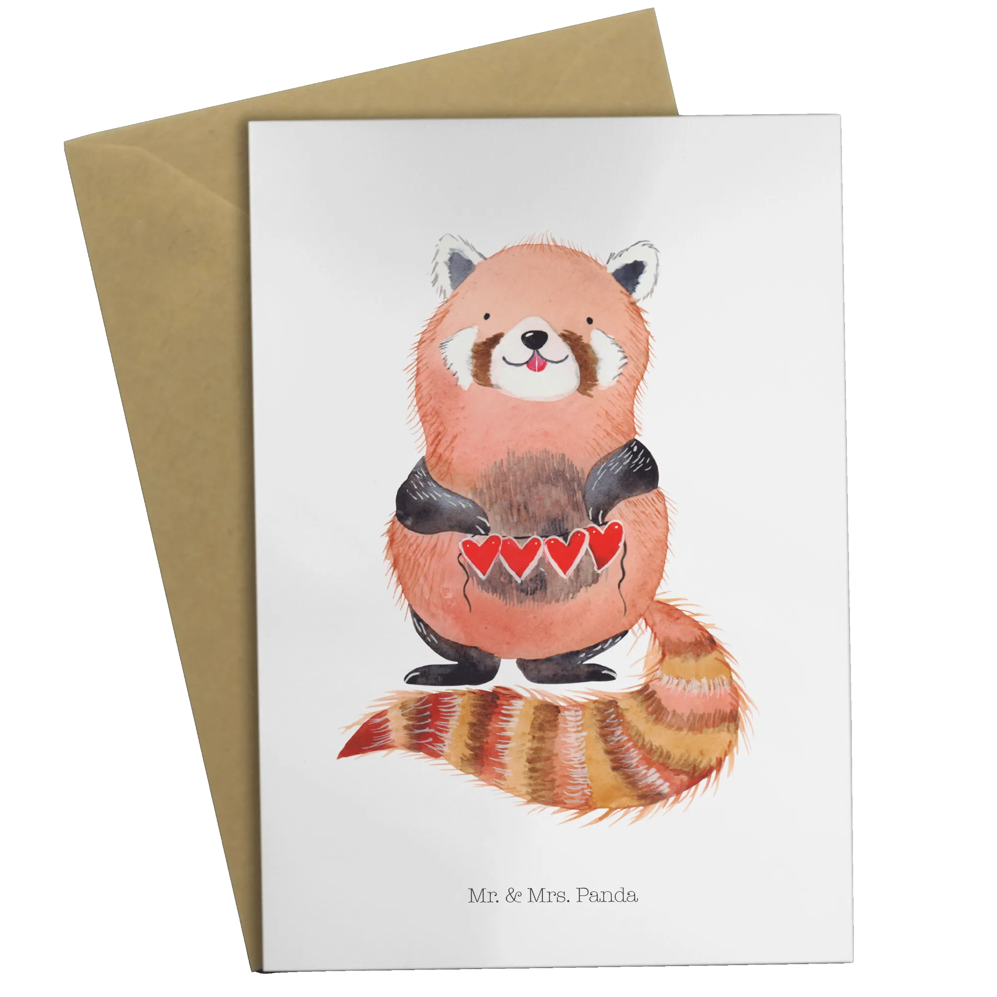 Introducing the adorable red panda greeting card from the charming Small World collection by Mr. & Mrs. Panda! This delightful card features an intricately hand-drawn illustration of a sweet little red panda, lovingly holding a heart garland while looking at you with endearing eyes.