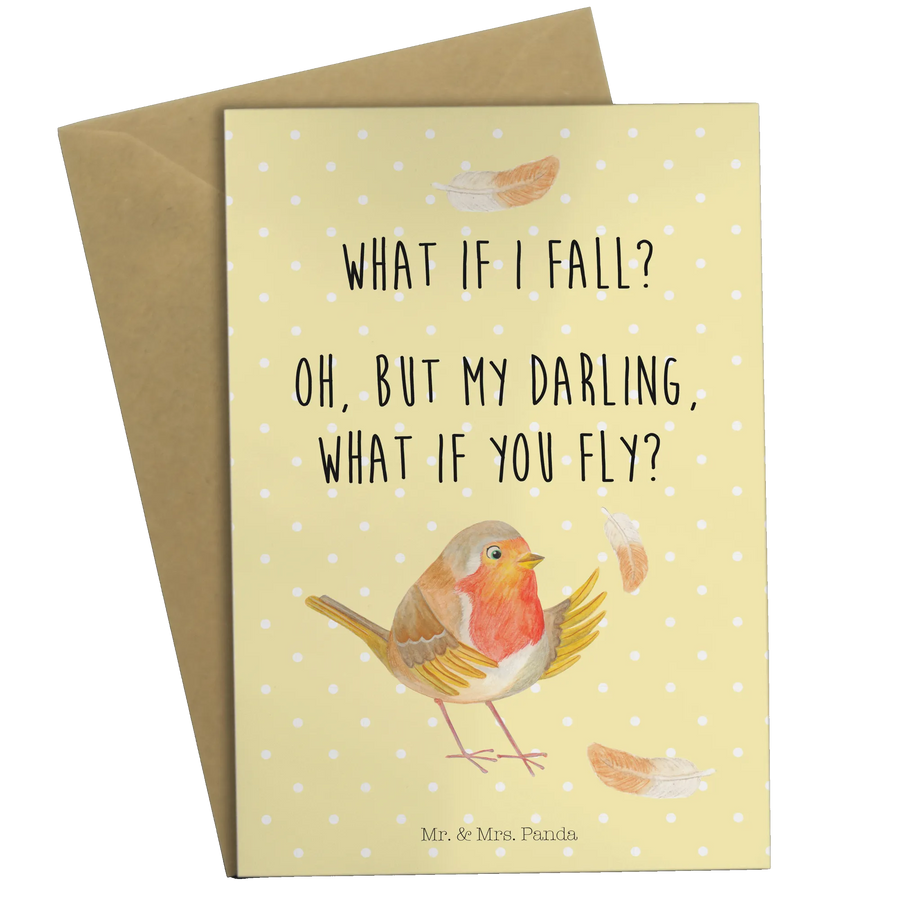 Introducing the delightful Mr. & Mrs. Panda Greeting Card featuring an adorable robin with feathers from our beloved Small World collection! This card is a charming way to spread joy and inspiration to your loved ones on special occasions. The beautiful hand-drawn illustration of our cute robin stands proudly, accompanied by the thought-provoking slogan, "What if I fall? Oh, but my darling, what if you fly?" This motivational message is perfect for encouraging those who might hesitate to take that leap of faith.