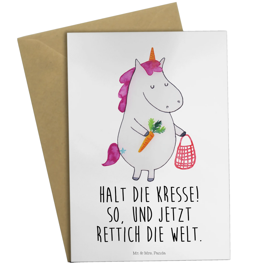 Imagine the smile on the face of your loved ones when they receive this charming card adorned with a lovable unicorn carrying fresh vegetables, designed with intricate care by Mrs. Panda herself. Our Unicorn Collection is not just another line of greeting cards. Every piece is a lovingly hand-drawn artwork, made right in the heart of Northern Germany. The vibrant colors and playful theme make this card a fantastic choice for various occasions, whether it's a birthday, wedding, or just to say "I'm thinking of you!"