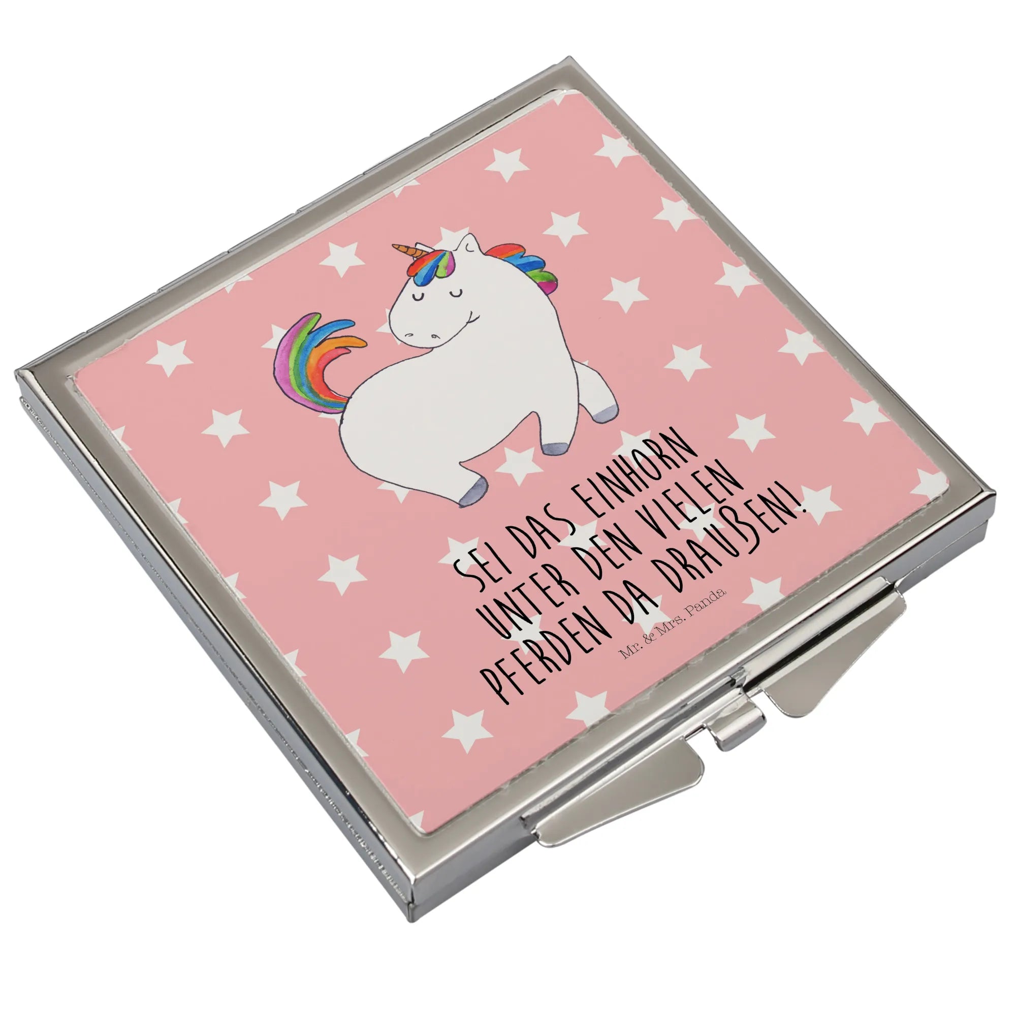 Zauberhaft, praktisch und voller Persönlichkeit: Unser quadratischer Handtaschenspiegel „Einhorn stolzierend“ von Mr. & Mrs. Panda macht jeden Blick in den Spiegel zu einem kleinen Glücksmoment. Das liebevoll handgezeichnete Einhorn-Motiv aus der Einhorn - Kollektion ist mit dem motivierenden Spruch „Sei das Einhorn unter den vielen Pferden da draußen!“ versehen und erinnert dich daran, einzigartig zu sein.