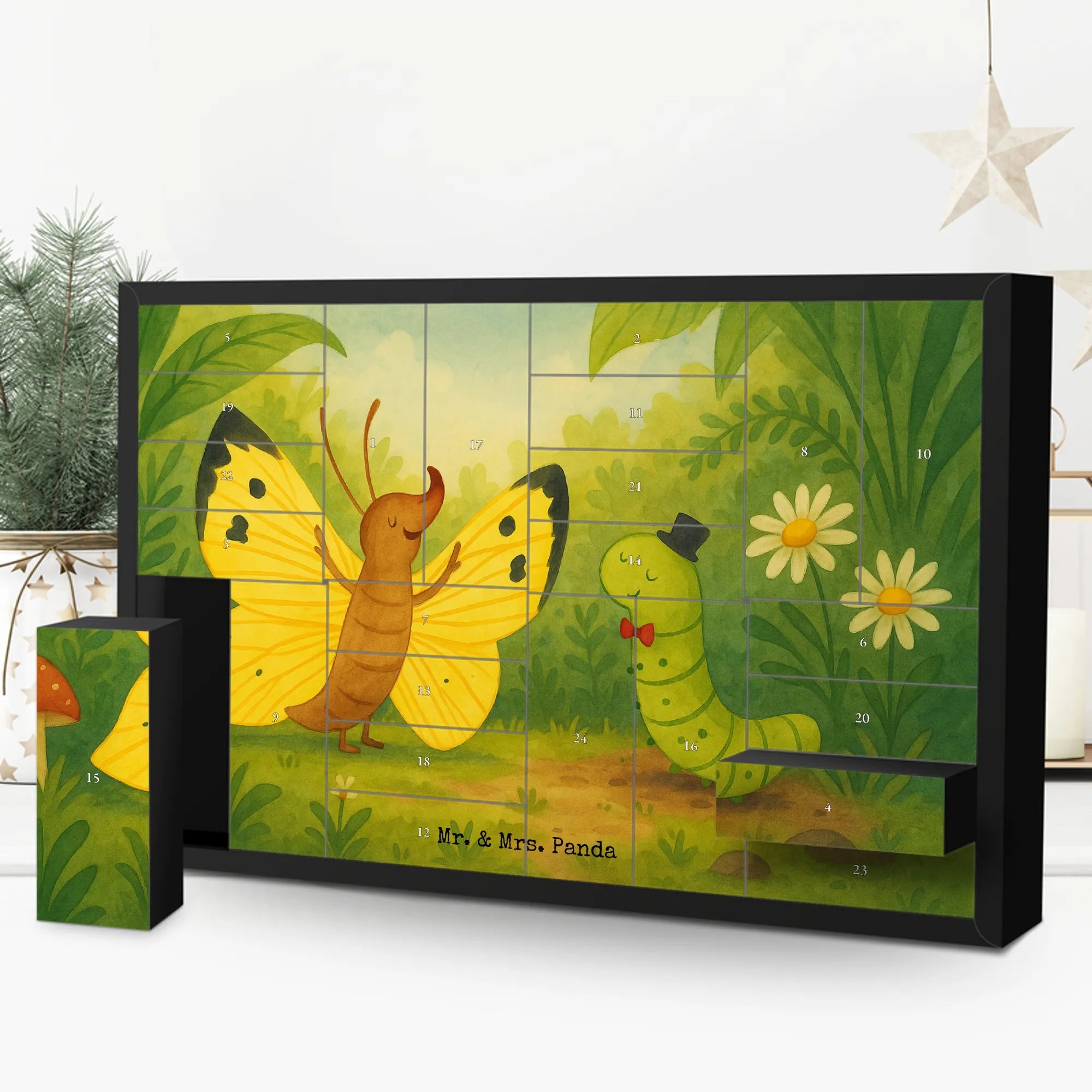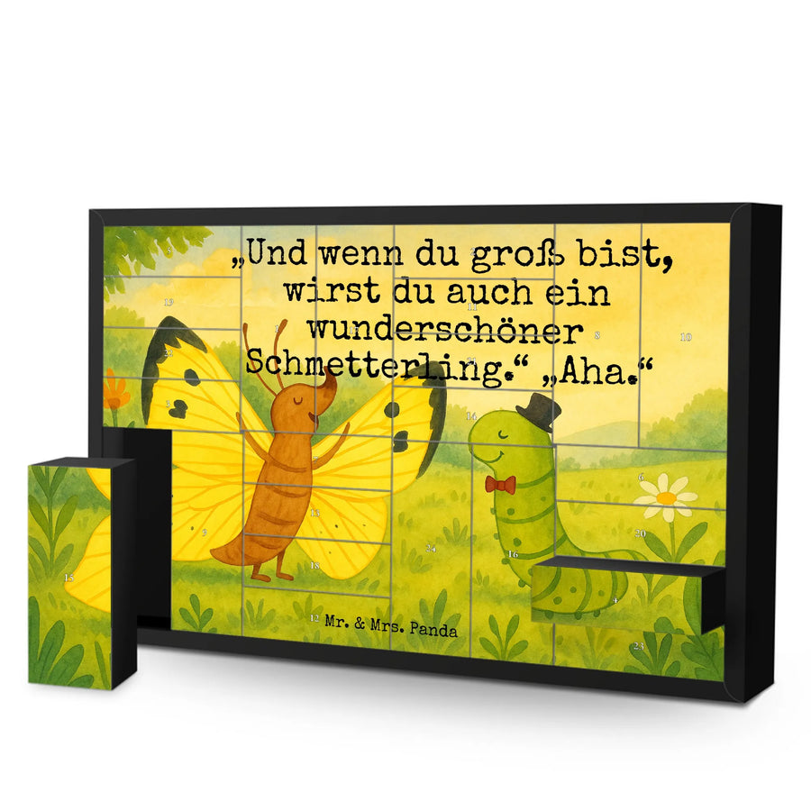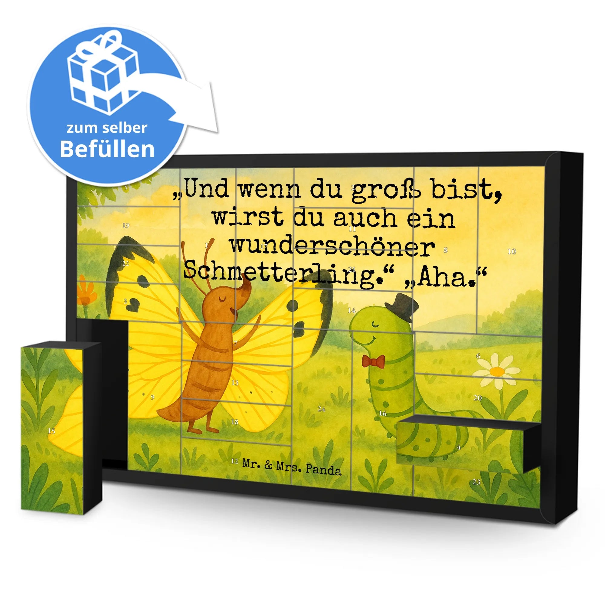 Wunderschöner befüllbarer Adventskalender „Raupe & Schmetterling“ aus der Small World Kollektion von Mr. & Mrs. Panda. Eine liebevolle Zeichnung von Mrs. Panda zeigt die kleine Raupe, die sich stolz in einen farbenfrohen Schmetterling verwandelt. Dazu der charmante Spruch: „Und wenn du groß bist, wirst du auch ein wunderschöner Schmetterling.“ „Aha.“
