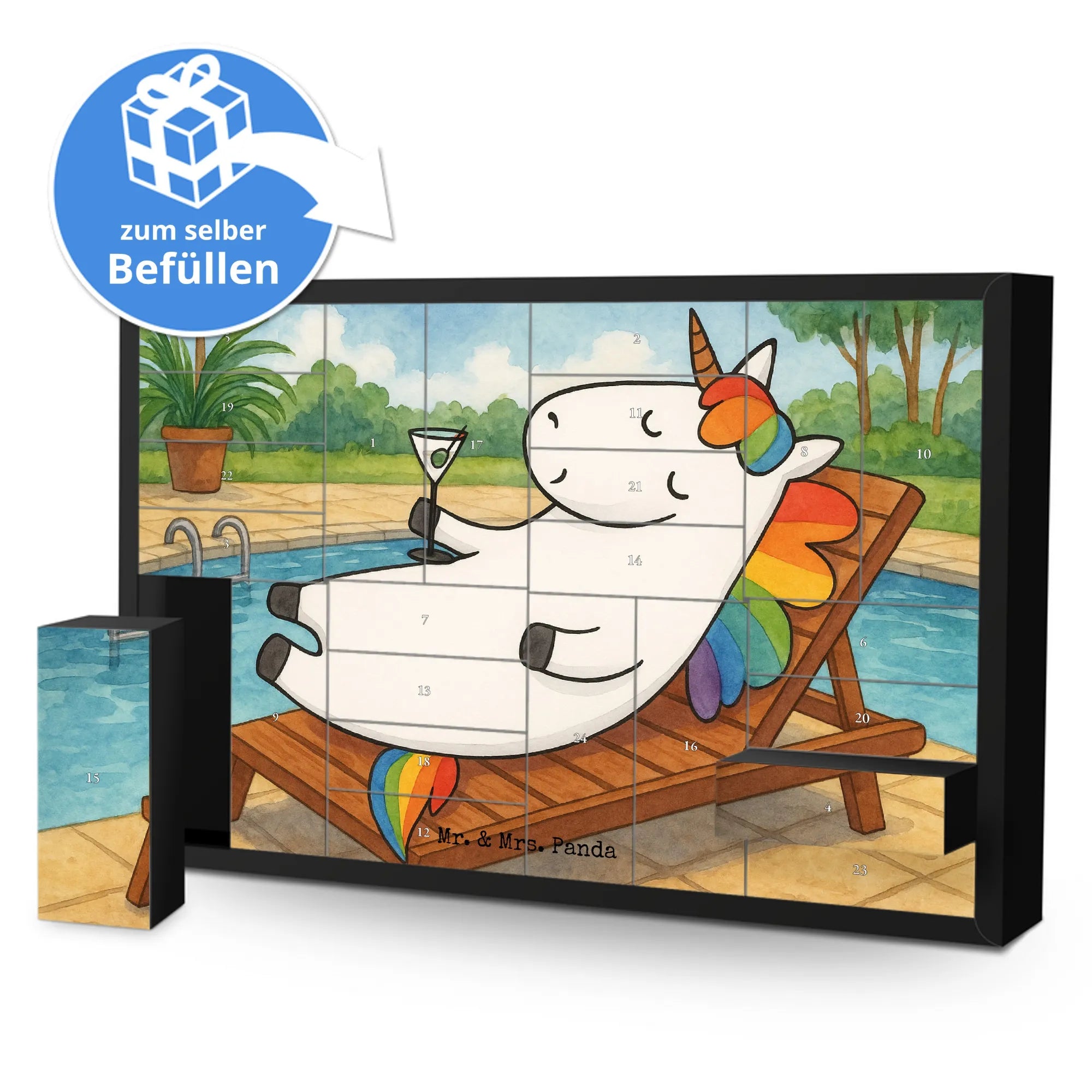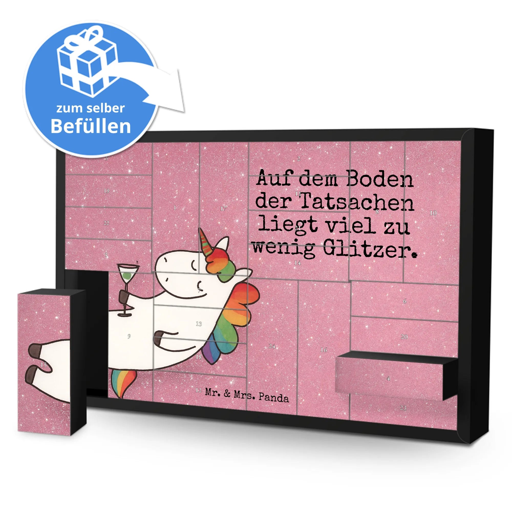 Der befüllbare Adventskalender „Einhorn Cocktail“ aus der Einhorn - Kollektion von Mr. & Mrs. Panda ist ein liebevoll gestaltetes Geschenk für alle, die Glitzer, Spaß und kleine Überraschungen lieben. Das Motiv zeigt ein entspanntes Einhorn mit Cocktailglas und trägt den frechen Spruch: „Auf dem Boden der Tatsachen liegt viel zu wenig Glitzer.“ – perfekt für Freundinnen, Geburtstagskinder und Unicorn-Fans.