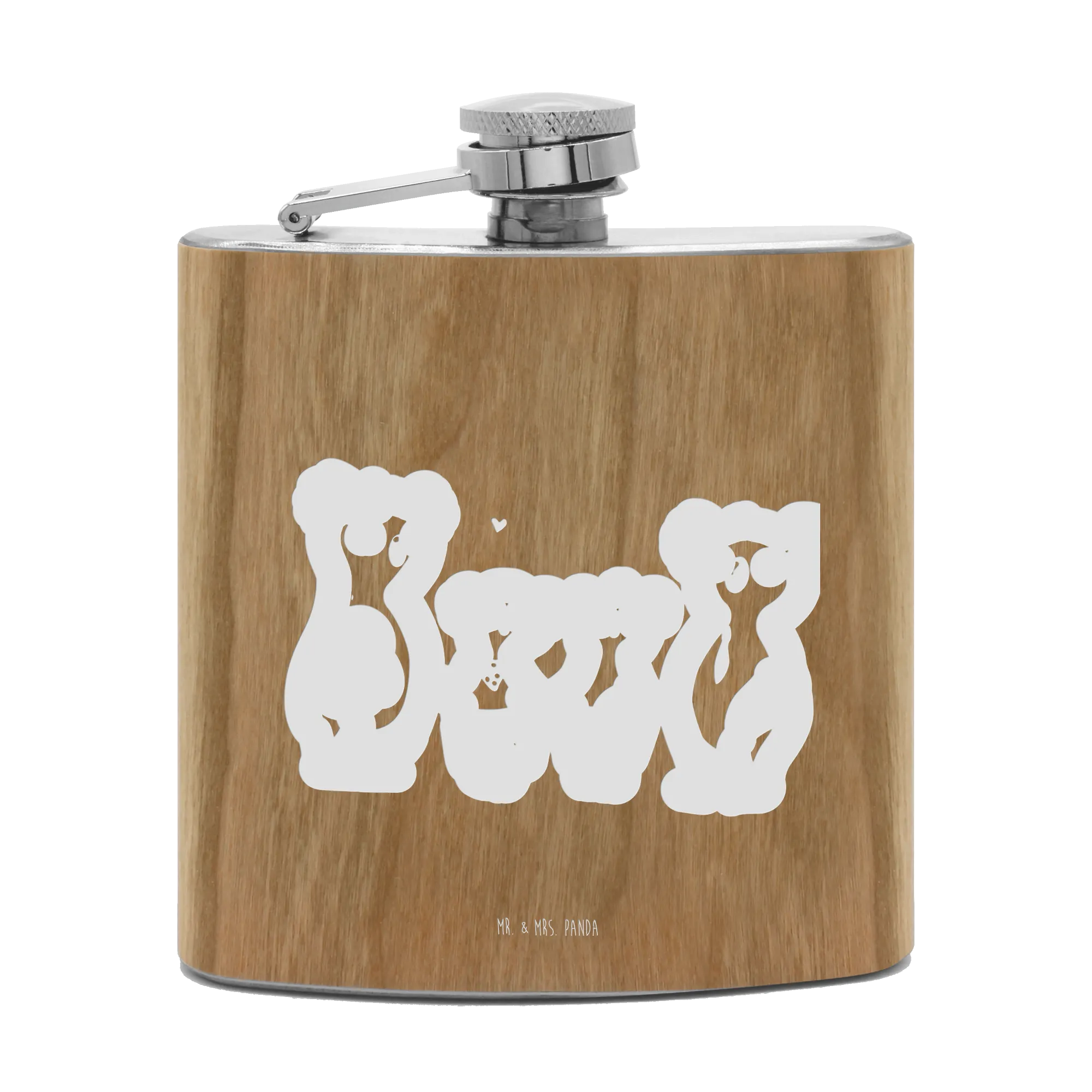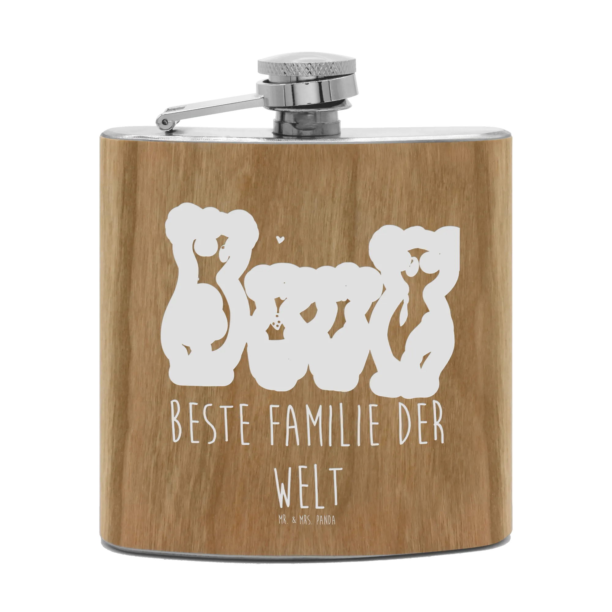 Der ideale Begleiter für eure Familienabenteuer – der Flachmann Koala Familie zwei von Mr. & Mrs. Panda! Mit einer hochwertigen Gravur, die ein liebevolles Bild von vier Koalabären zeigt, ist dieser Flachmann nicht nur praktisch, sondern auch ein echtes Liebhaberstück. Ob beim Picknick, beim Camping oder einfach nur für einen netten Abend im Kreis der Familie, dieser Flachmann ist immer dabei und macht eure gemeinsamen Momente unvergesslich.