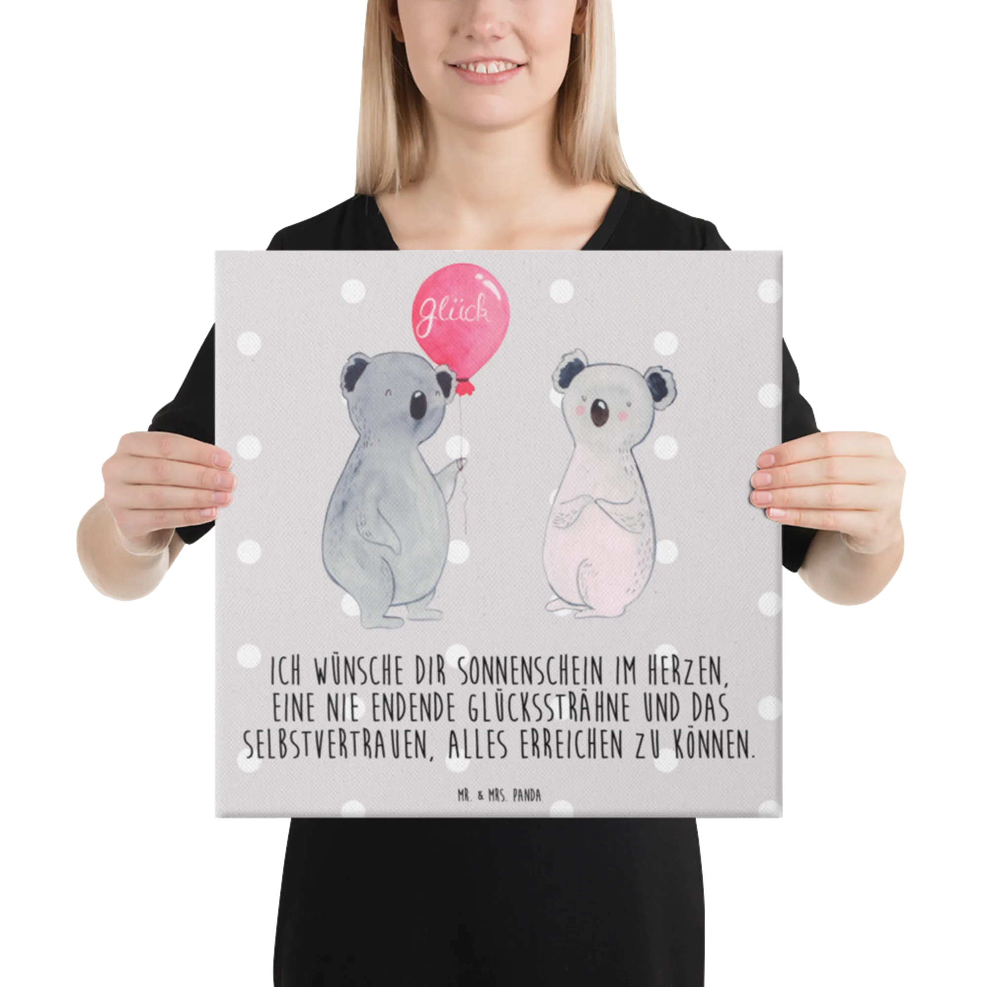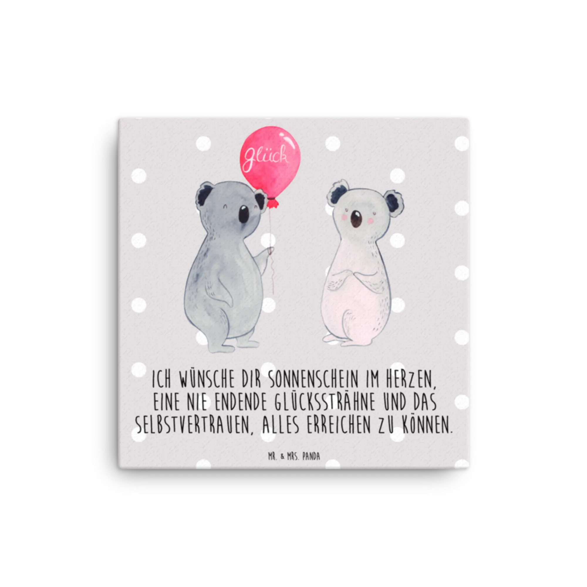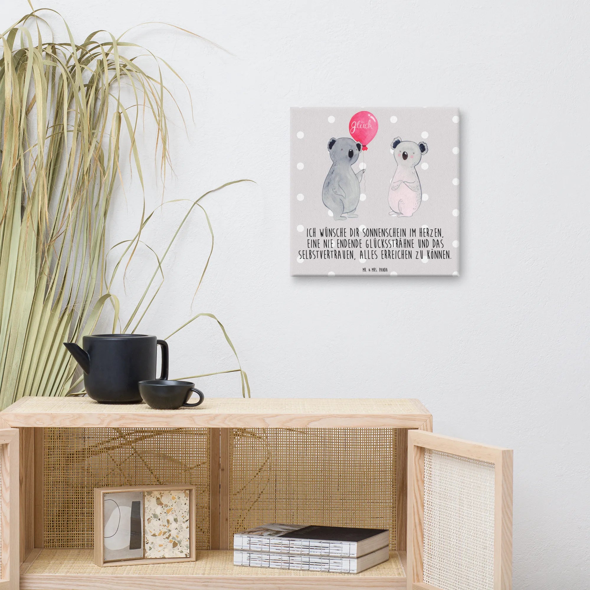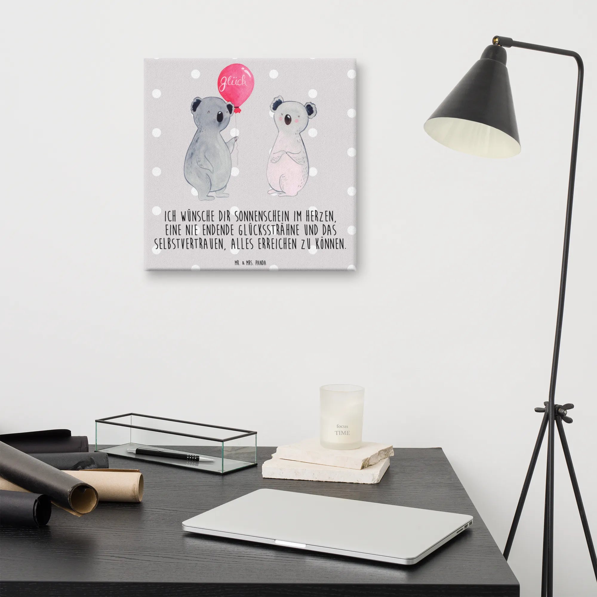 Dieses zauberhafte Leinwand Bild aus der Koala Kollektion von Mr. & Mrs. Panda zeigt zwei fröhliche Koalas und einen bunten Luftballon mit dem liebevollen Spruch:
