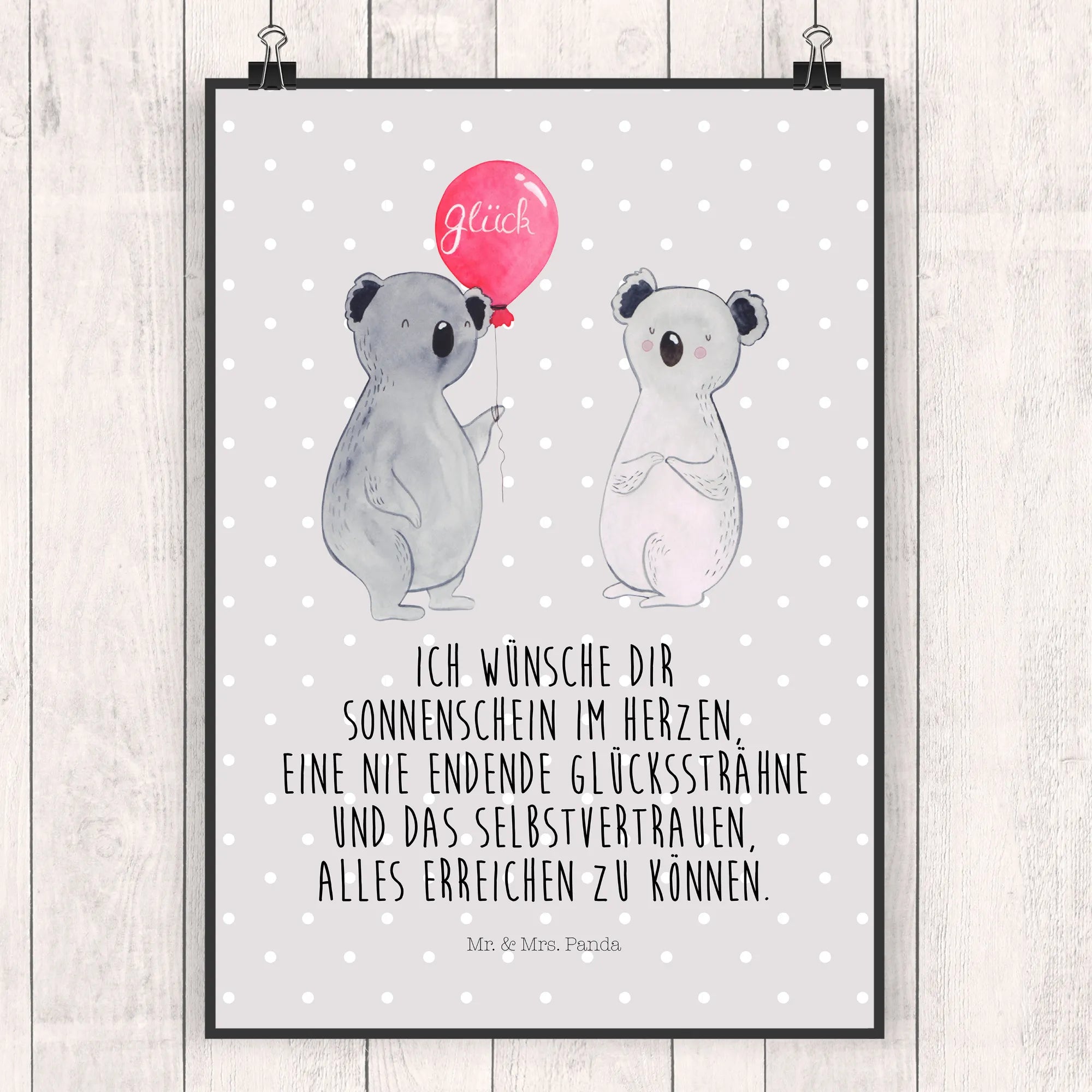Picture this: two lovable koalas, brimming with joy! One is clutching a balloon that symbolizes happiness and the celebration of life's beautiful moments. This charming motif is a perfect addition to any party or birthday celebration. With the slogan 'Ich wünsche dir Sonnenschein im Herzen, eine nie endende Glückssträhne und das Selbstvertrauen, alles erreichen zu können', we wish you endless sunshine in your heart, a cascade of good luck, and the assurance that you can achieve anything. It's a heartfelt reminder of the joy that comes from celebrating together.