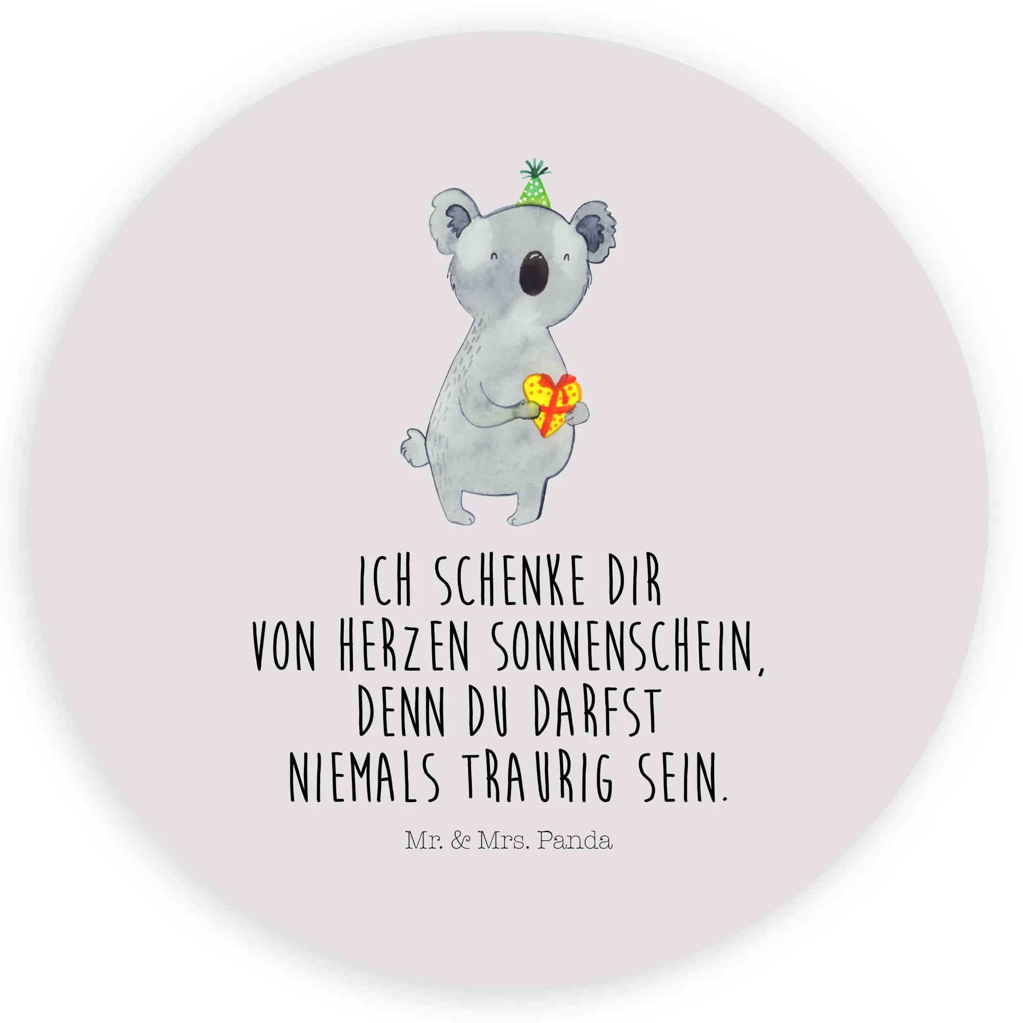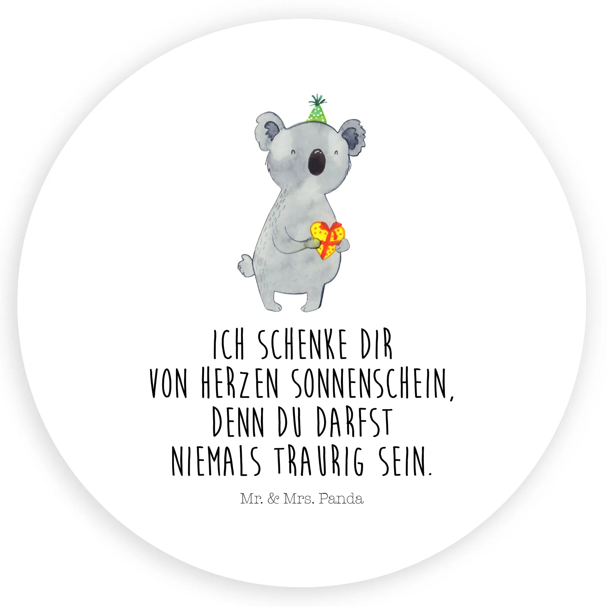 Unser 120mm Rund Aufkleber von Mr. & Mrs. Panda zeigt den bezaubernden Koala mit Partyhut, der ein herzförmig verpacktes Geschenk hält. Mit dem herzlichen Spruch „Ich schenke dir von Herzen Sonnenschein, denn du darfst niemals traurig sein.“ wird dieser Sticker zu einem kleinen Botschafter der Freude – perfekt für Geburtstage, Partys und süße Überraschungen.