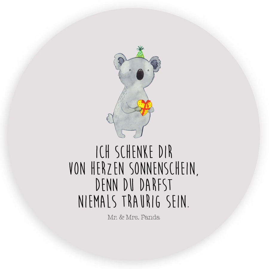 Ein liebevoller runder Aufkleber von Mr. & Mrs. Panda: Unser 80mm Rund Aufkleber „Koala Geschenk“ bringt warme Gefühle auf jede Verpackung. Der süße Koala mit Partyhut hält ein herzförmiges Geschenk, begleitet vom Spruch „Ich schenke dir von Herzen Sonnenschein, denn du darfst niemals traurig sein.“ – perfekt für Kindergarten, Kindergeburtstag und persönliche Geschenke.