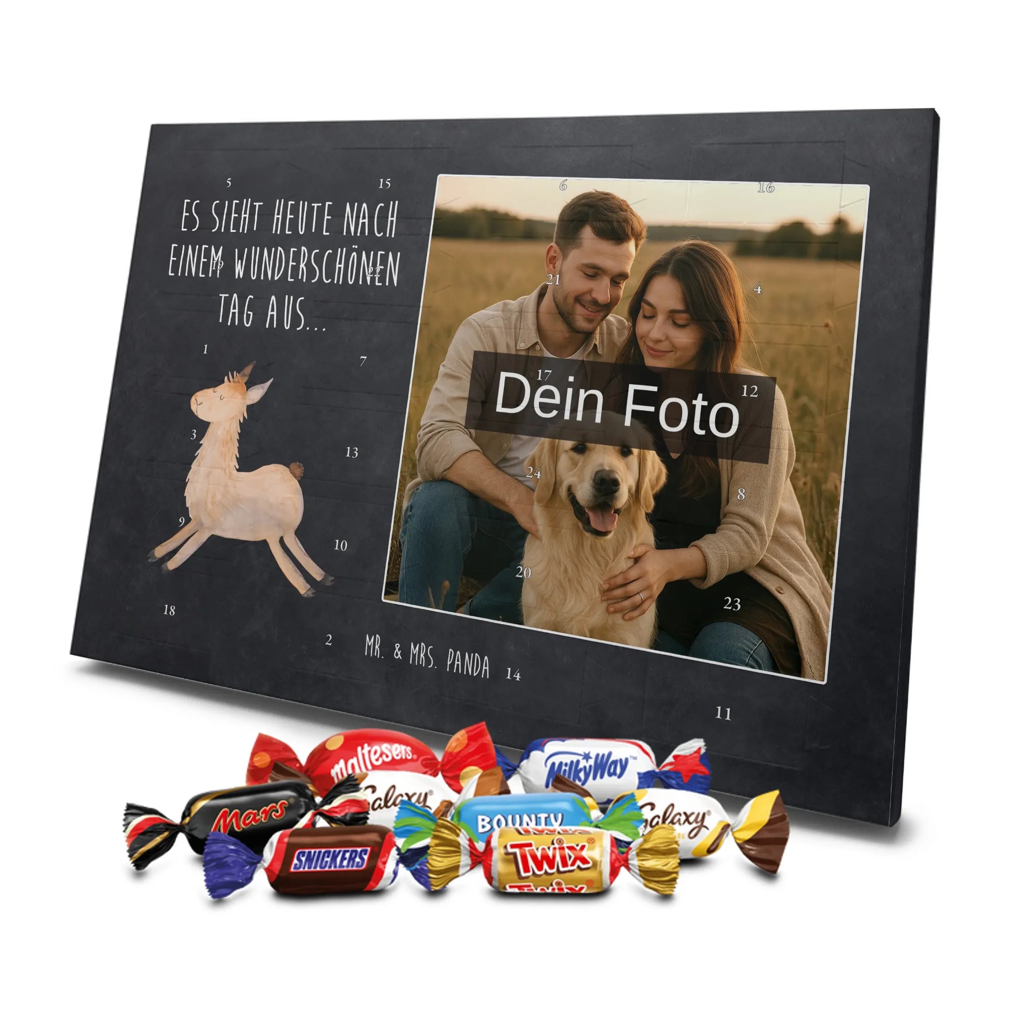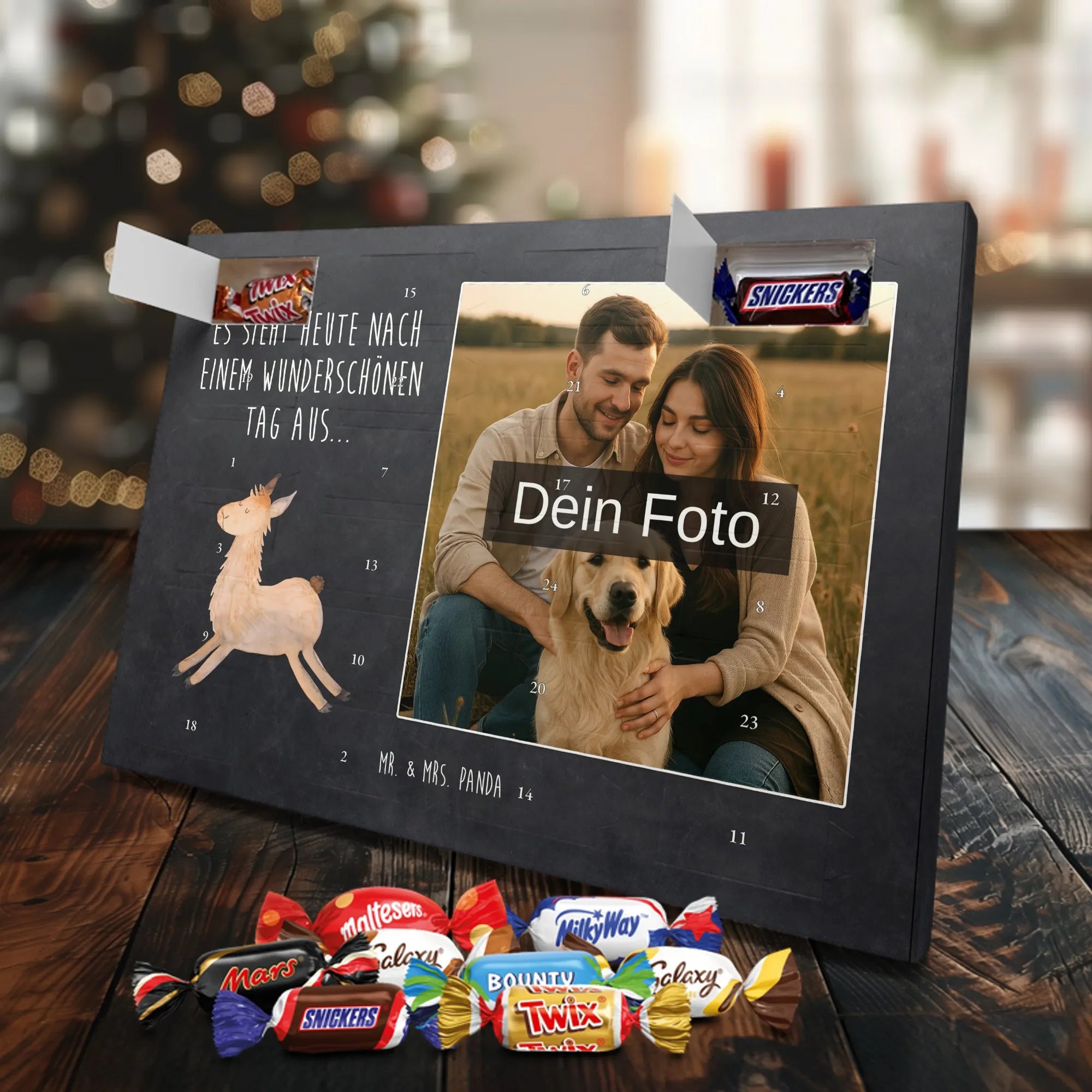 Lustiger Personalisierter Schoko Foto-Adventskalender – das Must-have für eine persönliche Adventszeit von Mr. & Mrs. Panda. Jeder Kalender wird mit unseren charmanten Illustrationen und liebevollen Sprüchen bedruckt, während dein Foto die Vorderseite einzigartig macht. Achte bitte darauf, ein Foto mit guter Qualität und ausreichend hoher Auflösung hochzuladen, damit der Druck gestochen scharf wirkt. Überprüfe den Bildausschnitt, damit wichtige Bereiche nicht verloren gehen. Denk daran, nur Bilder zu verwenden, bei denen du die nötigen Rechte besitzt. Die Verarbeitung ist hochwertig: brillante Druckqualität mit seidenmatter Oberflächenveredelung und bedruckten Seitenflächen. Maße: 325 mm x 225 mm x 27 mm. Du kannst den Kalender aufhängen oder aufstellen – sehr praktisch. Hinweis: Die hochgeladenen Fotos werden nicht nachbearbeitet oder zugeschnitten; Rücknahme bei personalisierten Foto-Artikeln ist ausgeschlossen. Gefüllt ist der Kalender mit Celebrations Schokolade – 24 Stück in 8 verschiedenen Sorten (Maltesers, Mars, Snickers, Twix, Milky Way, Bounty, Galaxy, Galaxy Caramel). Verschenke ein Stück persönlich gestaltete Vorfreude und mache jeden Dezembertag zu etwas Besonderem.
