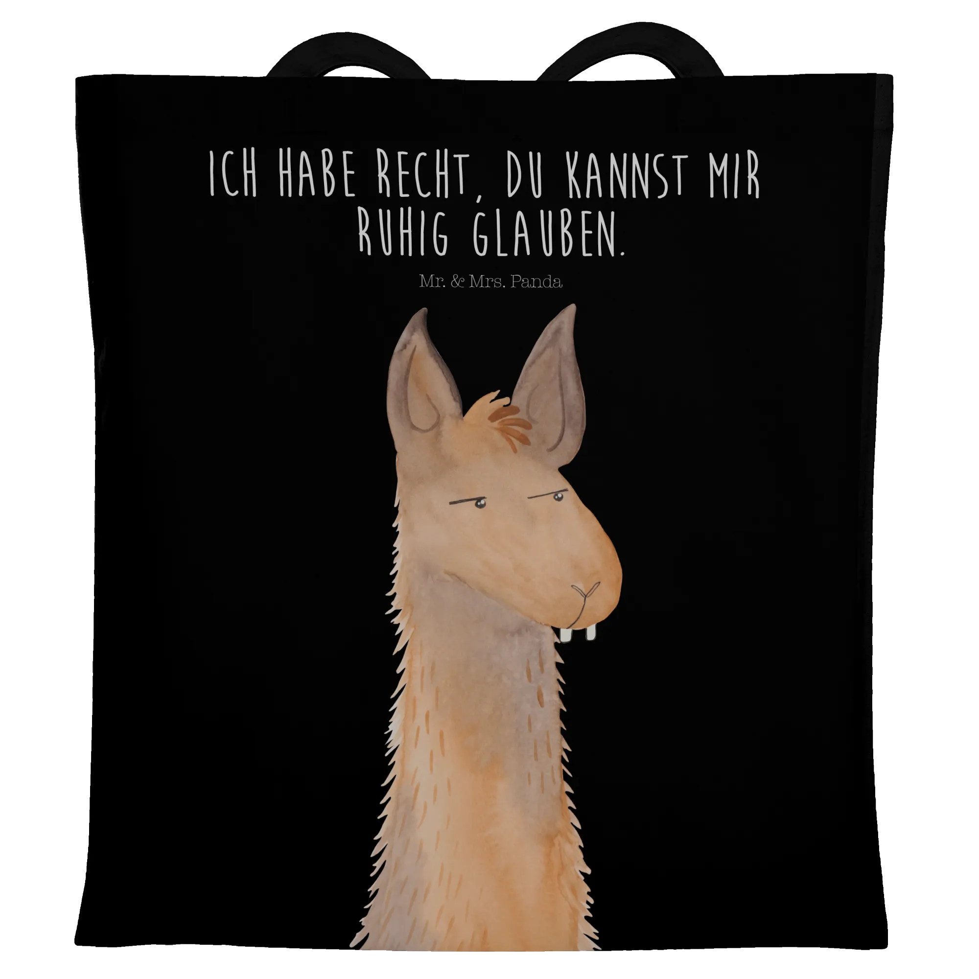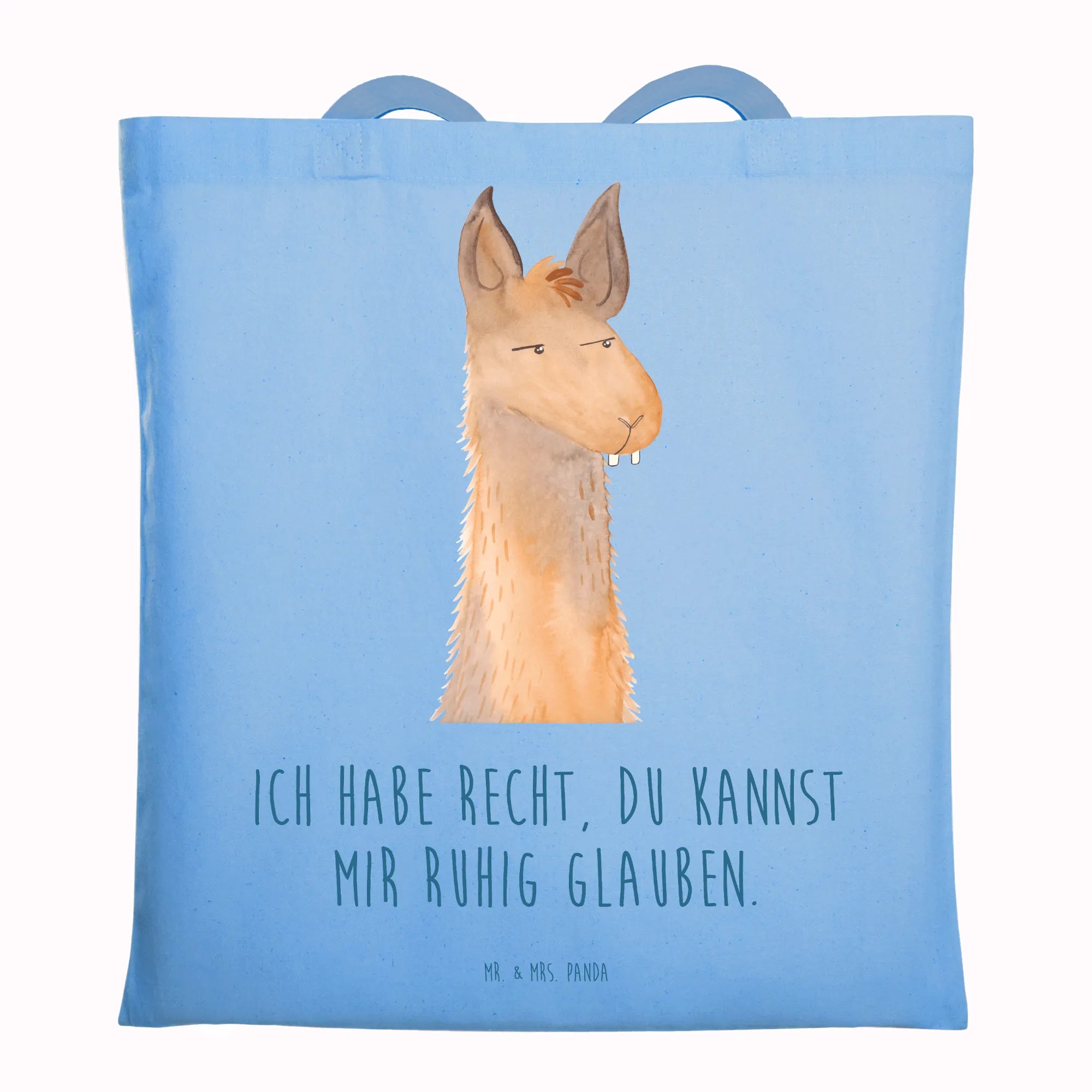 Du suchst eine Tragetasche mit Persönlichkeit? Unsere Tragetasche „Lamakopf genervt“ aus der Lama - Kollektion von Mr. & Mrs. Panda verbindet frechen Charme mit praktischer Alltagstauglichkeit. Das liebevoll gezeichnete Lama schaut genervt zur Seite und der Slogan „Ich habe Recht, du kannst mir ruhig glauben.“ macht die Tasche zum perfekten Statementbeutel für Freundinnen, beste Freundin, Partnerin, Chefin oder Chef.