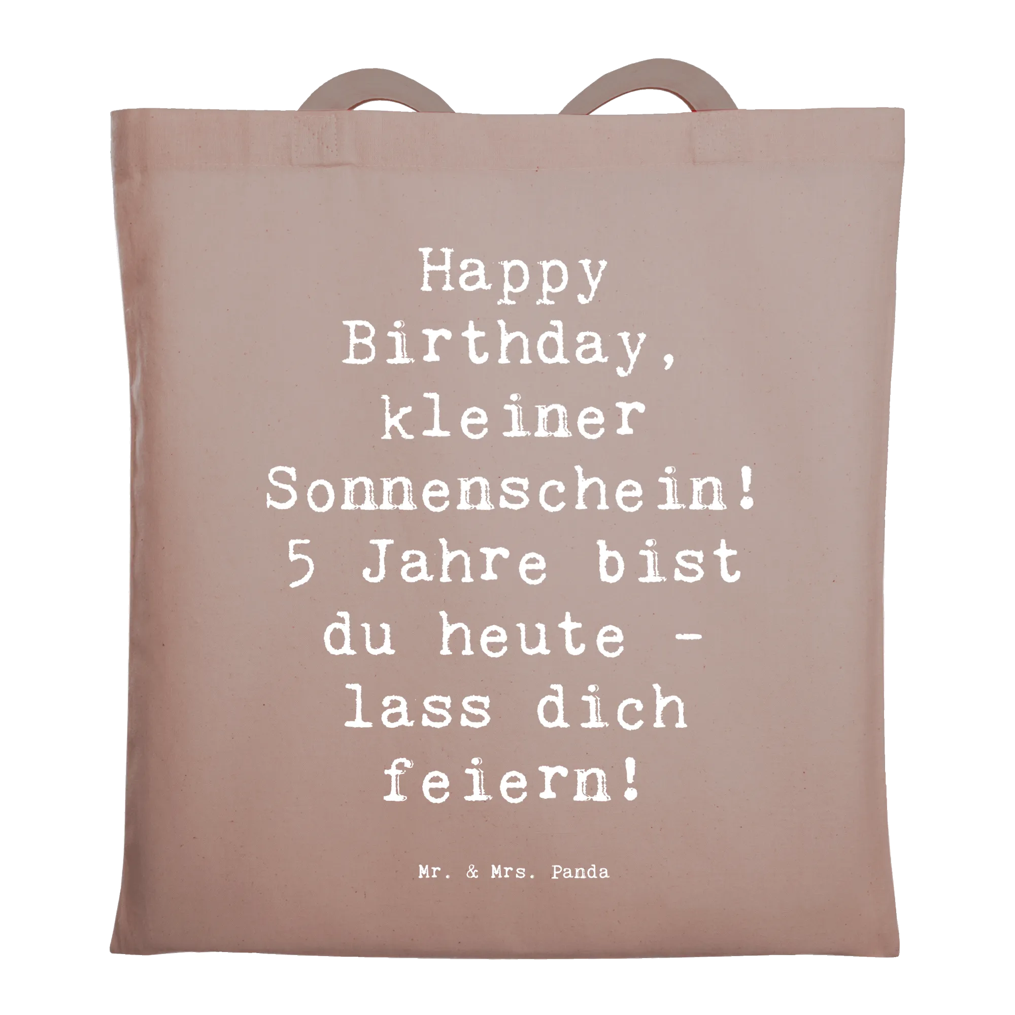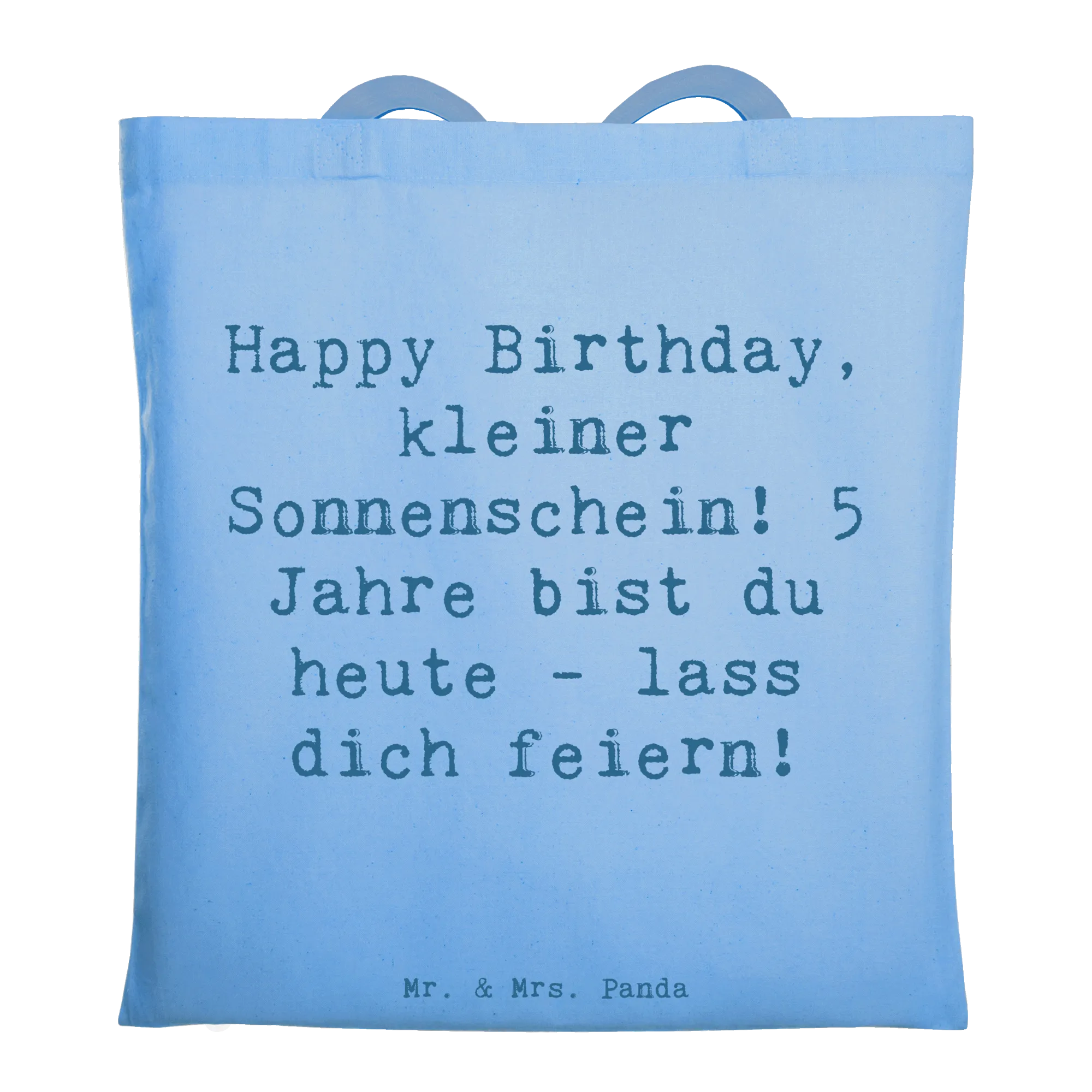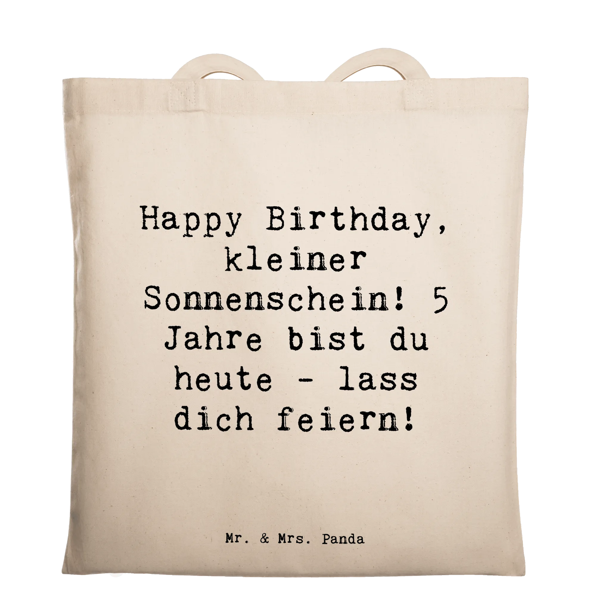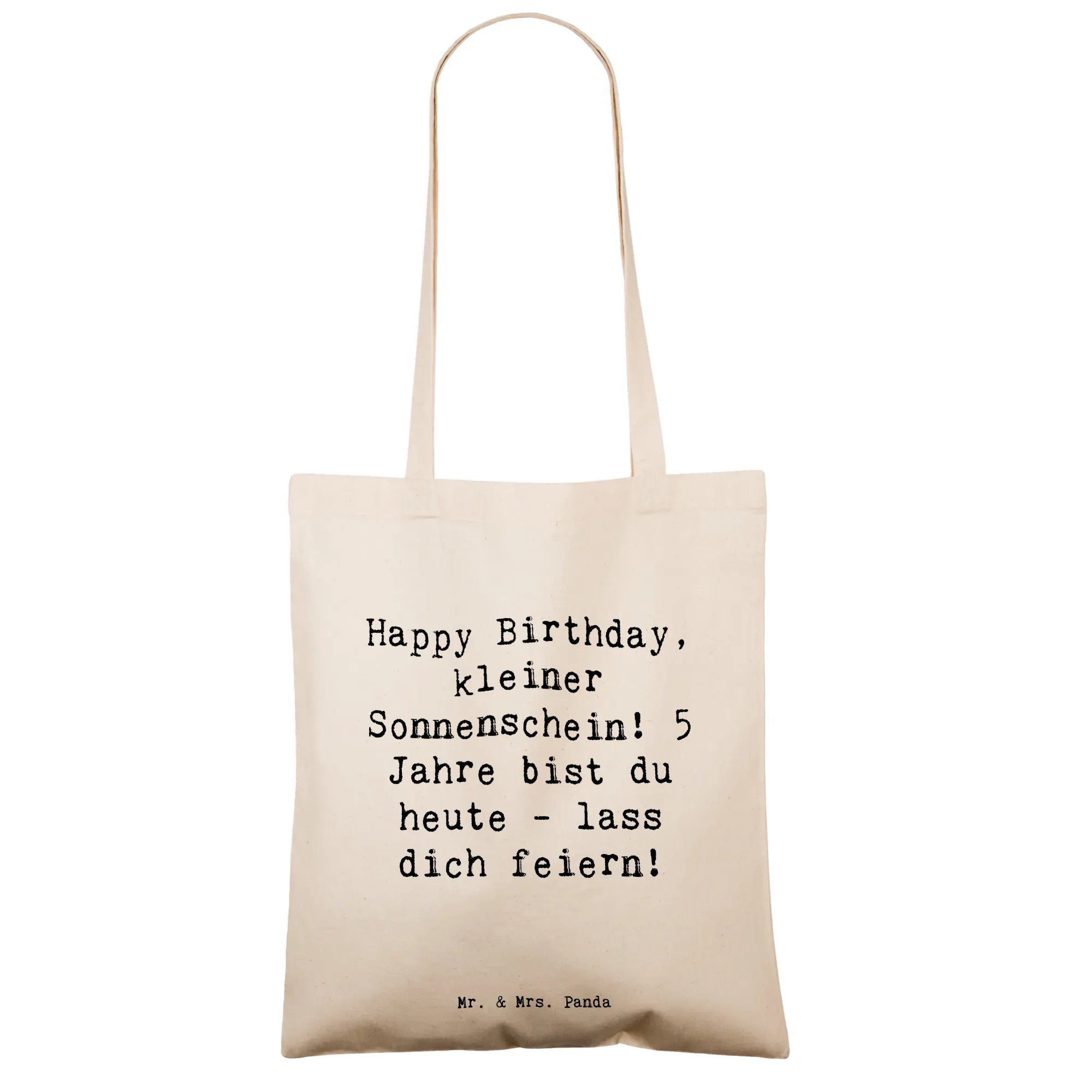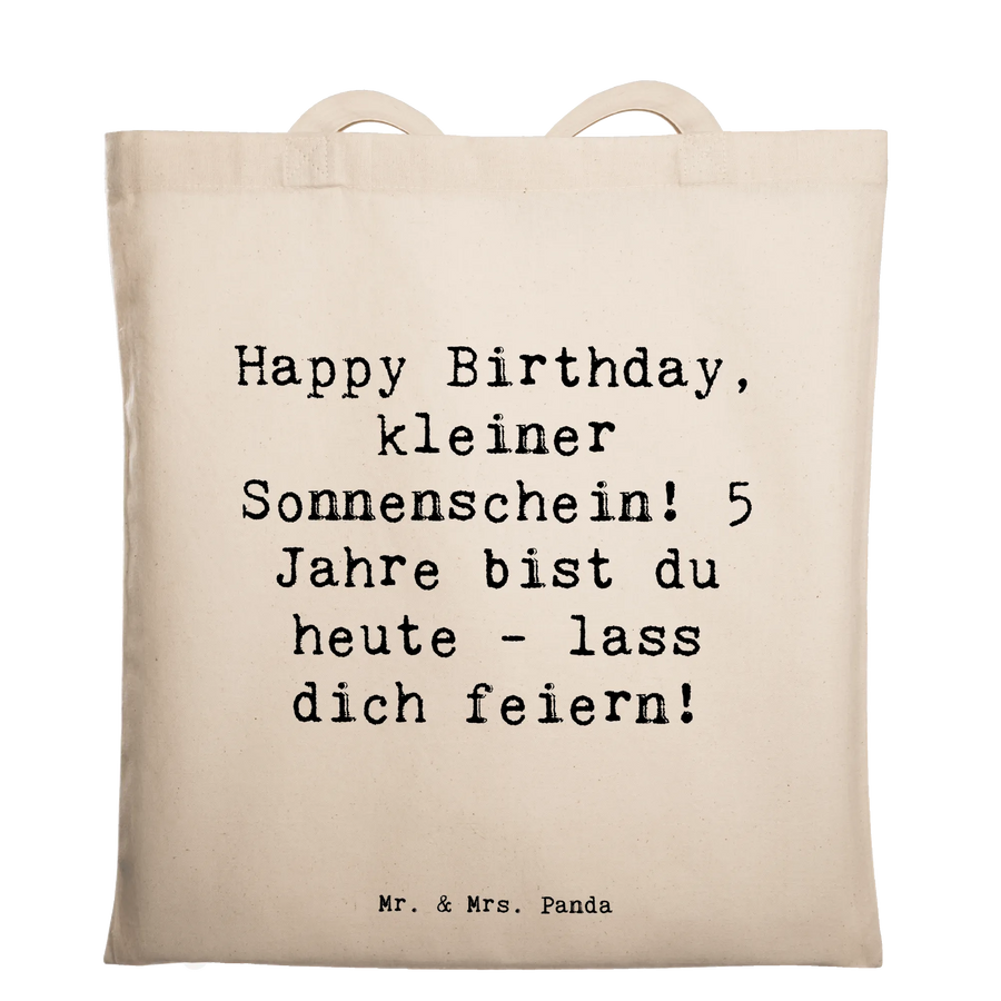 Diese liebevoll gestaltete Tragetasche mit dem Spruch „Happy Birthday, kleiner Sonnenschein! 5 Jahre bist du heute - lass dich feiern!“ ist das ideale Geschenk zum Kindergeburtstag. Das fröhliche Design von Mrs. Panda bringt Sonnenschein in jeden Alltag und macht die Tasche zu einem besonderen Erinnerungsstück.