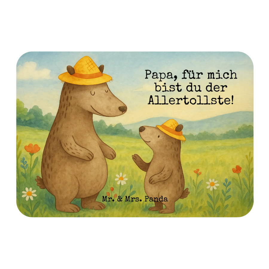 In diesem zauberhaften Bild sehen wir die innige Verbindung zwischen diesem Papa-Bär und seinem kleinen Sohn. Der große Bär mit dem lässigen gelben Hut strahlt Freude und Zuversicht aus, während der kleine Bär ihm bewundernd in die Augen schaut. "Papa, für mich bist du der Allertollste!" ist mehr als nur ein Satz; es ist ein Ausdruck tiefster Verbundenheit und Dankbarkeit. Diese wertvolle Verbindung zeigt uns, dass die kleinen Dinge im Leben, wie ein Lächeln oder eine Umarmung von Papa, unbezahlbar sind. Lass deine Väter wissen, wie v.a. wichtig sie für dich sind, und genieße die kostbare Zeit mit deinen Lieben.