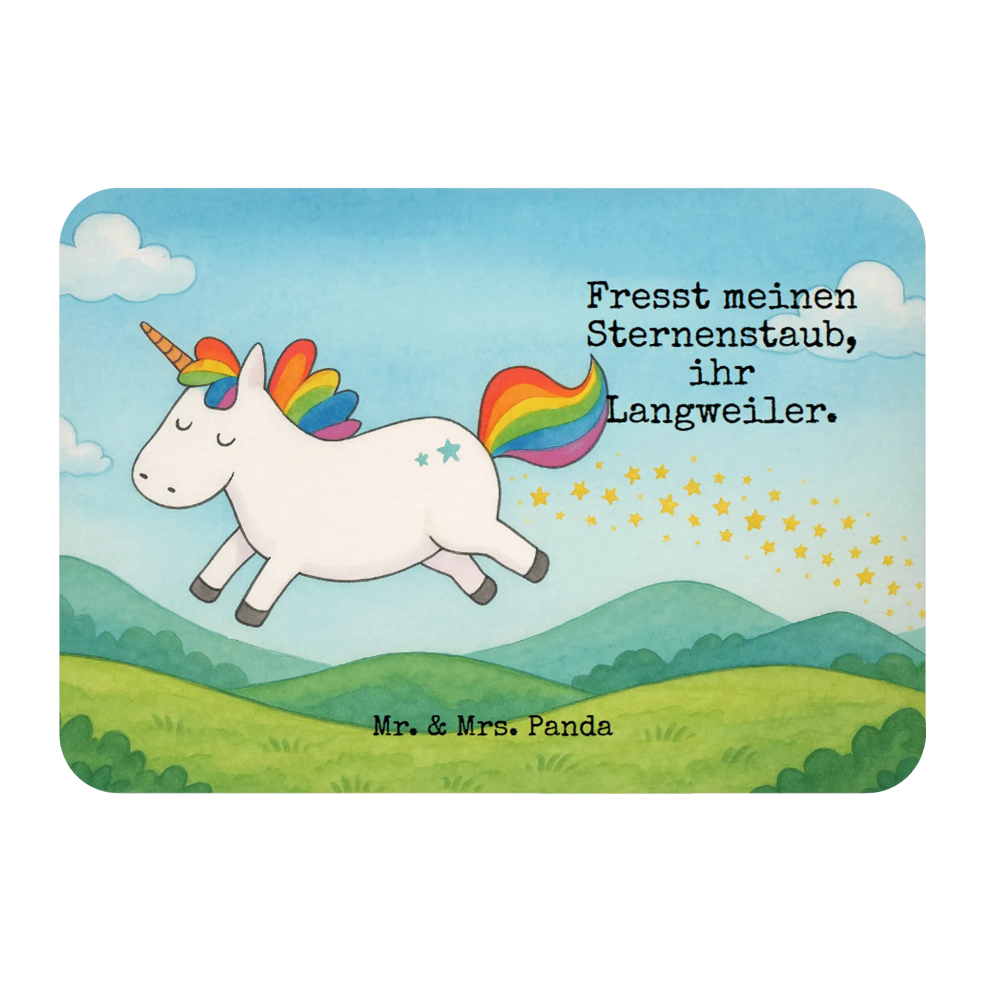 Das fröhliche Einhorn ist das Symbol für Lebensfreude und Spaß, und genau das vermittelt dieses bezaubernde Motiv. Mit einem funkelnden Lächeln und dem witzigen Spruch „Fresst meinen Sternenstaub, ihr Langweiler“ ist es ein Aufruf, die Gedanken auf das Positive zu lenken. Es hat die Kraft, jedem noch so grauen Alltag Farbe und Freude zu verleihen. Dein Herz soll höher schlagen und ein Lächeln auf dein Gesicht zaubern, während du die Lebensfreude des Einhorns spürst. Lass dich anstecken von der Aufregung und entdecke, wie viel Spaß das Leben wirklich machen kann!