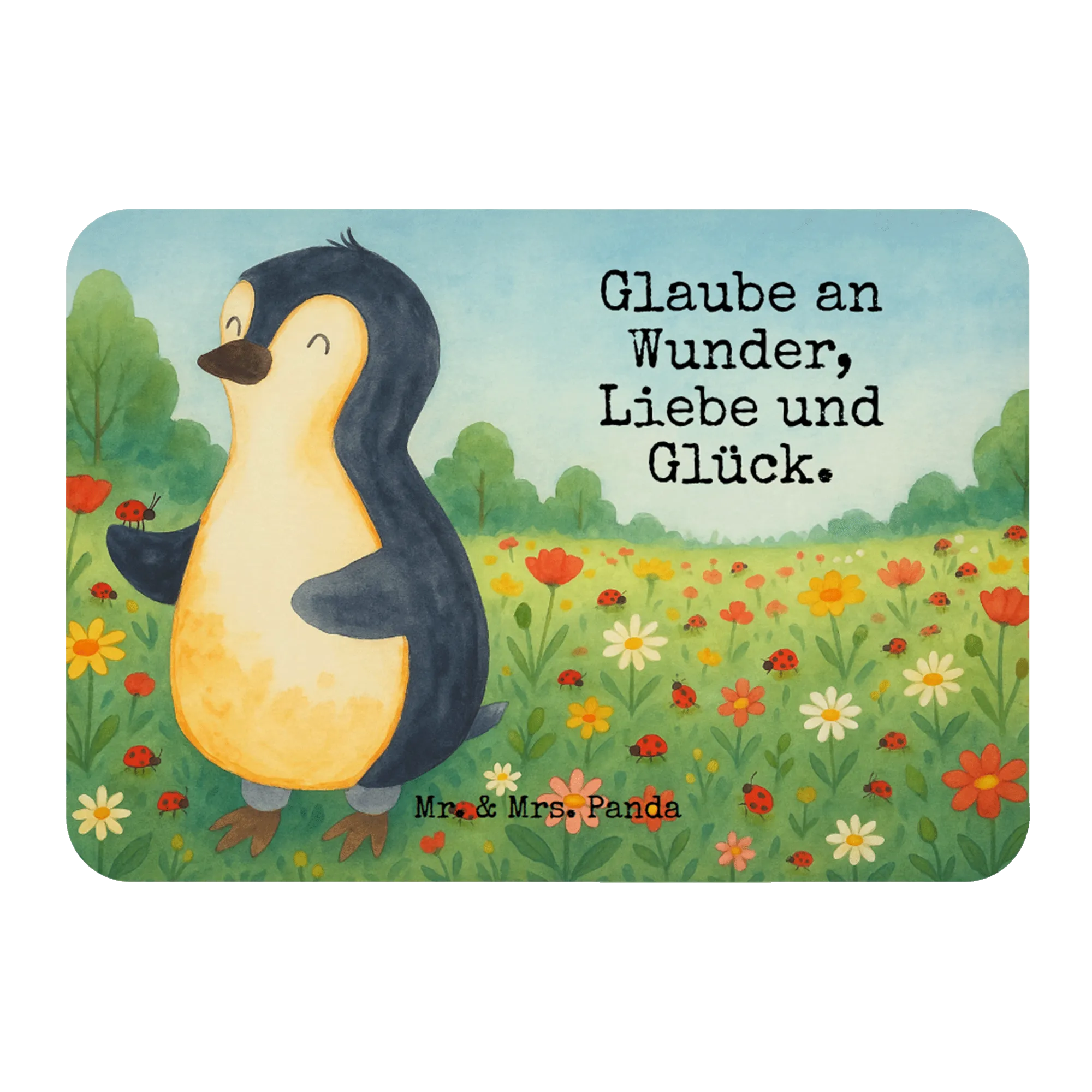 Stellt euch einen Pinguin vor, nicht irgendeinen Pinguin, sondern einen, der mit kindlicher Freude und Staunen einen Marienkäfer auf seiner Flosse betrachtet. Dieses Motiv von Mr. & Mrs. Panda spricht Bände über die Wunder des Lebens, die Liebe, die uns umgibt, und das ungeahnte Glück, das in den kleinsten Dingen verborgen liegt. Der liebevolle Blick des Pinguins auf den Marienkäfer symbolisiert, wie wichtig es ist, die Welt um uns herum zu schätzen und die kleinen Freuden, die jeden Tag zu etwas Besonderem machen, zu erkennen. 'Glaube an Wunder, Liebe und Glück', ist nicht nur ein Spruch; es ist eine Einladung, mit offenen Augen durch die Welt zu gehen und die Schönheiten zu bemerken, die uns täglich begegnen.