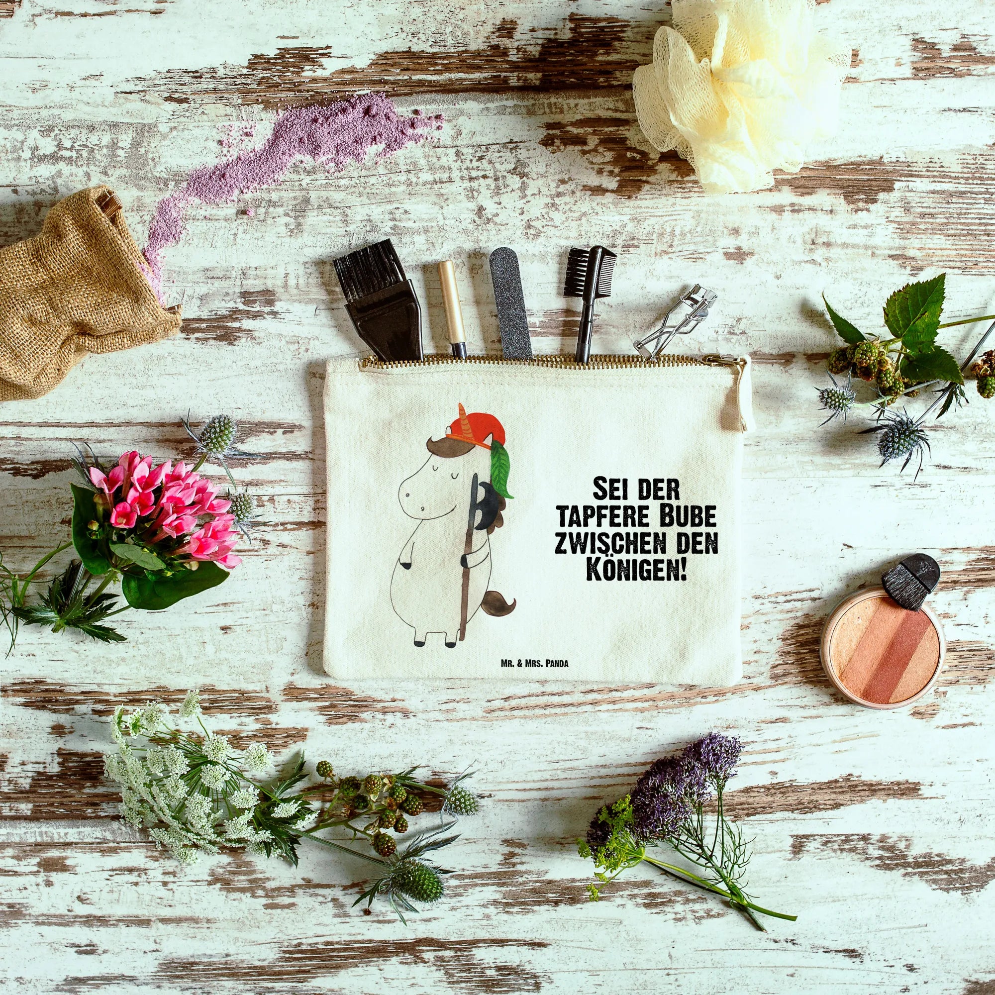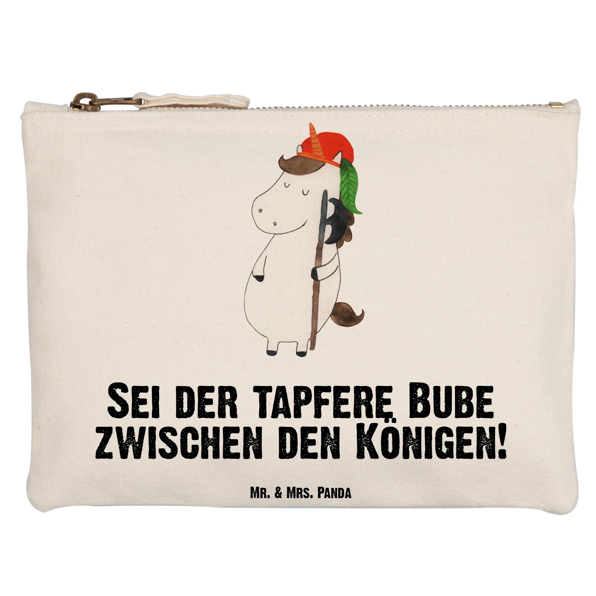 Suchst du ein zauberhaftes Schminktäschchen mit Herz? Die Schminktasche „Einhorn Bube" aus der Einhorn - Kollektion von Mr. & Mrs. Panda verbindet Funktionalität mit liebevoller Illustration. Das handgezeichnete Einhorn in Bubenrolle, mit Helm und Stock, bringt einen verspielten Mittelalter-Touch in deinen Alltag und ist perfekt für Einhorn-Fans jeden Alters.