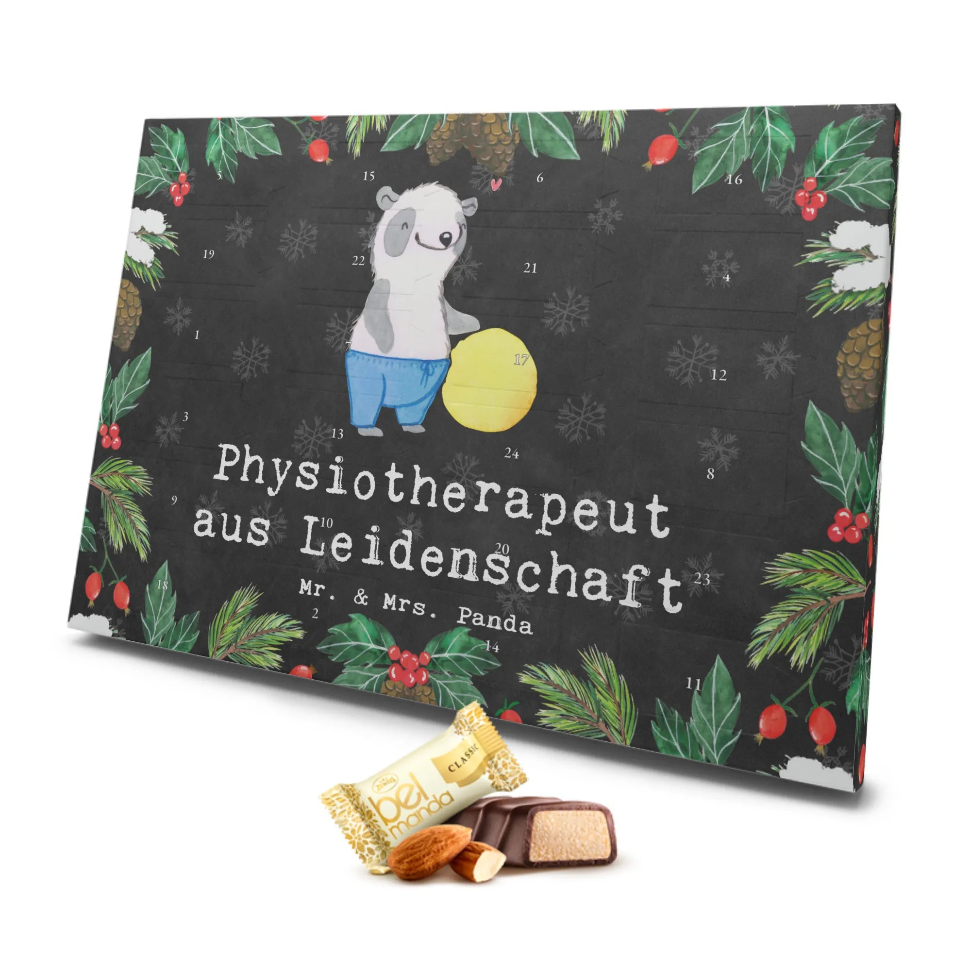 Der wunderschöne Marzipan Adventskalender "Physiotherapeut aus Leidenschaft" von Mr. & Mrs. Panda ist das perfekte Geschenk für Physiotherapeuten und Physiotherapeutinnen! Handgezeichnet von Mrs. Panda, bringt dieses liebevolle Motiv einen niedlichen Panda mit einem Gymnastikball in der Hand und einer Jogginghose.