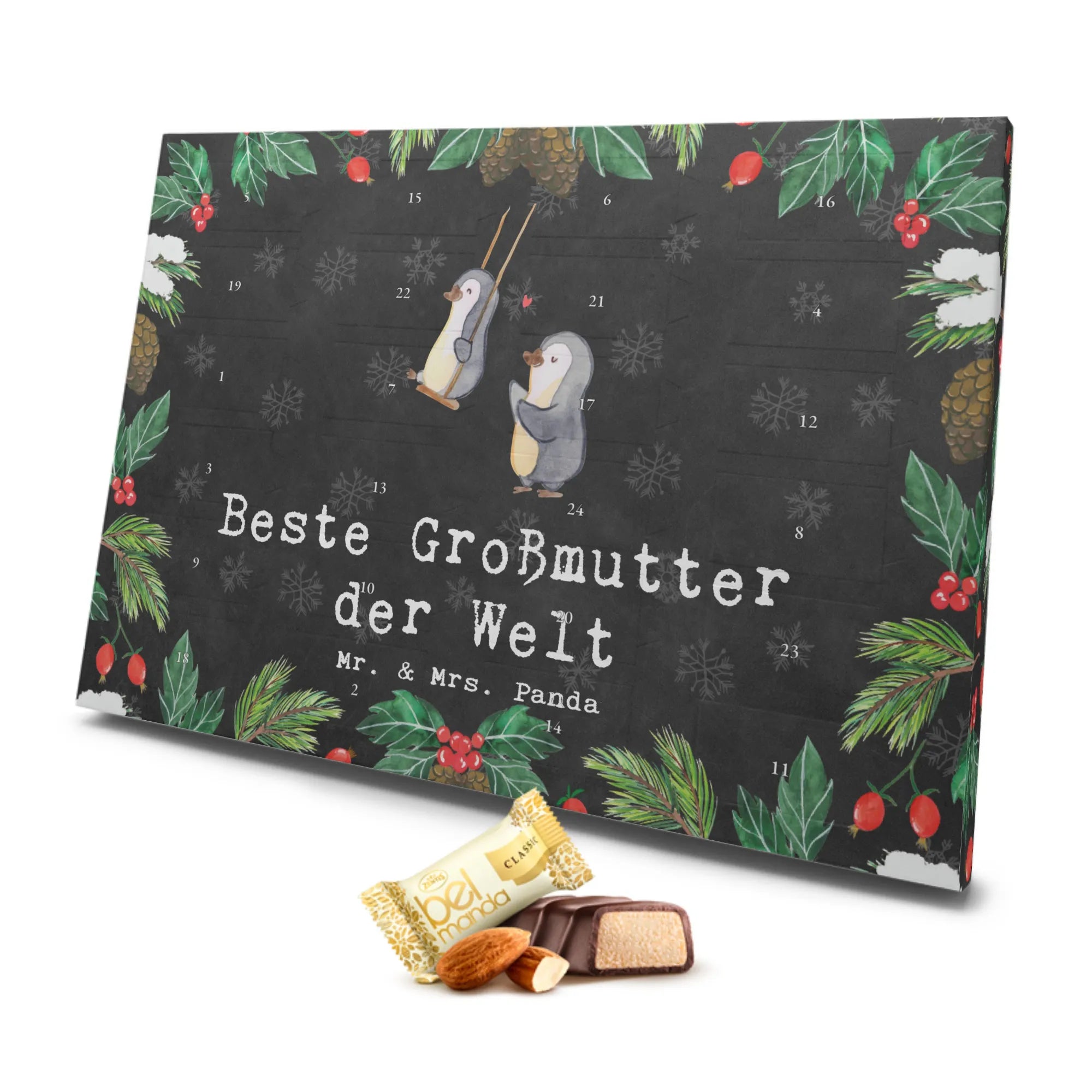 Der Marzipan Adventskalender mit dem süßen Pinguin-Motiv "Beste Großmutter der Welt" von Mr. & Mrs. Panda ist das perfekte Geschenk für deine geliebte Omi. Jeder von uns weiß, dass Großmütter einen ganz besonderen Platz in unseren Herzen haben, und dieser Adventskalender bringt ihre Freude auf ein neues Level! Er ist nicht nur mit köstlichem Edelmarzipan gefüllt, sondern auch mit einer liebevollen Botschaft, die sagt: "Beste Großmutter der Welt".