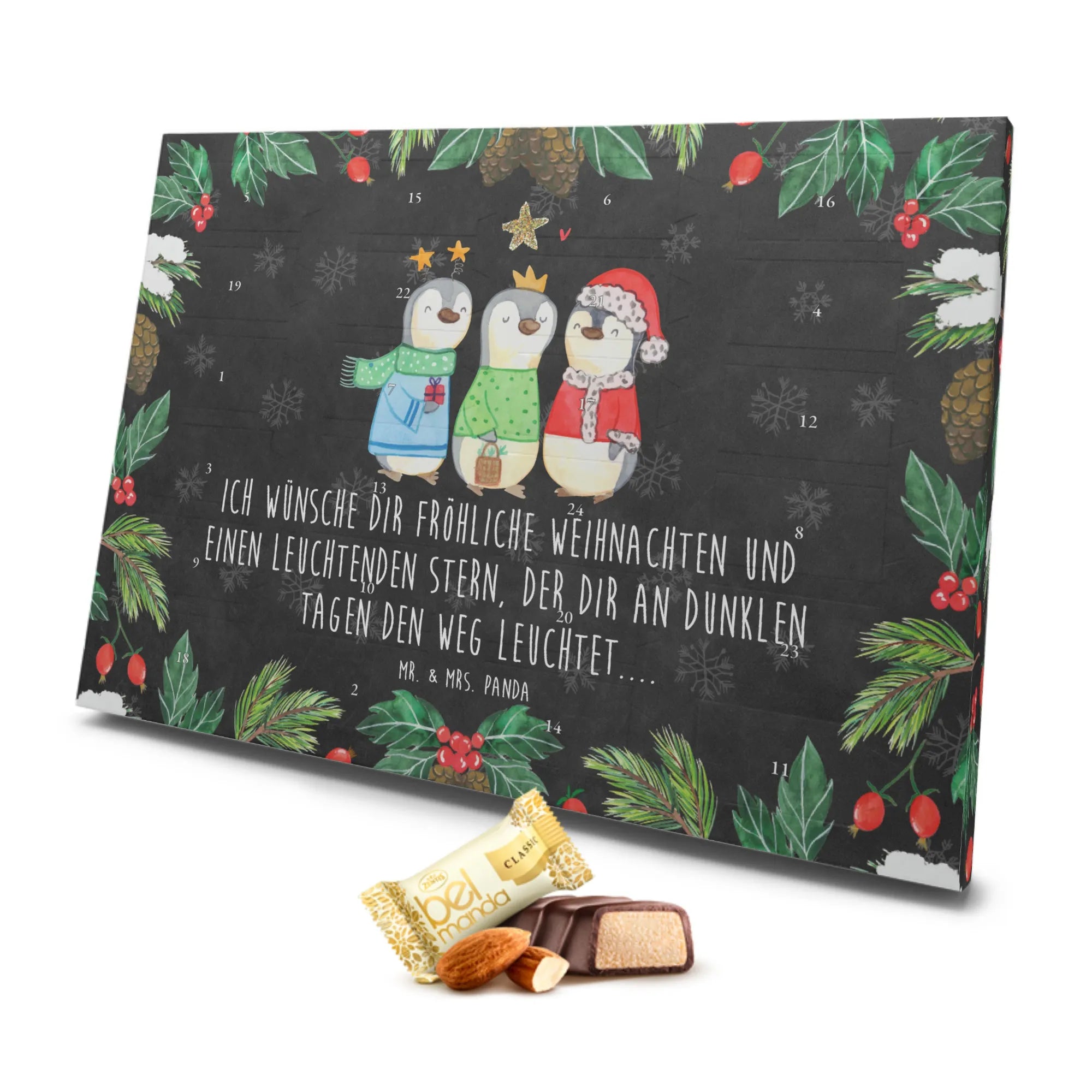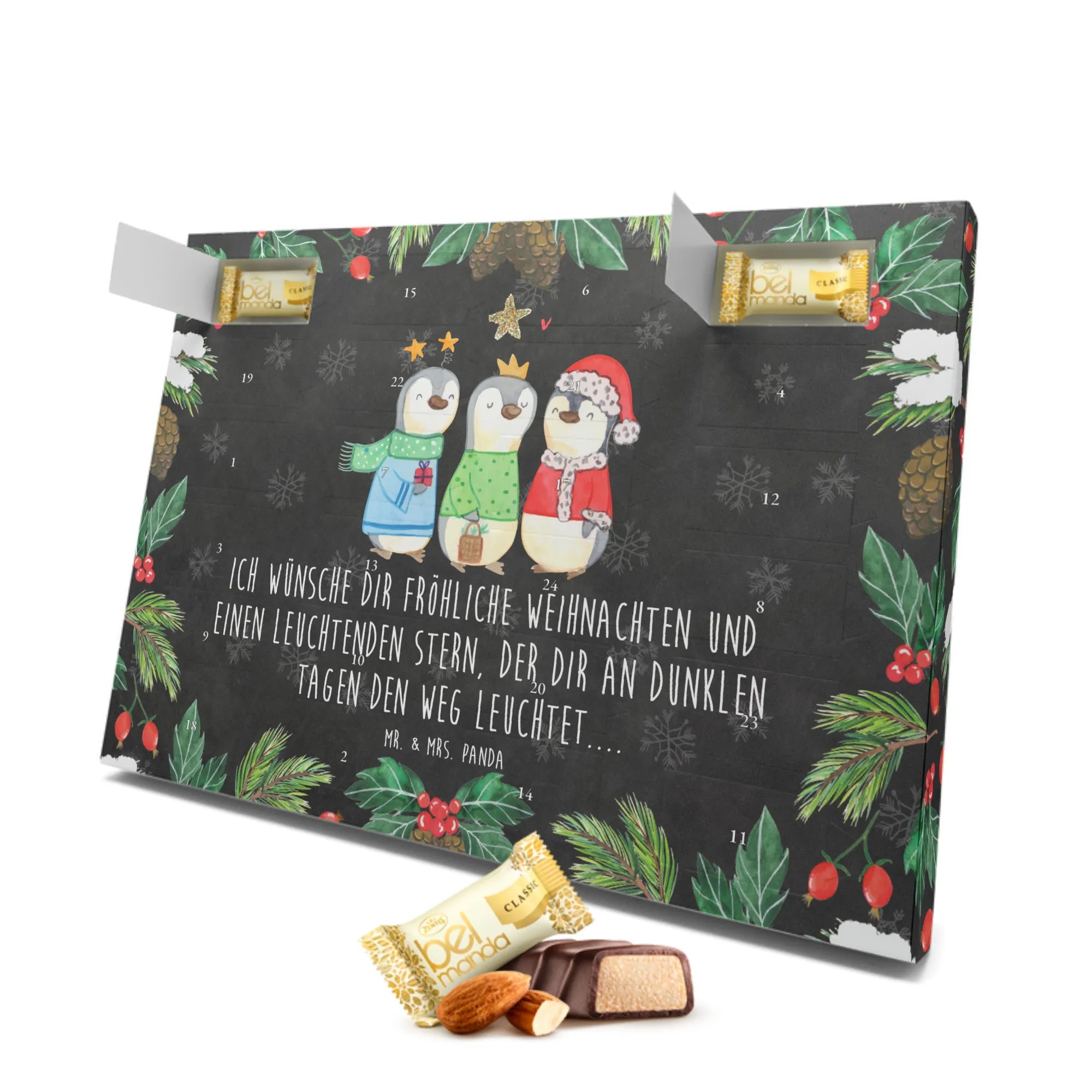 Er ist befüllt mit 24 exquisit einzeln verpackten Edelmarzipan Pralinés, die nicht nur köstlich sind, sondern auch zu einem zauberhaften Erlebnis in der Vorweihnachtszeit beitragen. Die verschiedenen Motive von Mr. & Mrs. Panda, darunter die fröhlichen Pinguine, die sich wie die Heiligen Drei Könige verkleiden, zaubern ein Lächeln auf jedes Gesicht.