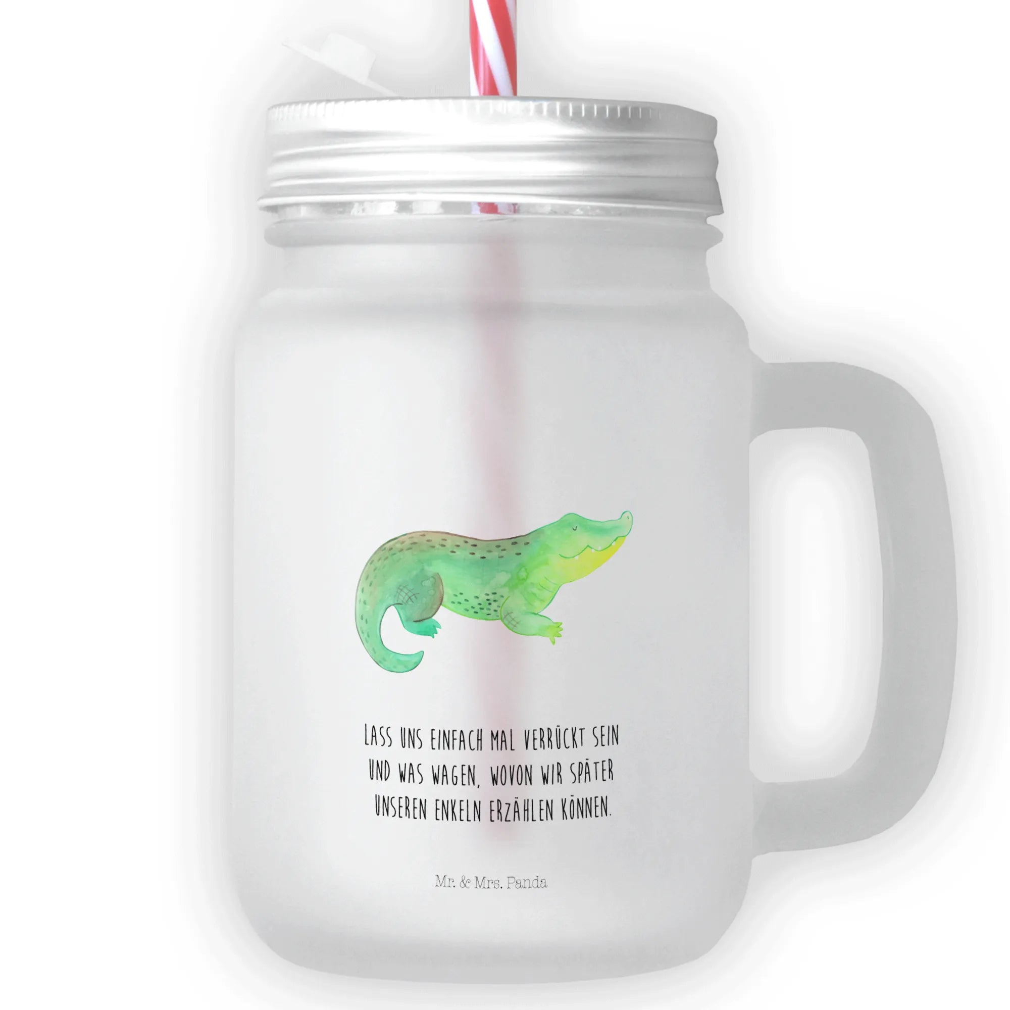 Introducing the delightful Mason Jar Drinking Glass with a charming crocodile motif from the enchanting Mr. & Mrs. Panda collection! This special glass is not just any ordinary drinking jar; it embodies a sense of adventure and spontaneity with its friendly crocodile design, perfect for those who love to embrace life with a touch of fun.