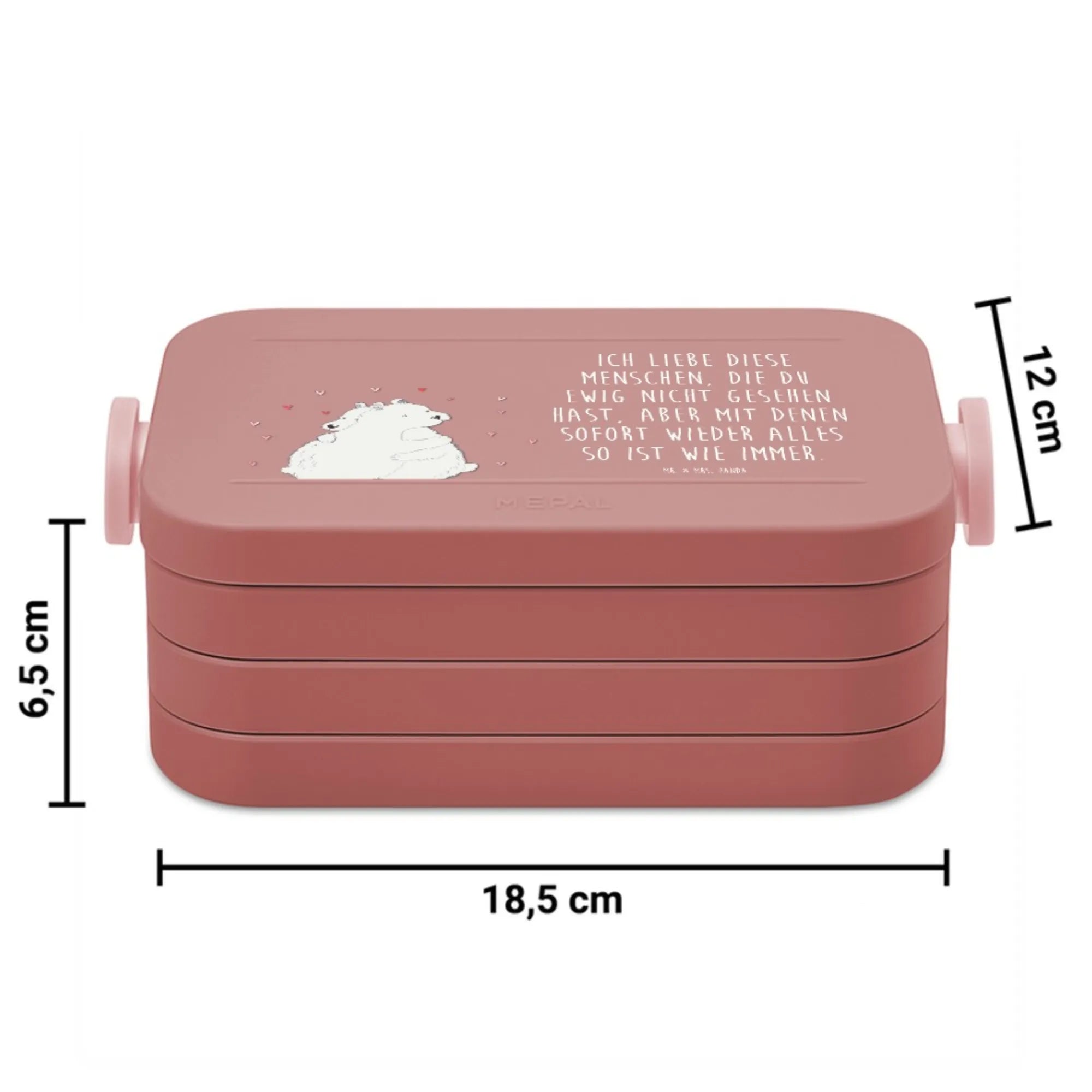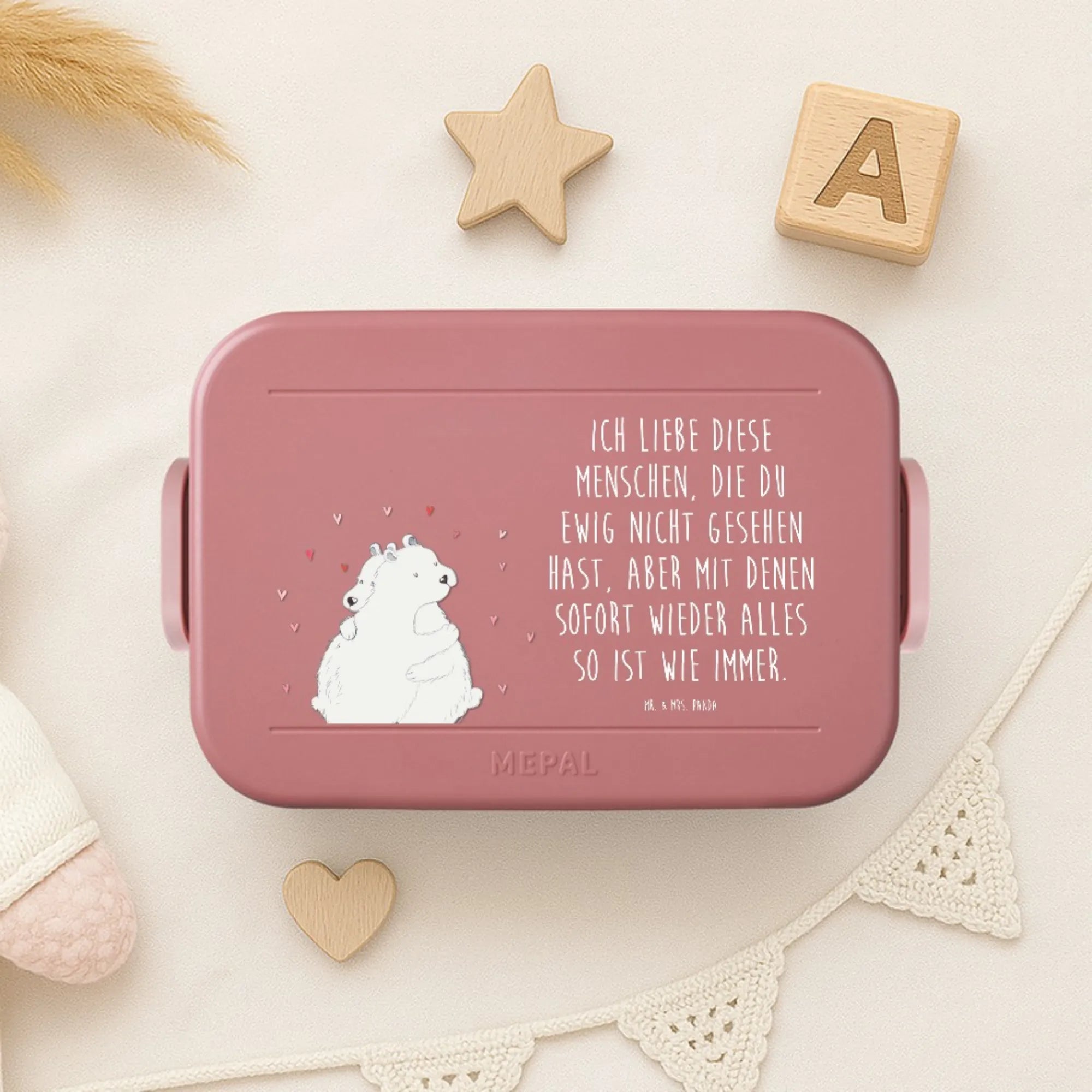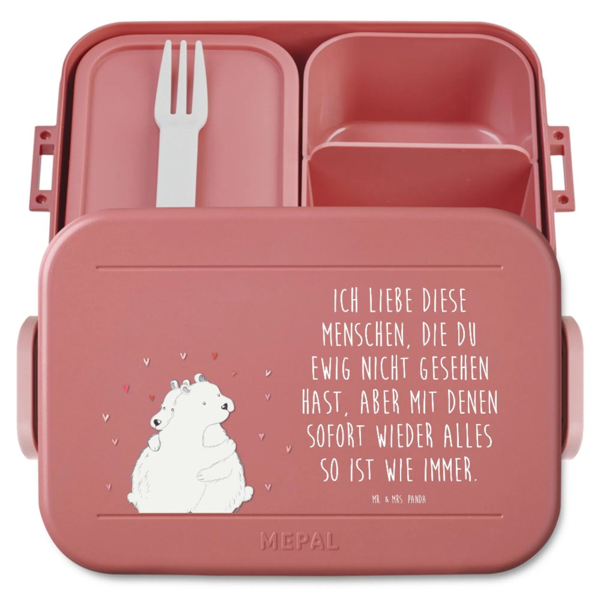 Die liebevoll illustrierte Bento-Brotdose aus der Small World Kollektion von Mr. & Mrs. Panda bringt dir jeden Tag ein Lächeln. Das Motiv zeigt zwei verliebte Eisbären, die sich innig umarmen. Der zarte Spruch „Ich liebe diese Menschen, die du ewig nicht gesehen hast, Aber mit denen sofort wieder alles so ist wie immer.“ macht die Dose zur perfekten Botschaft für Freunde, Familie oder den Lieblingsmenschen.