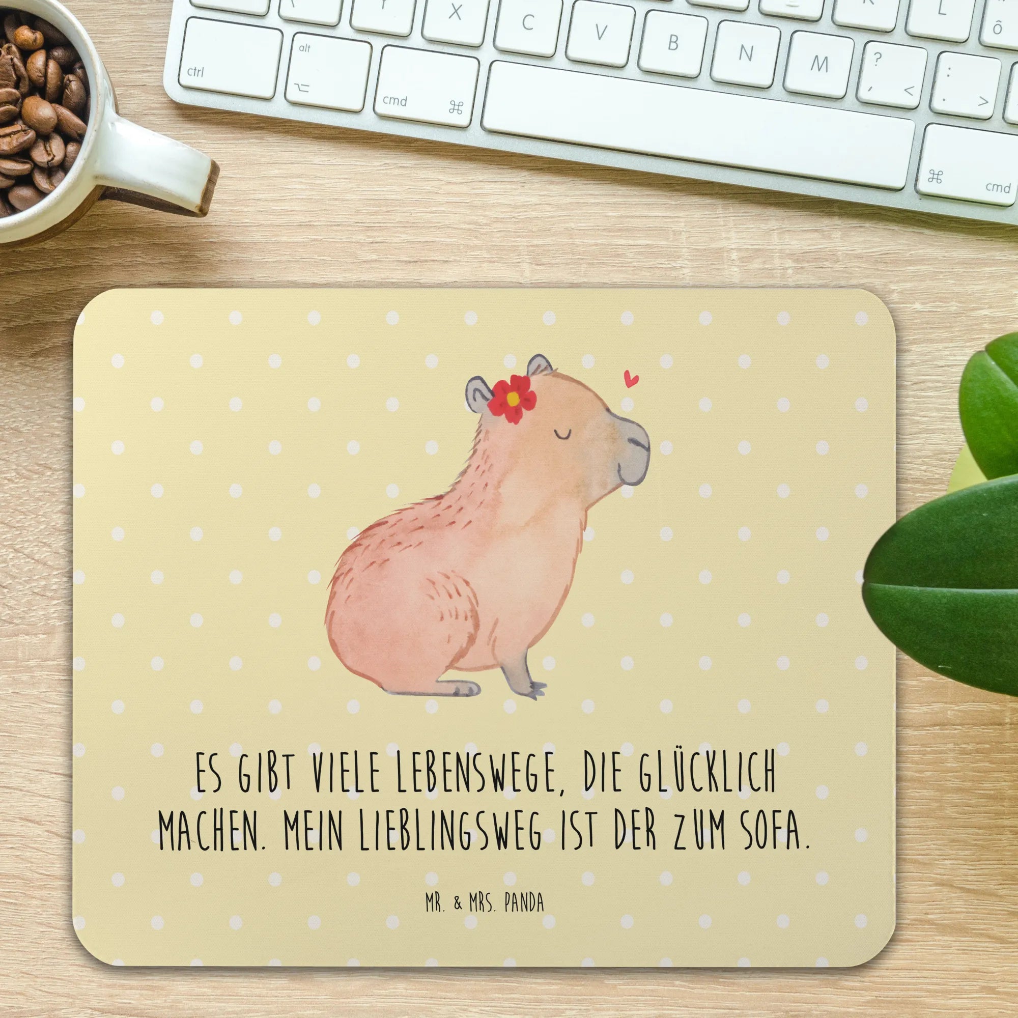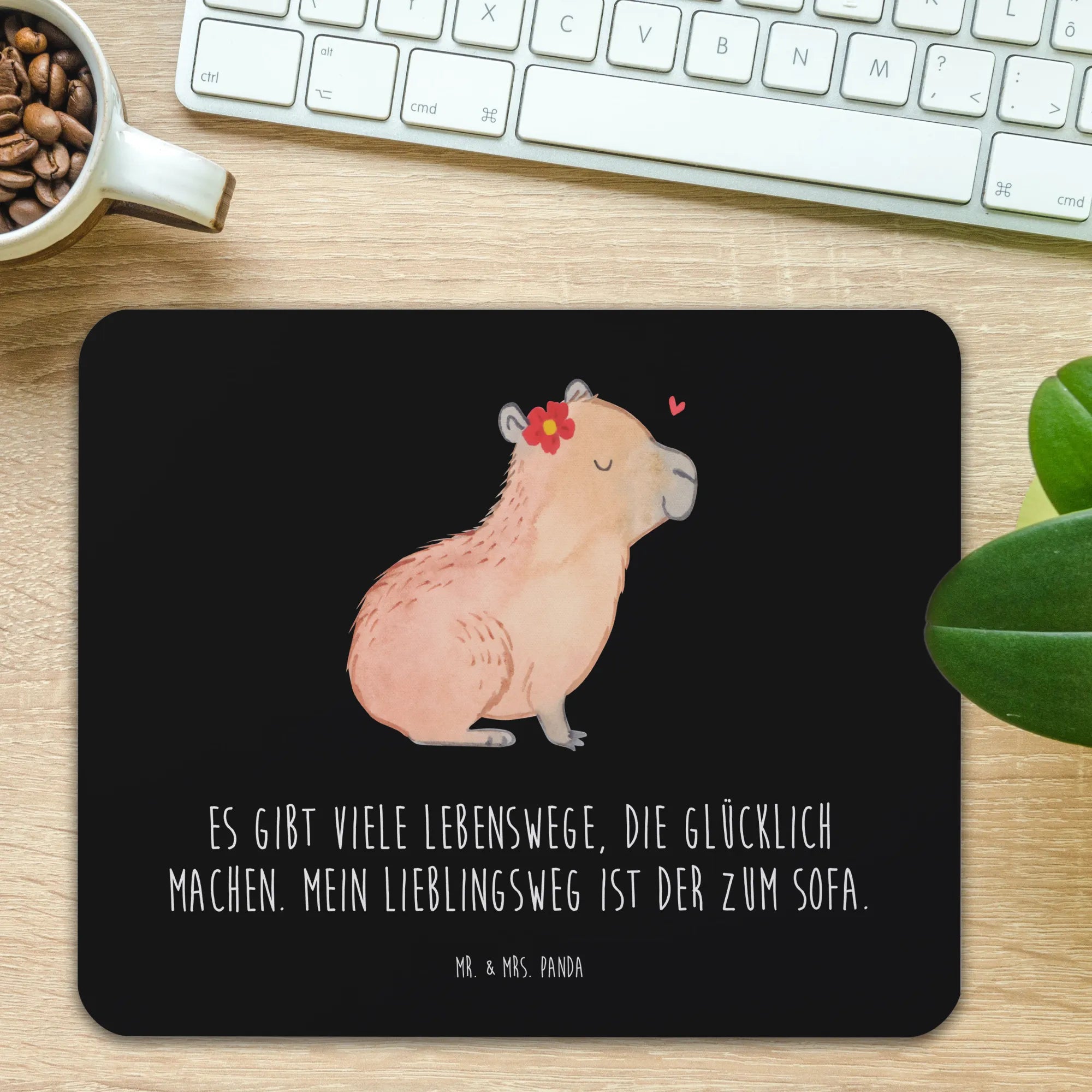 Allow us to present the charming Capybara Flower! The relaxed capybara, eyes closed and smiling, is gracefully adorned with a vibrant red flower featuring a cheerful yellow center. Above it, a floating heart showcases the love and warmth of life’s little moments. This motif is a picturesque representation of our belief that Es gibt viele Lebenswege, die glücklich machen. Mein Lieblingsweg ist der zum Sofa. So let’s celebrate the joy of pure stillness and gentle happiness in our everyday lives!